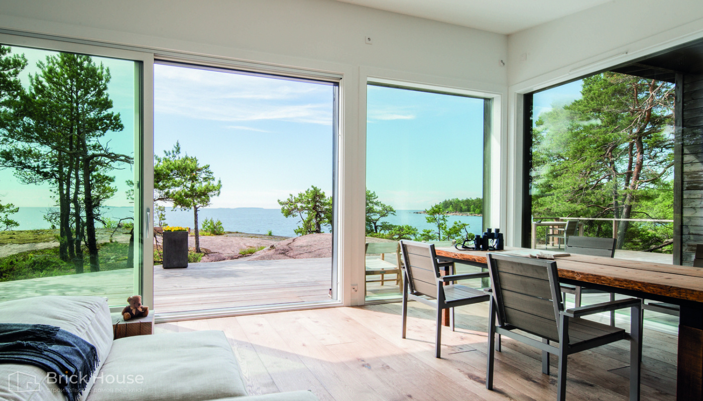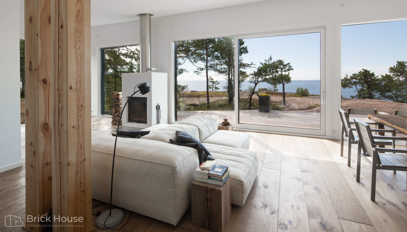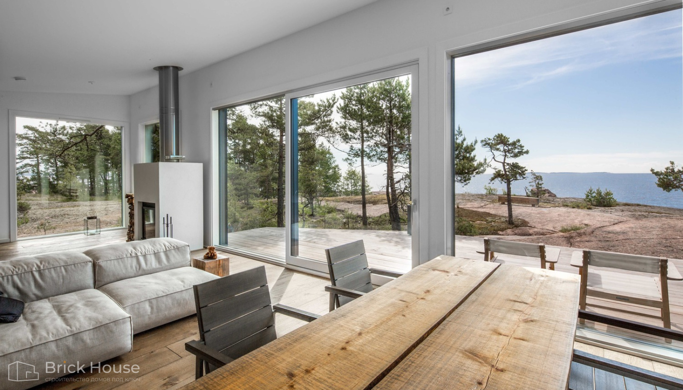 • Панорамные окна позволяют максимально использовать естественное освещение в доме. Они создают светлое и просторное ощущение внутри помещений, позволяют проникать большому количеству дневного света и снижают зависимость от искусственного освещения. Это помогает создать более комфортную и приятную атмосферу