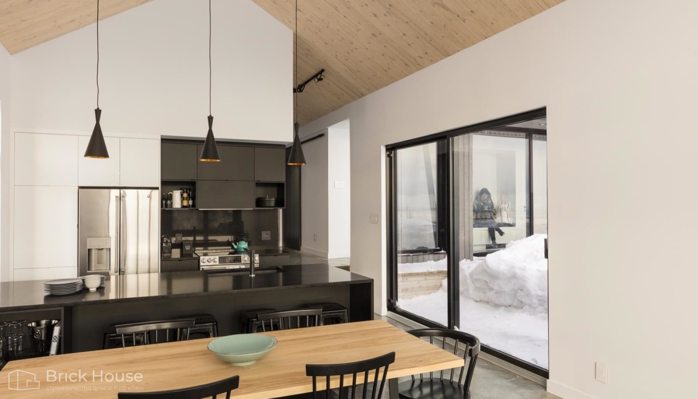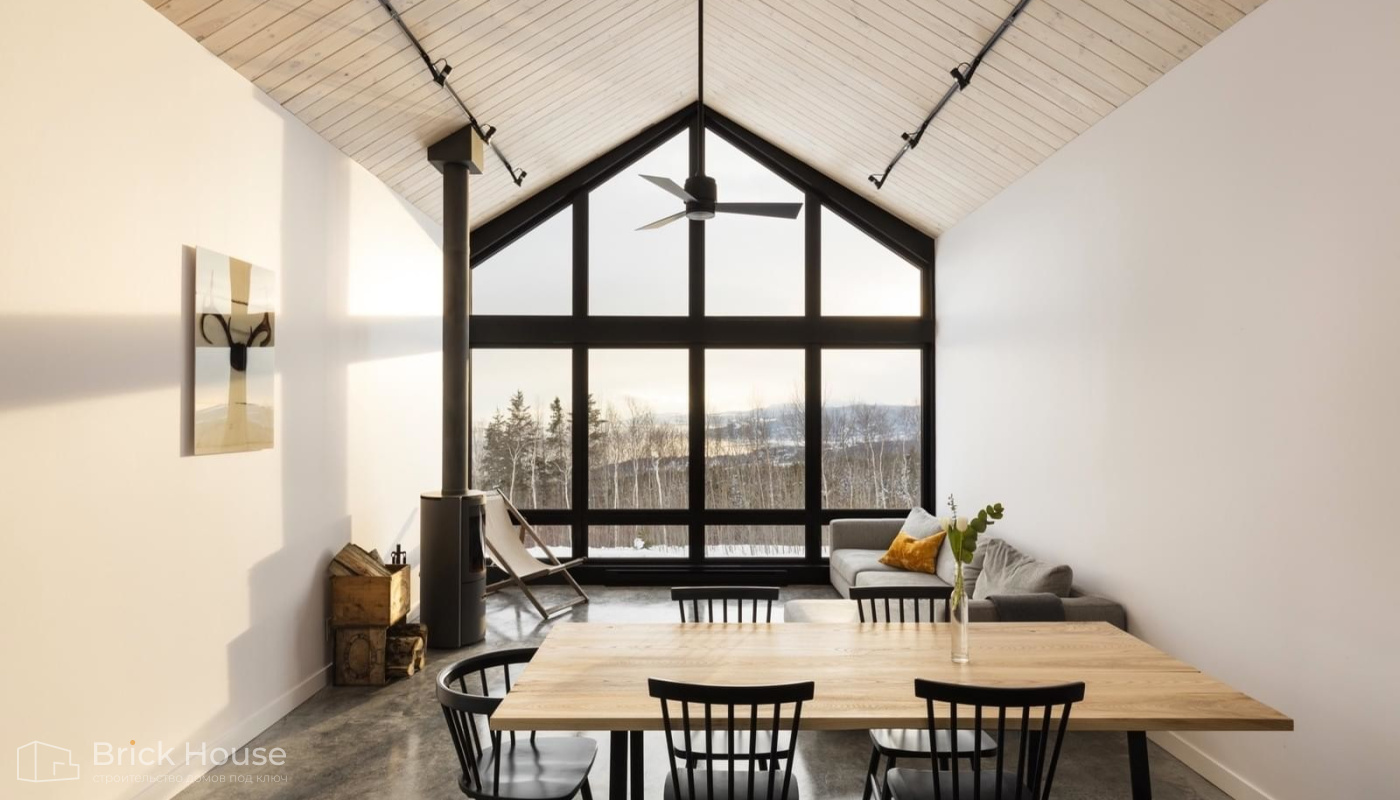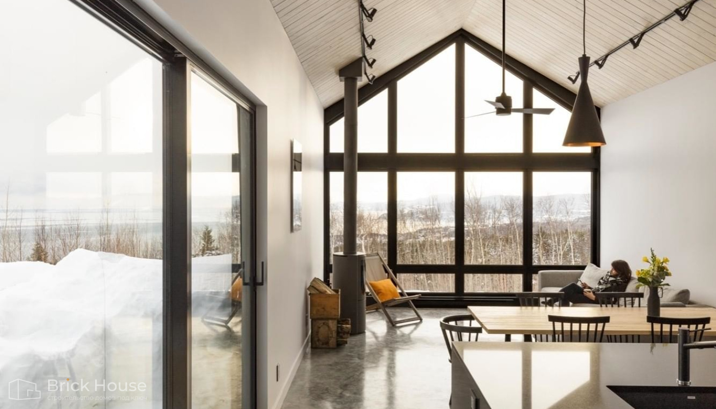 • Панорамные окна позволяют максимально использовать естественное освещение в доме. Они создают светлое и просторное ощущение внутри помещений, позволяют проникать большому количеству дневного света и снижают зависимость от искусственного освещения. Это помогает создать более комфортную и приятную атмосферу