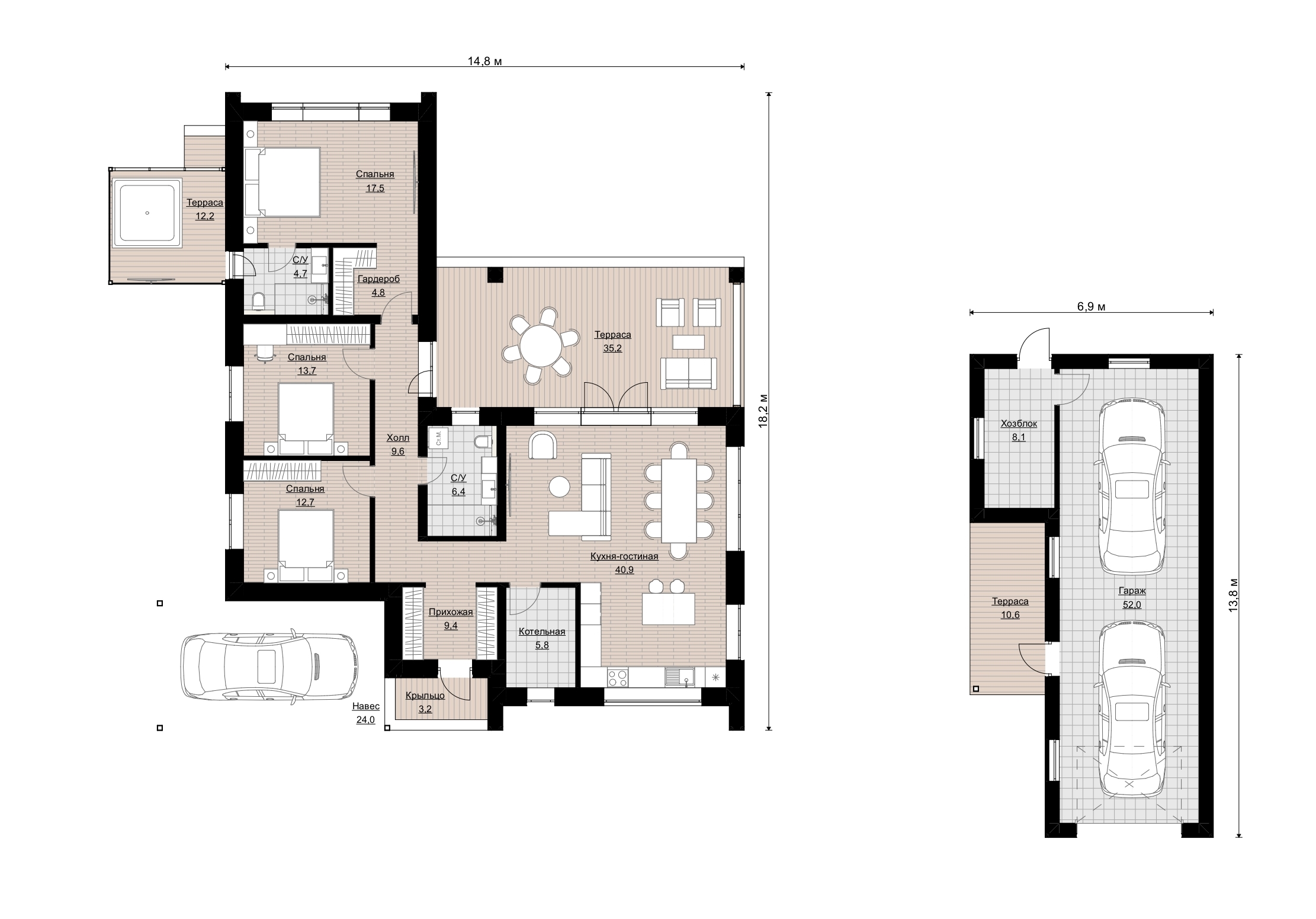 Размеры дома составляют 18,2 на 14,8 метров.