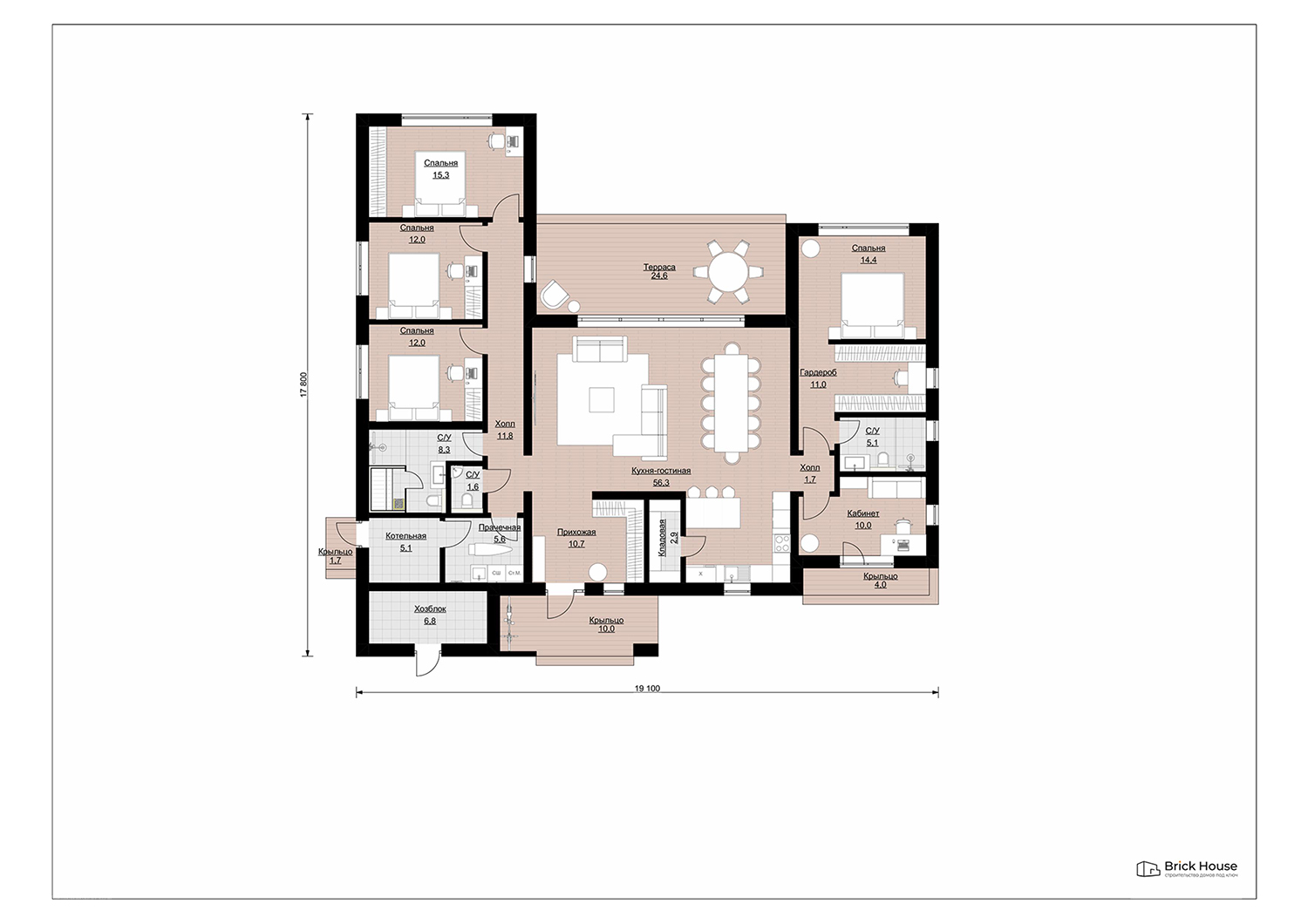 Дома площадью от 100 метров подходят для небольших семей. В их планировках есть все необходимые помещения для комфортного проживания — гостиная, кухня и несколько спален.