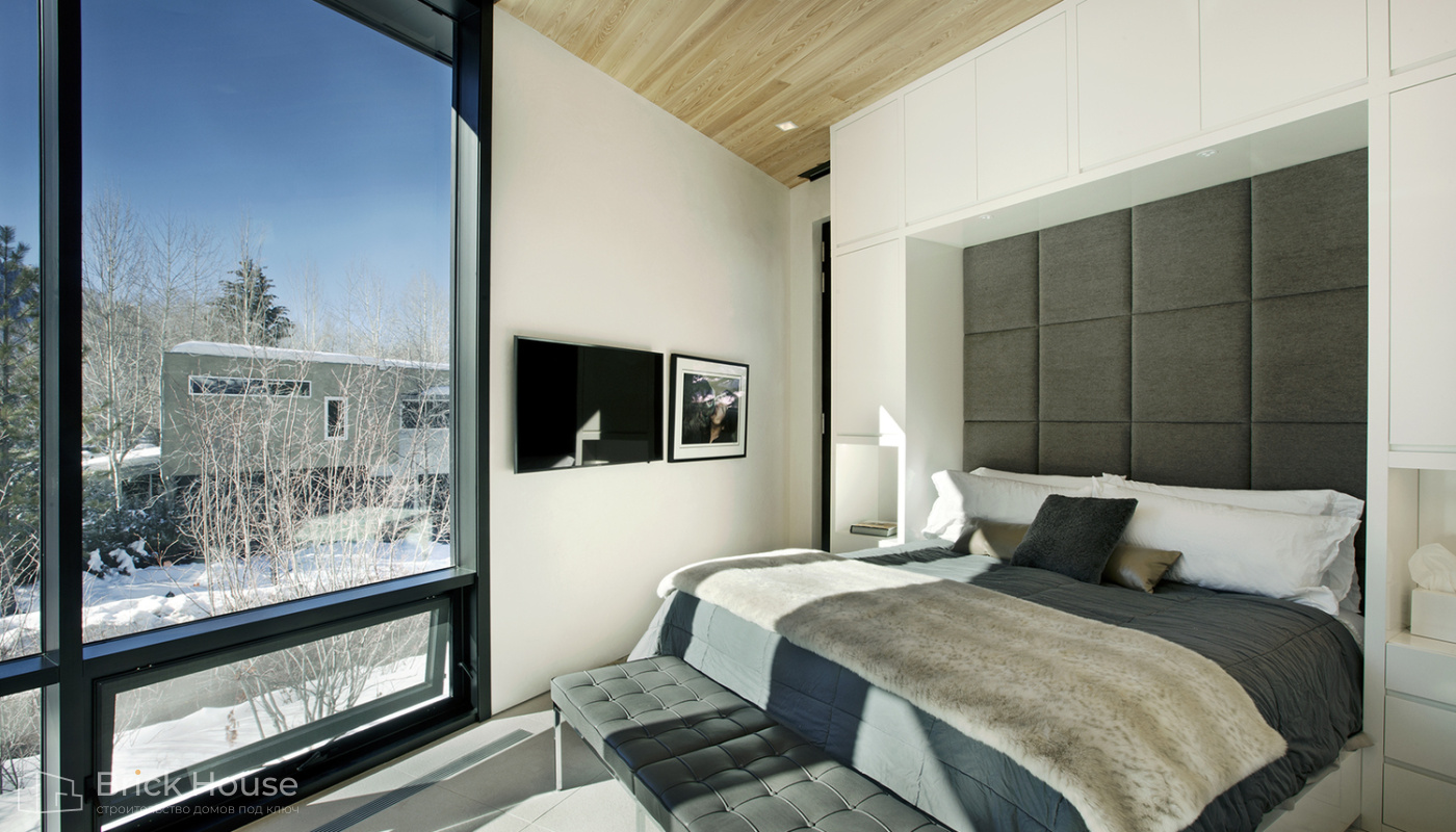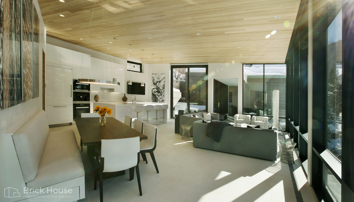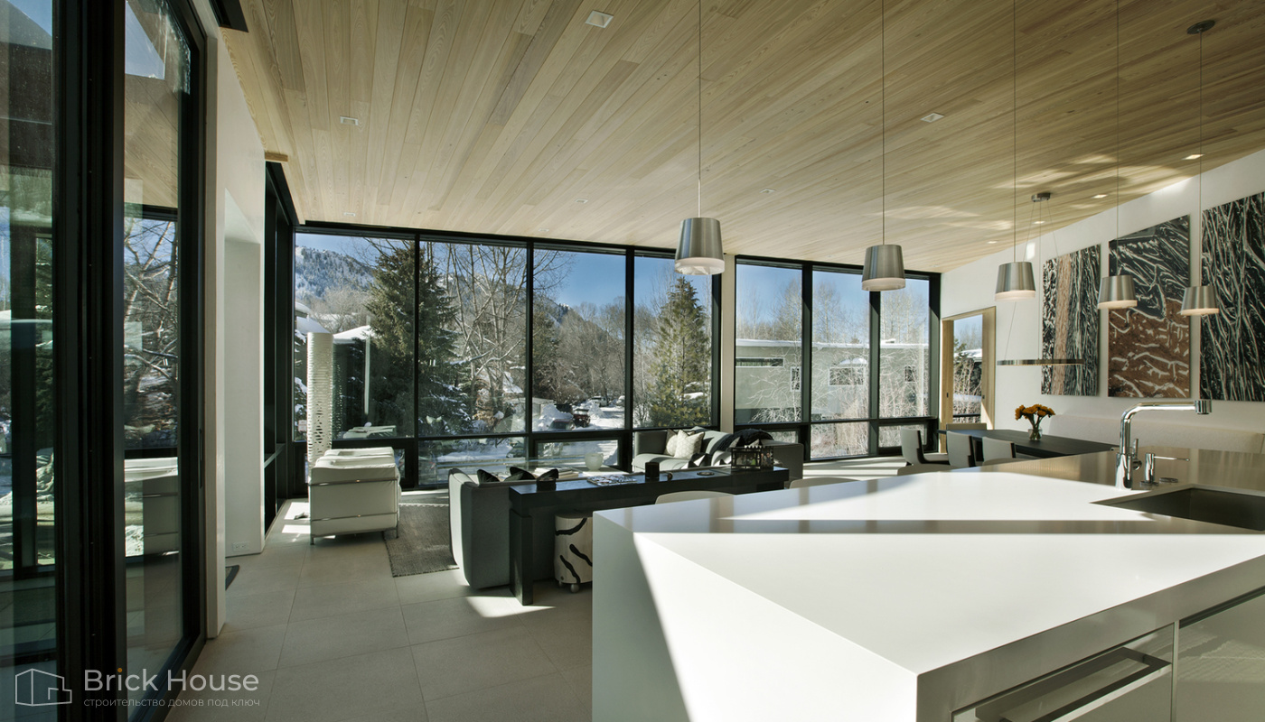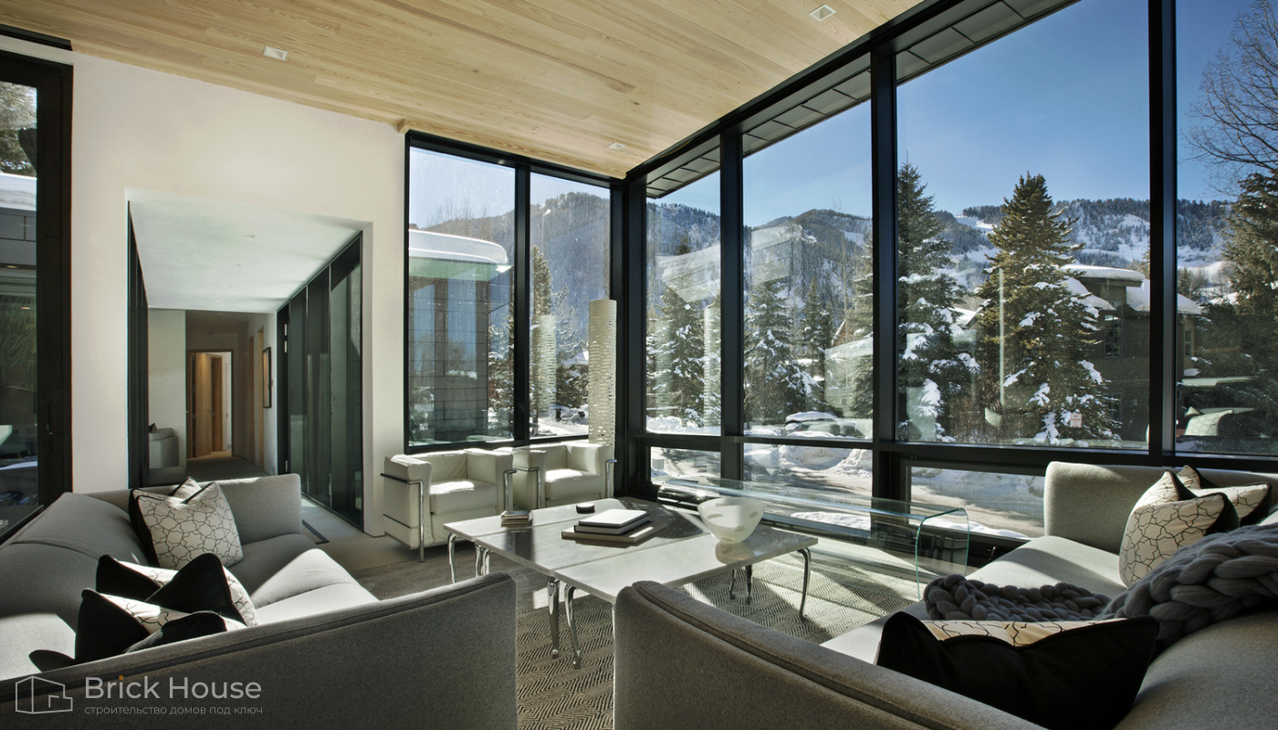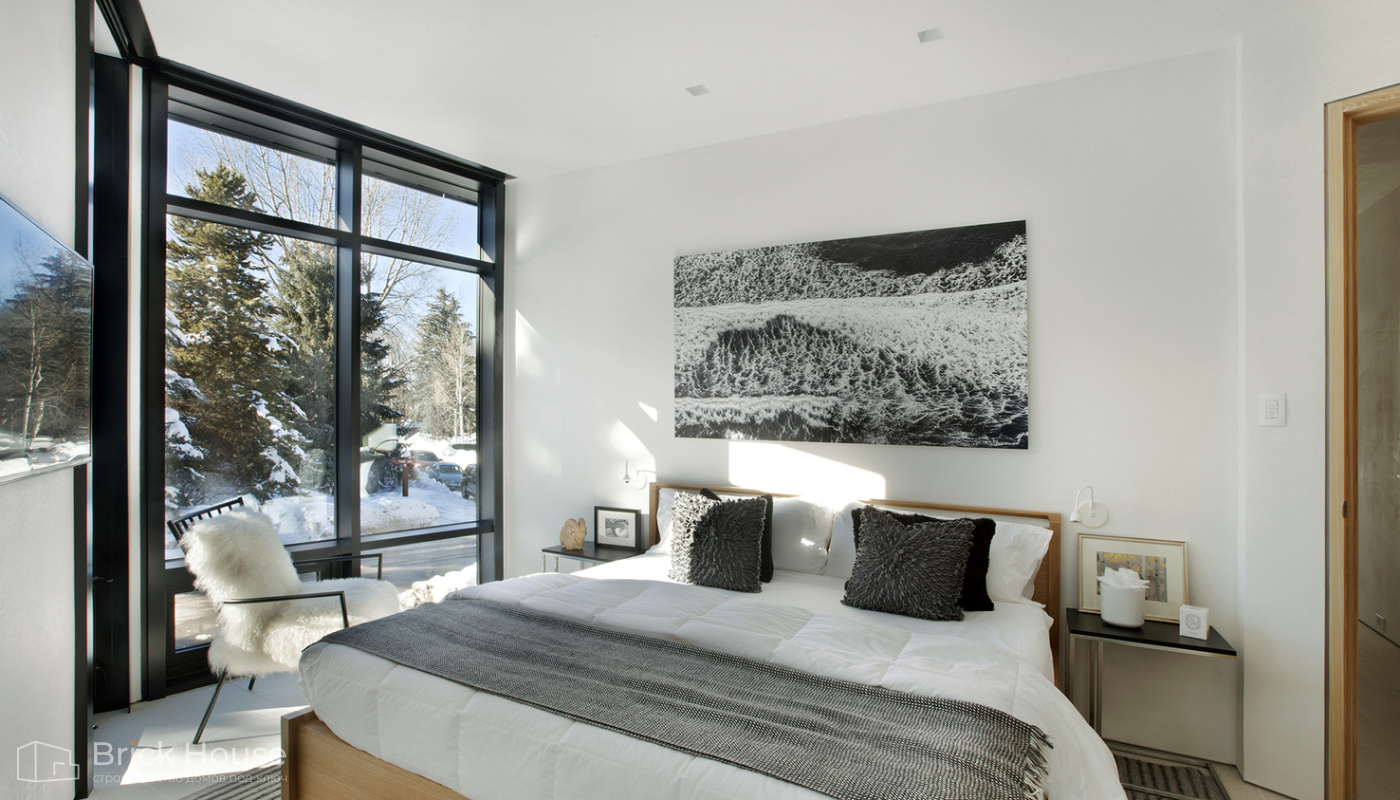• Панорамные окна позволяют максимально использовать естественное освещение в доме. Они создают светлое и просторное ощущение внутри помещений, позволяют проникать большому количеству дневного света и снижают зависимость от искусственного освещения. Это помогает создать более комфортную и приятную атмосферу