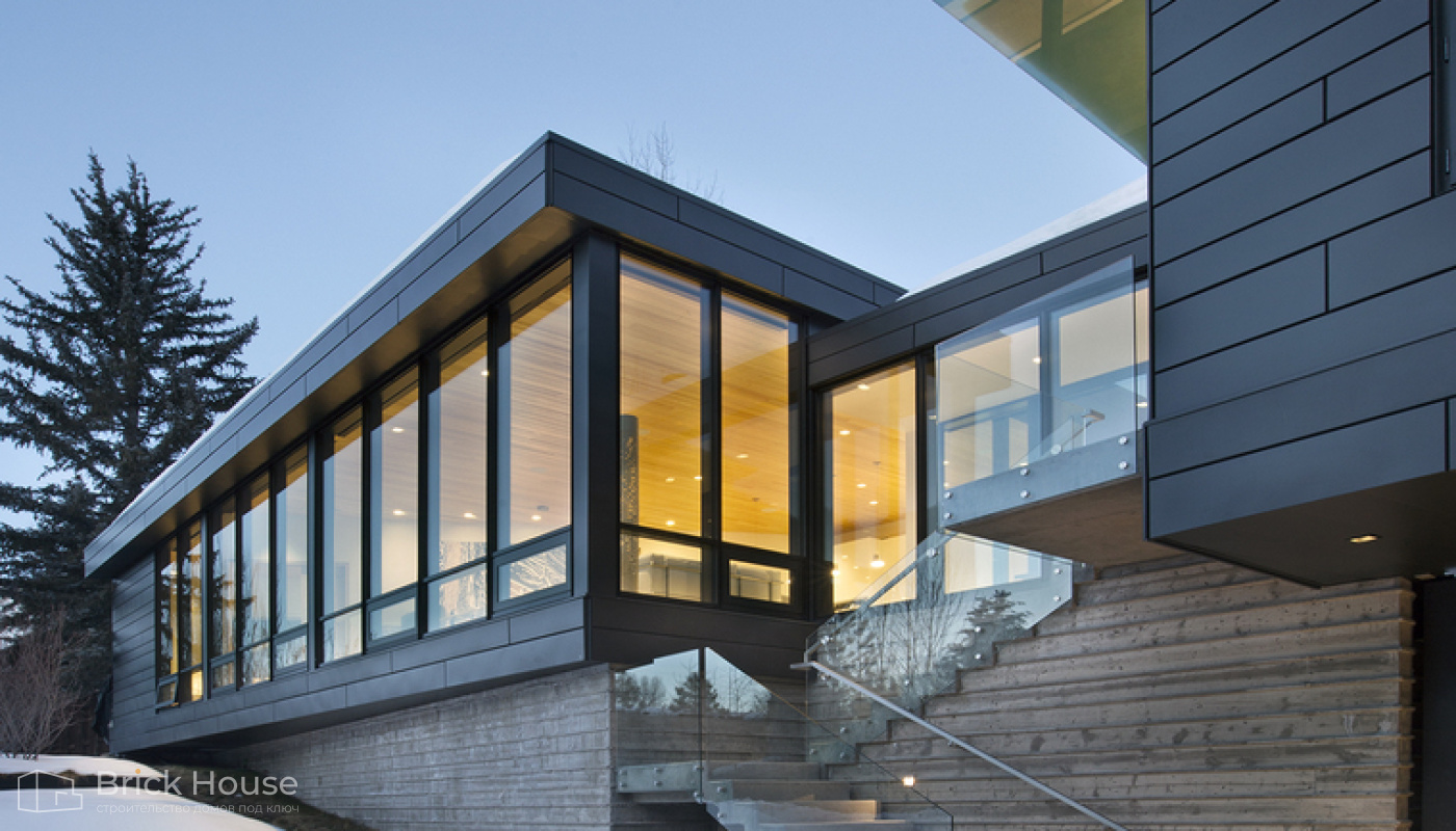 • Дома с плоской крышей характерны для стиля хай-тек. Эксплуатируемую плоскую кровлю можно использовать как террасу
