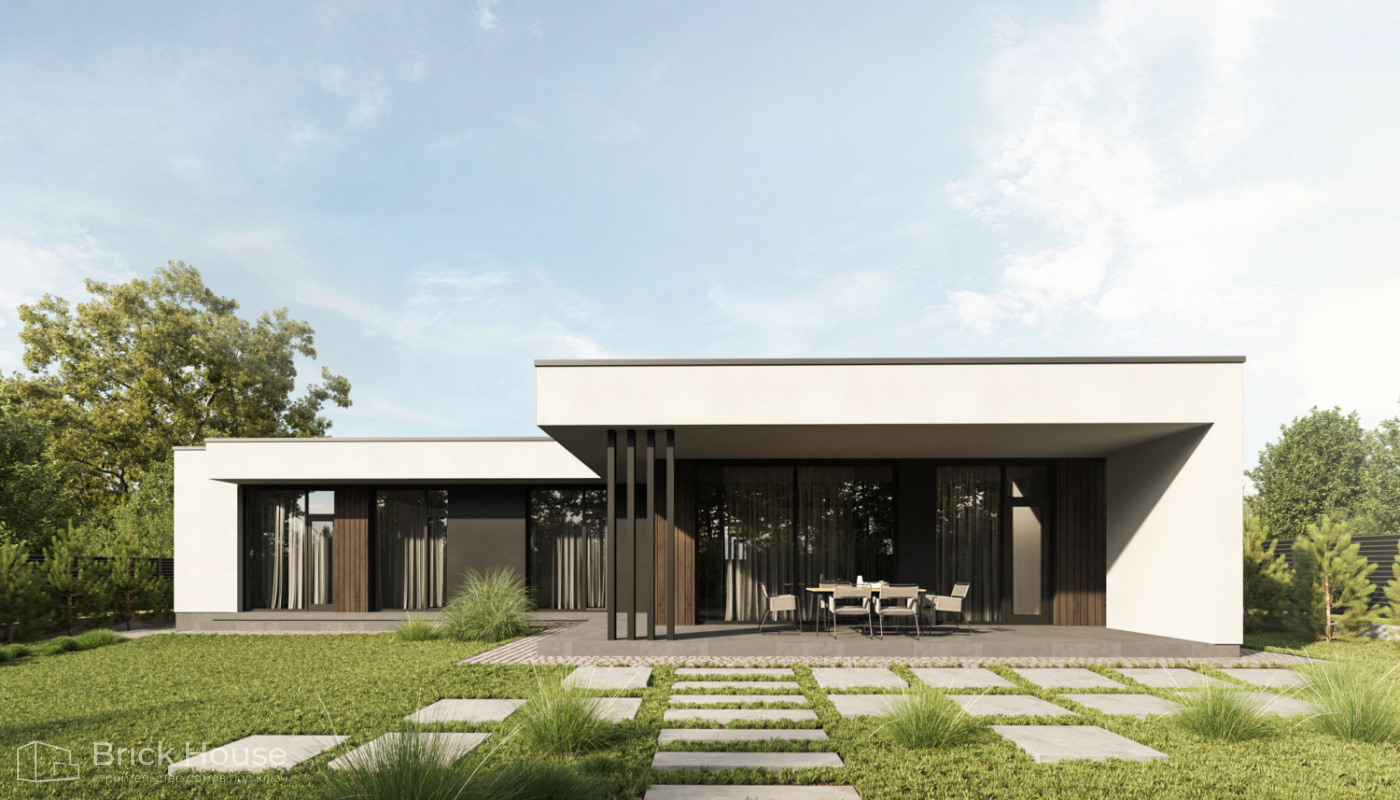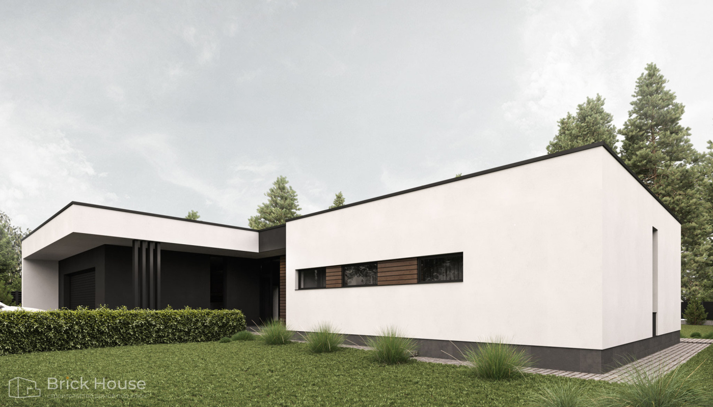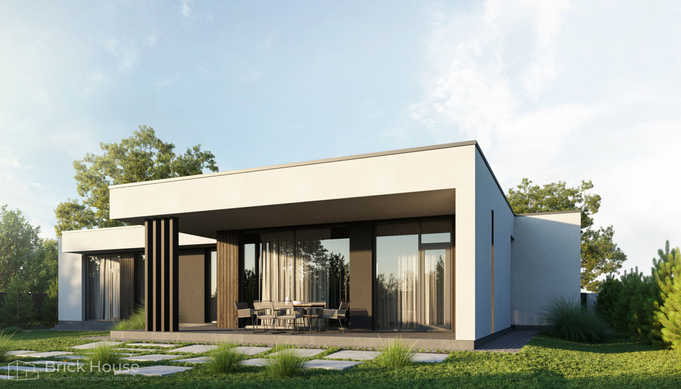 Этот дом имеет один этаж — это позволят быстрее и проще его построить.