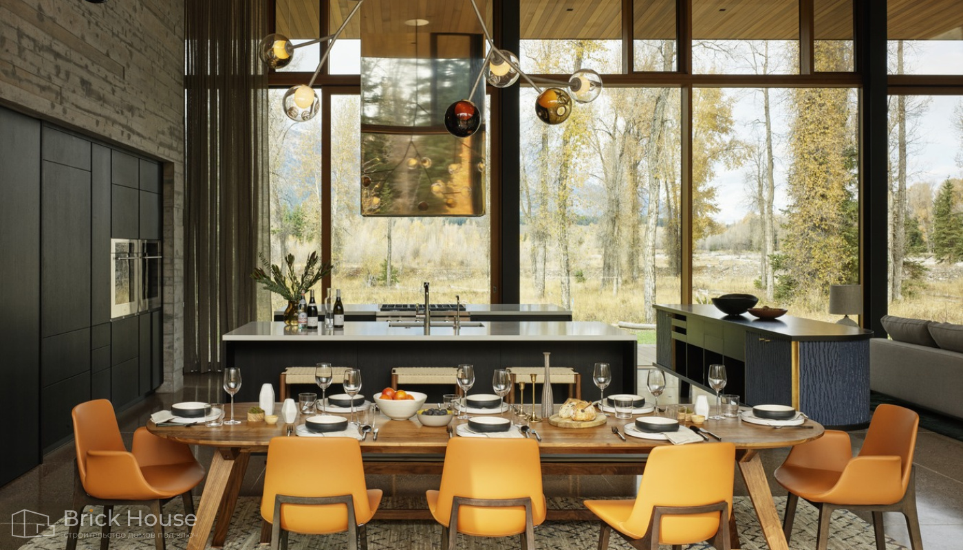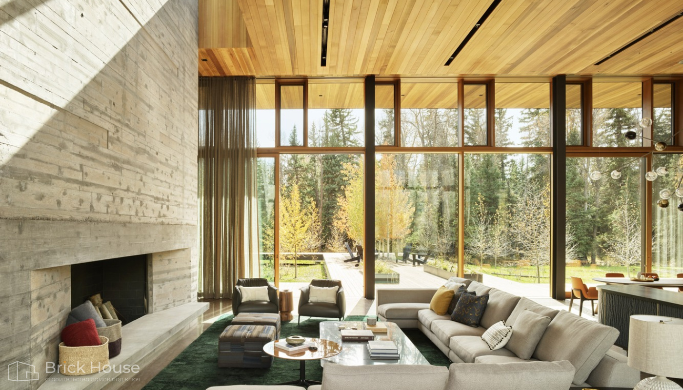 • Панорамные окна позволяют максимально использовать естественное освещение в доме. Они создают светлое и просторное ощущение внутри помещений, позволяют проникать большому количеству дневного света и снижают зависимость от искусственного освещения. Это помогает создать более комфортную и приятную атмосферу