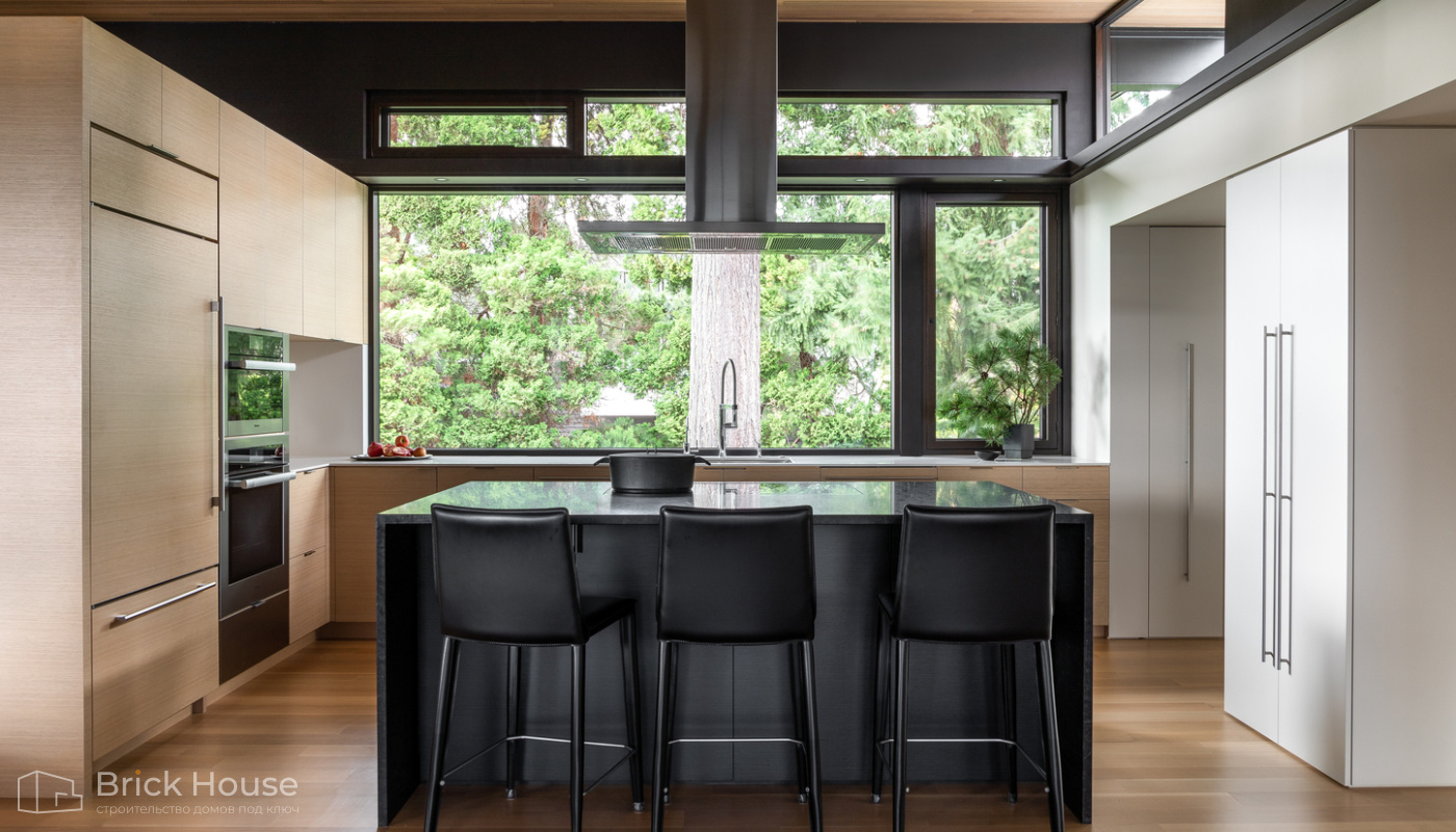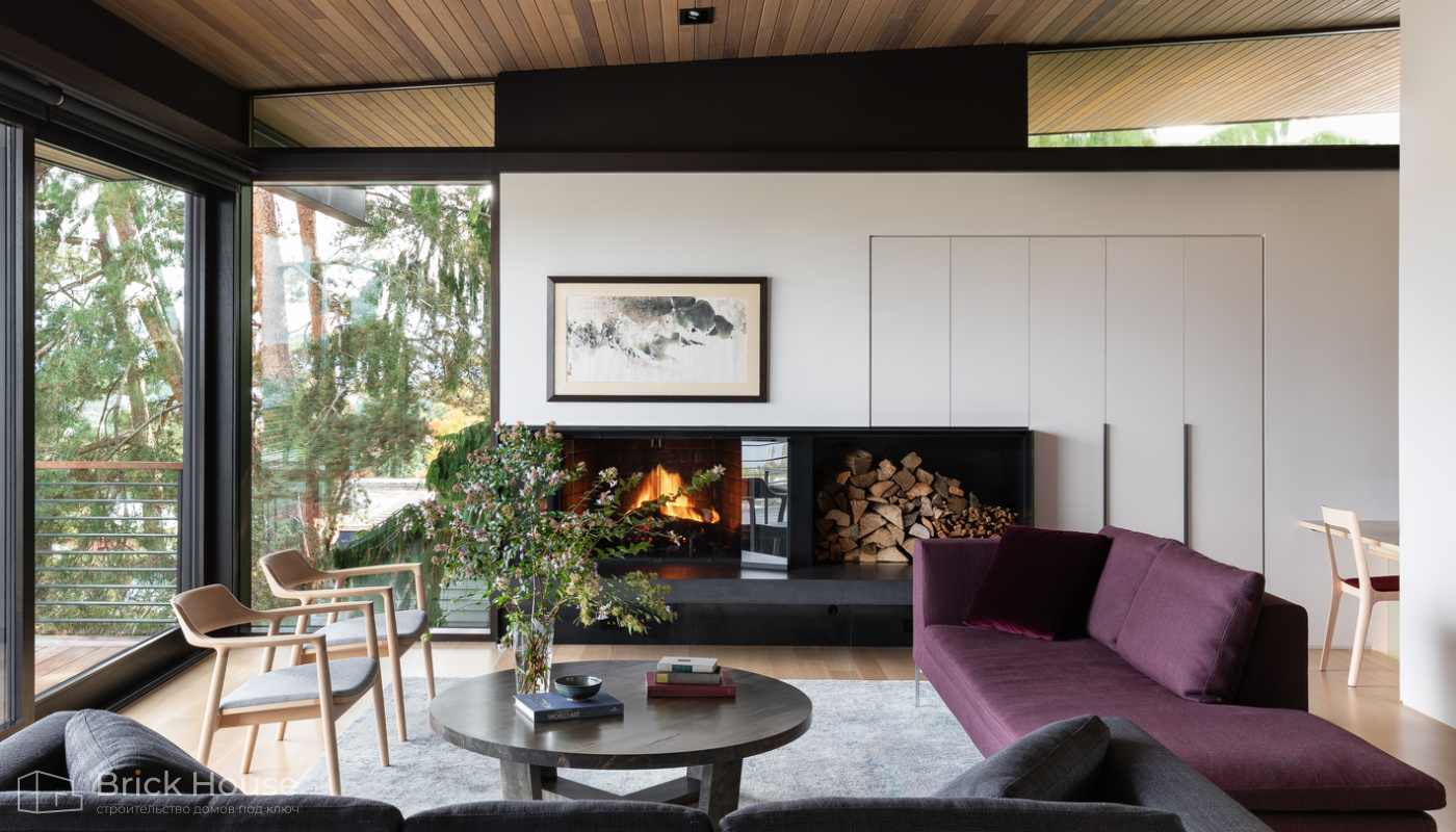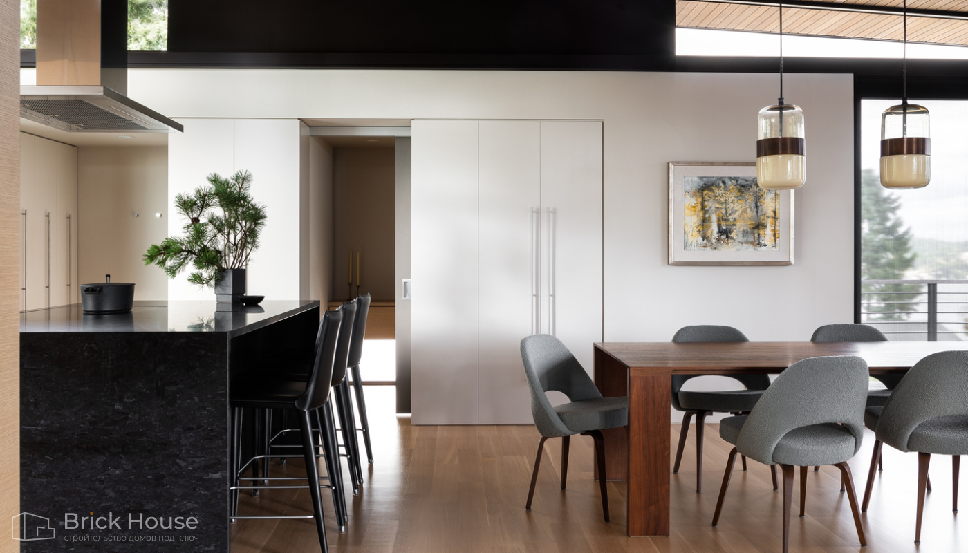 • Панорамные окна позволяют максимально использовать естественное освещение в доме. Они создают светлое и просторное ощущение внутри помещений, позволяют проникать большому количеству дневного света и снижают зависимость от искусственного освещения. Это помогает создать более комфортную и приятную атмосферу