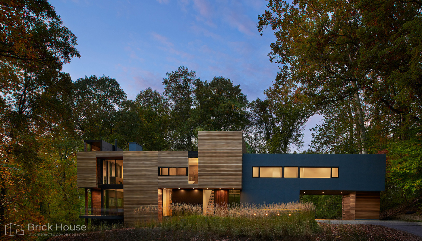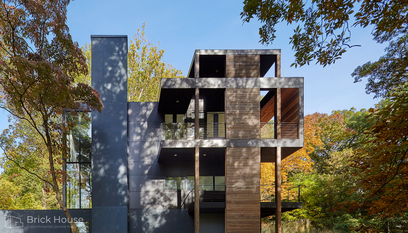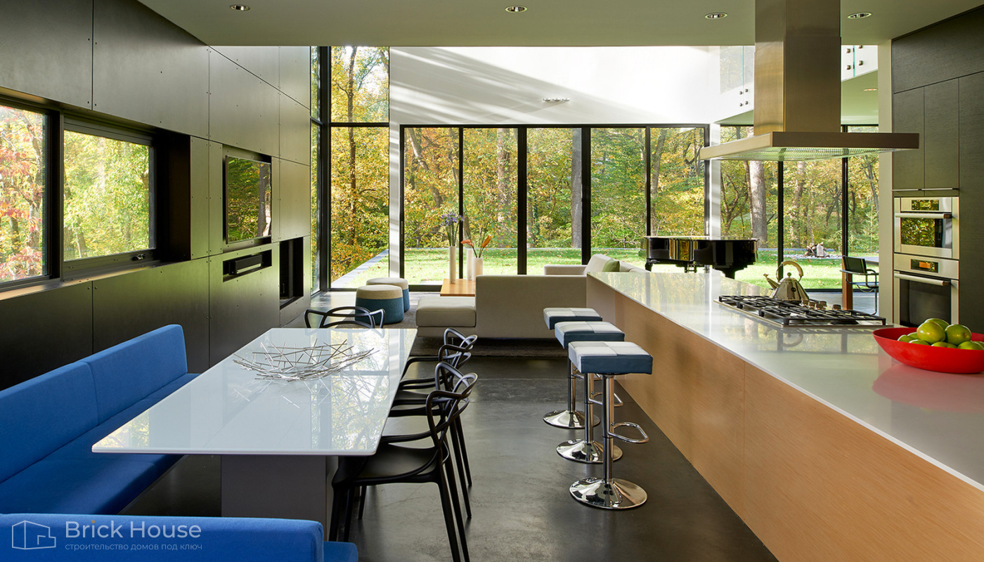 Дома с плоской крышей характерны для стиля хай-тек. Эксплуатируемую плоскую кровлю можно использовать как террасу.
