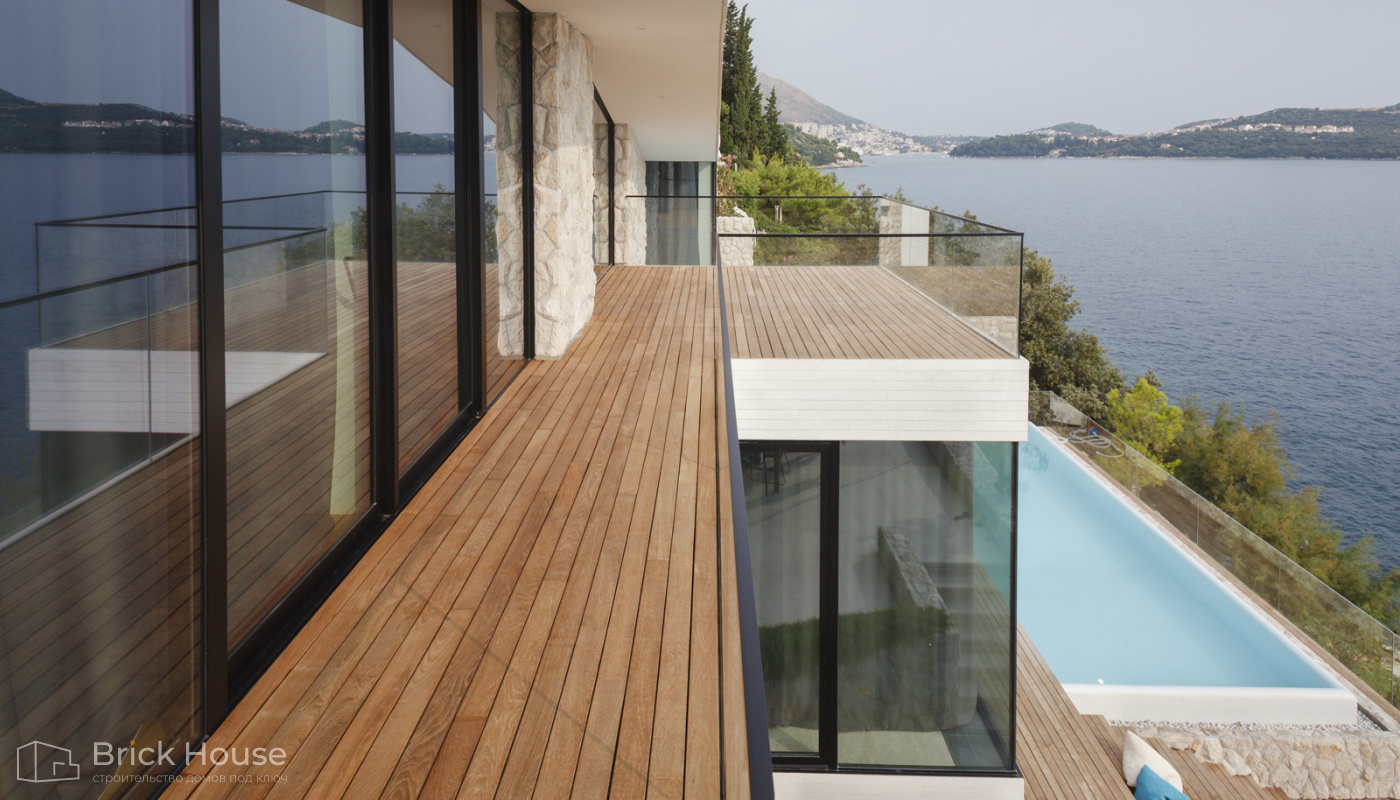 Дома с плоской крышей характерны для стиля хай-тек. Эксплуатируемую плоскую кровлю можно использовать как террасу.