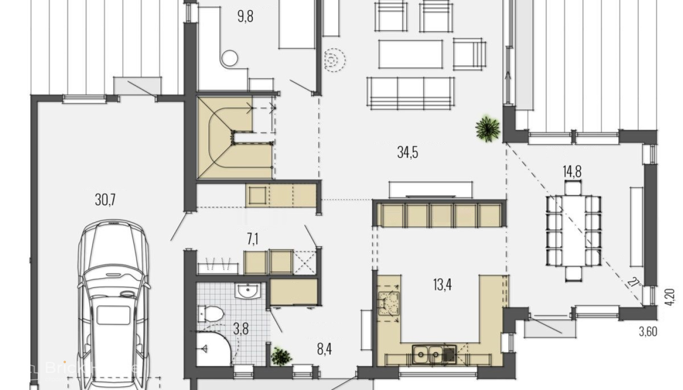 Проект К-174 отличается от других газоблочных уютных домиков своим нестандартным дизайном. Очень интересно смотрится закрытая терраса с застекленными торцами и контрастирующей с остальной площадью строения внешней отделкой.