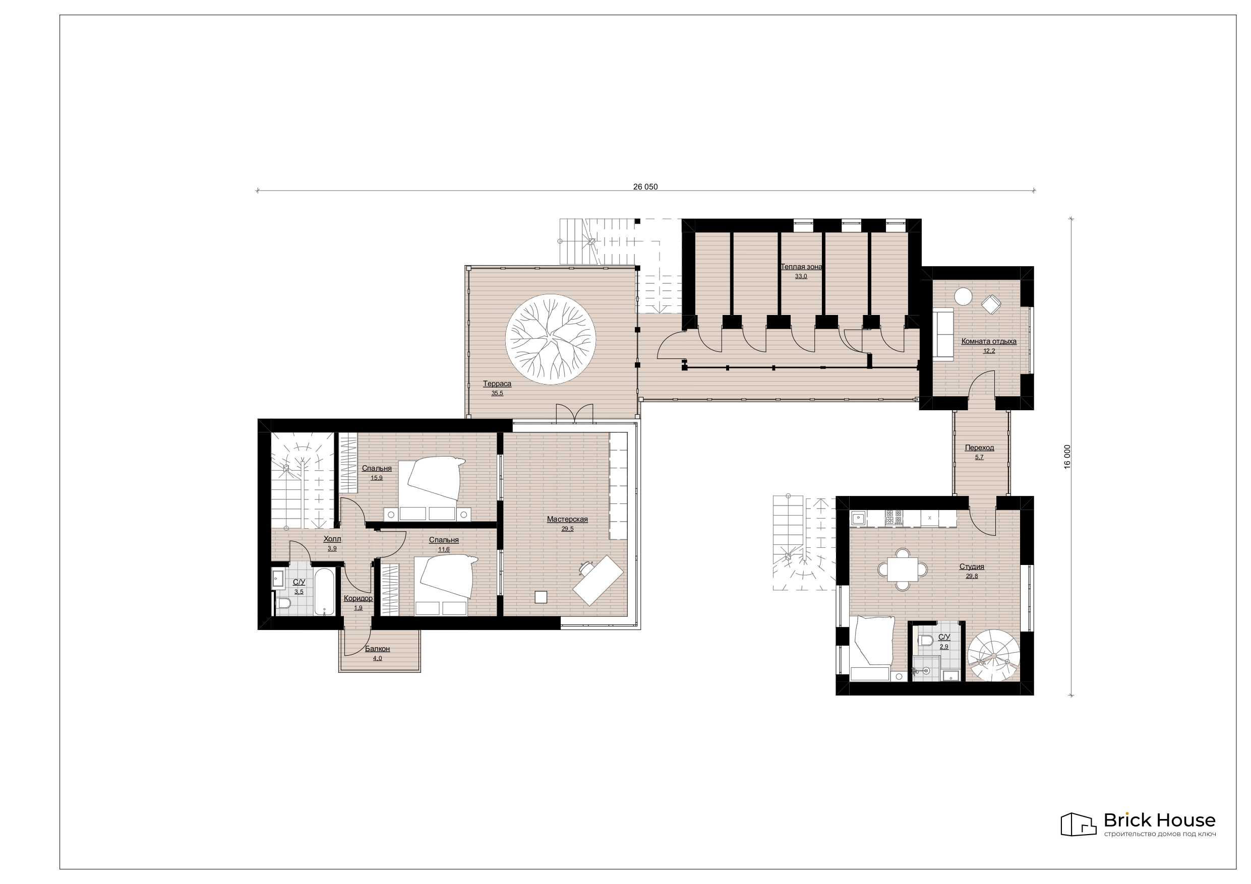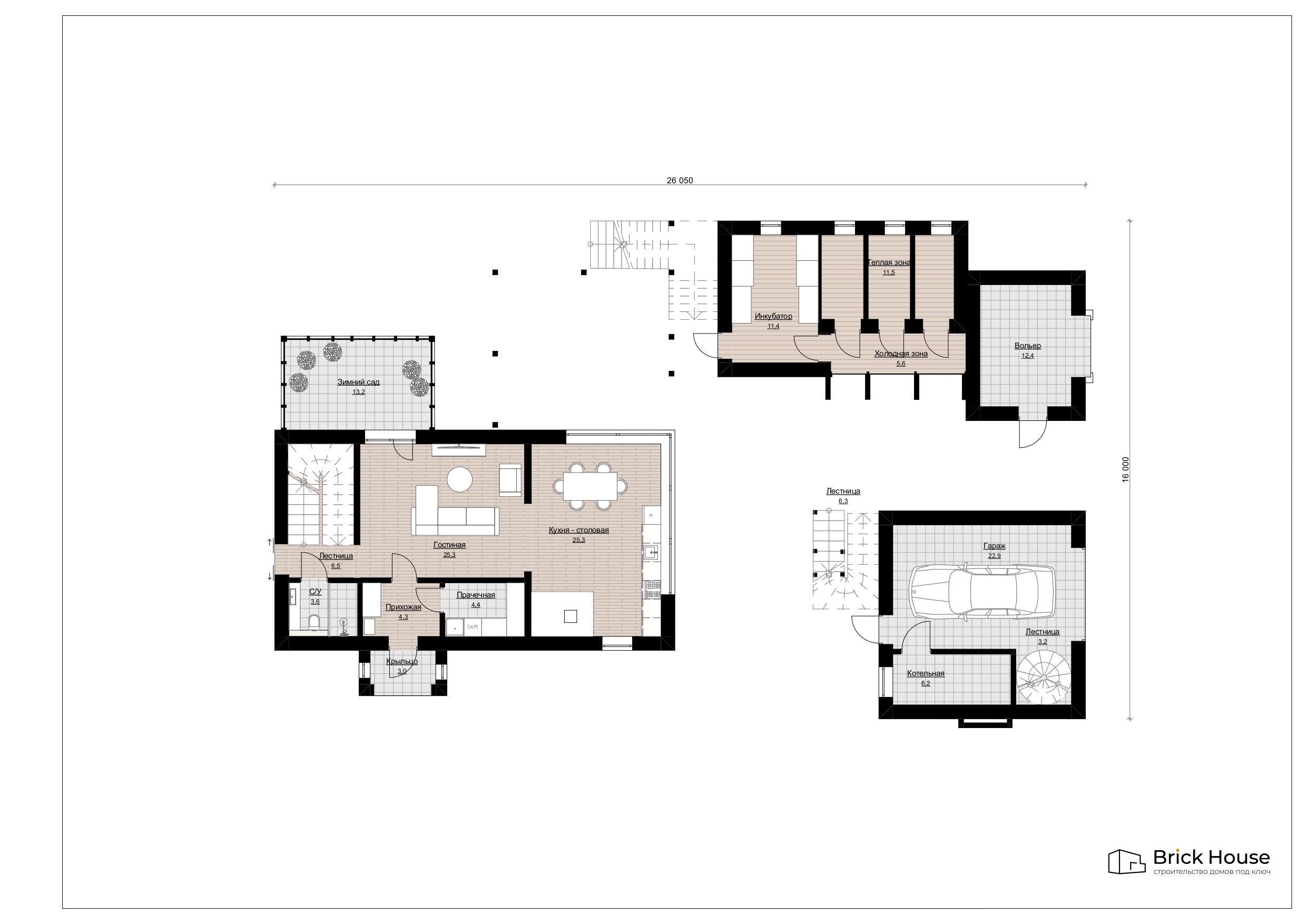 Размеры дома составляют 25,6 на 15,5 метров.