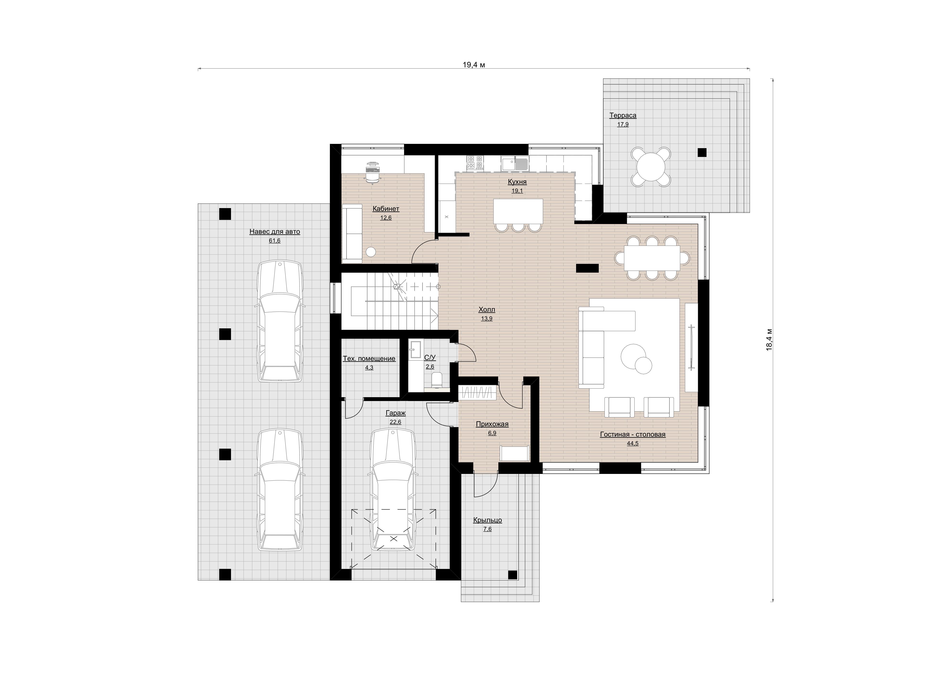 • Дом без гаража предоставляет большую гибкость использования. Вы можете адаптировать это пространство под свои потребности, будь то дополнительная комната для гостей, спортивный зал, рабочий кабинет или студия