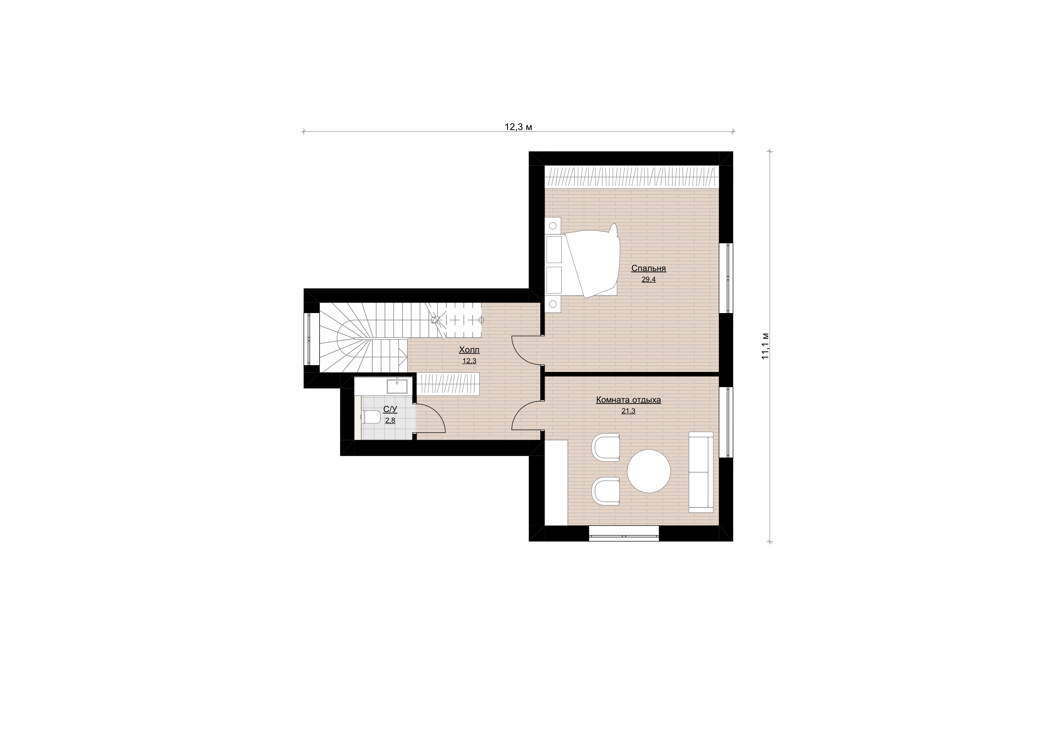 Размеры дома составляют 11,4 на 12,2 метров.