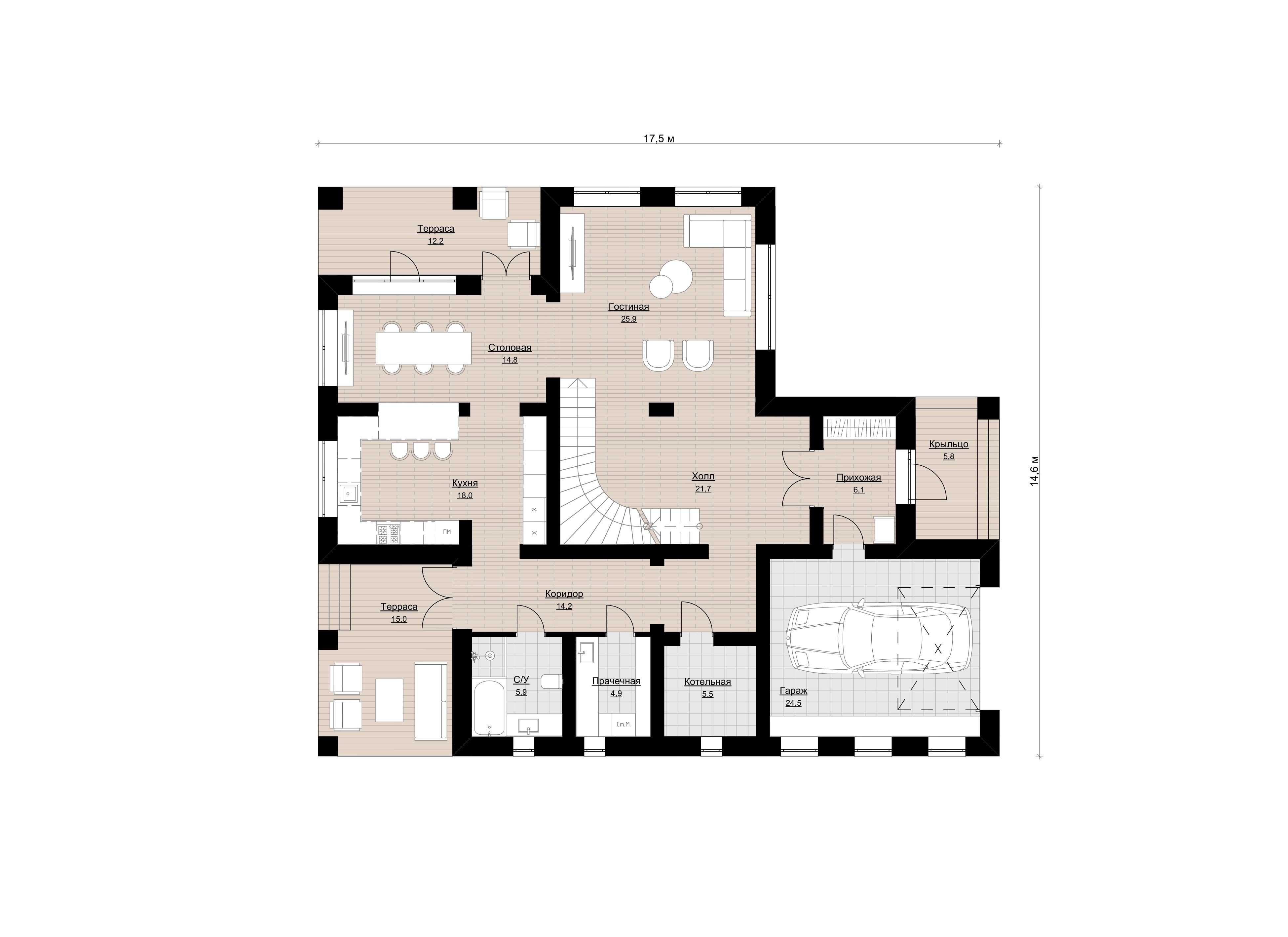 • Дом без гаража предоставляет большую гибкость использования. Вы можете адаптировать это пространство под свои потребности, будь то дополнительная комната для гостей, спортивный зал, рабочий кабинет или студия