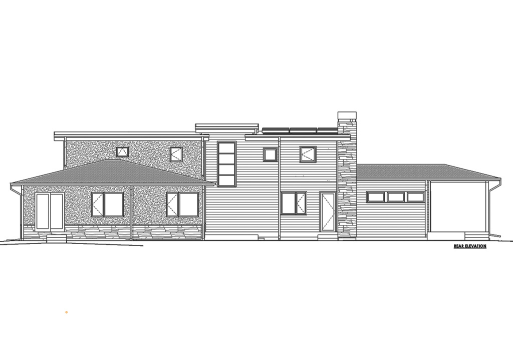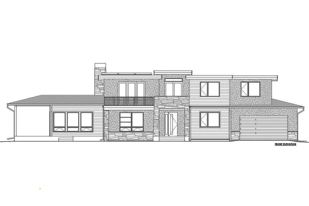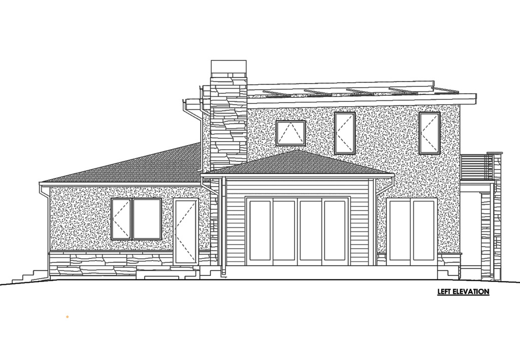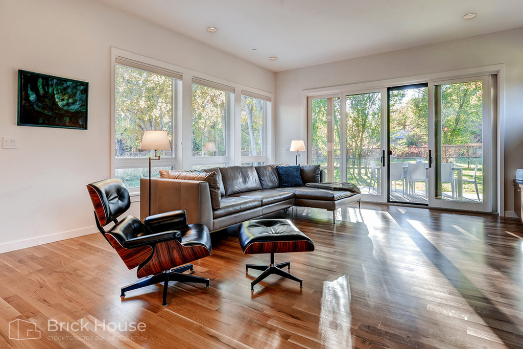 Для домов в стиле Райта характерны горизонтальная направленность в оформлении фасада, низкие скатные крыши, широкие свесы кровли, большие окна.