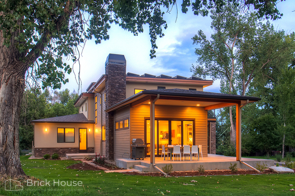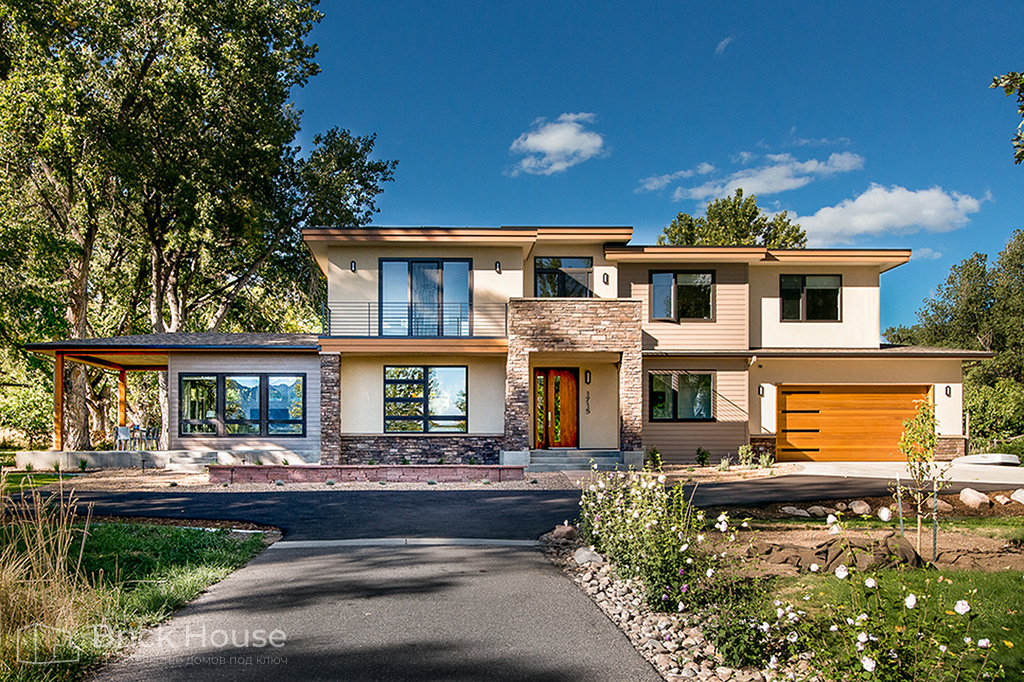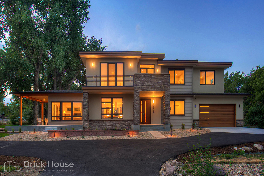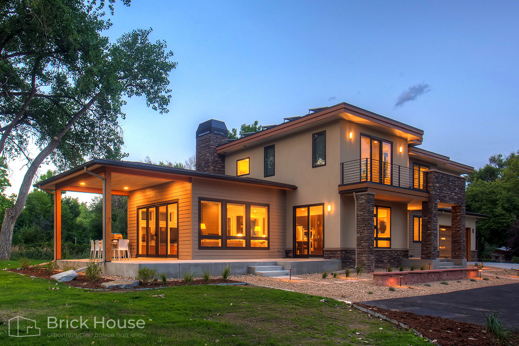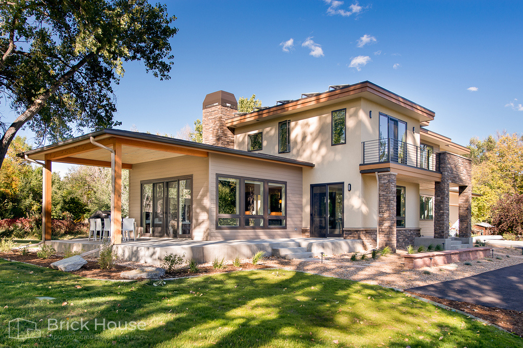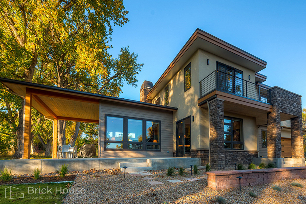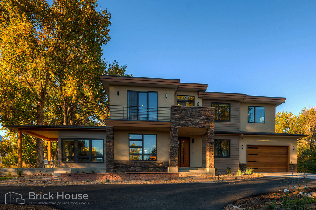 Классический дом в стиле Райта с большой площадью террас и балконов. Большой площадь остекления делает дом светлым.