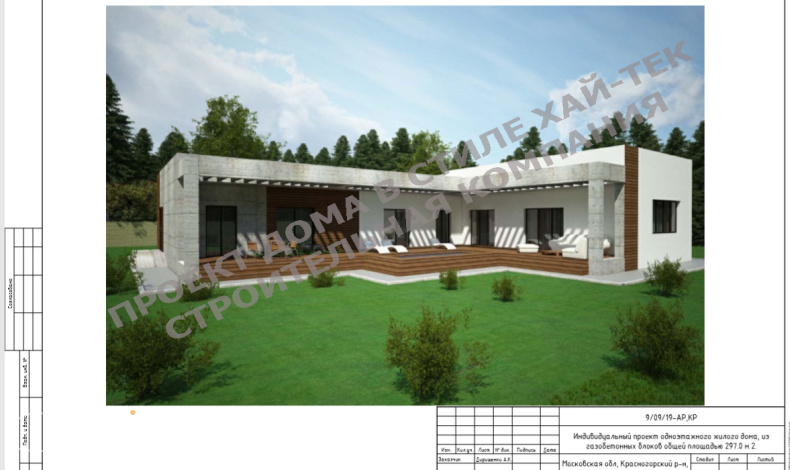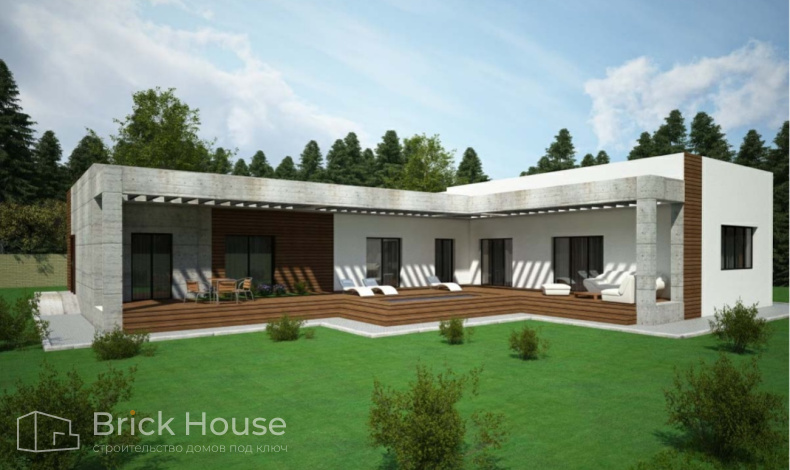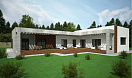Одноэтажный дом в стиле хай-тек просторный и функциональный. В нем предусмотрены пять спален, три санузла, гардеробная, кладовая и небольшой открытый бассейн. А интересное сочетание материалов для фасада из штукатурки, бетона и дерева выгодно подчеркивает его оригинальность.