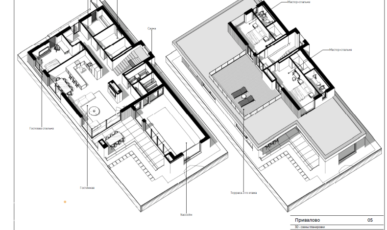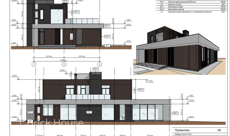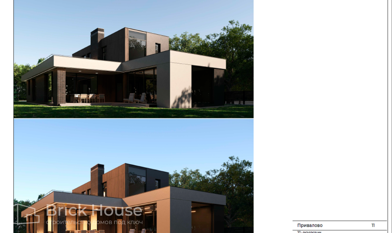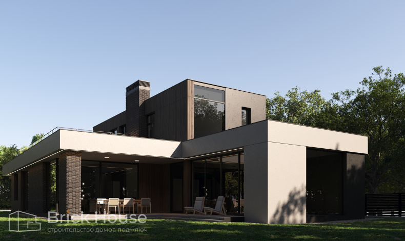 Большой камин в центре гостиной, сауна, бассейн и летняя столовая под навесом – в этом проекте сошлись воедино все привилегии загородной жизни. У дома интересная архитектура. Он словно сложен из двух разных по величине блоков. Конструктивно это достигается за счет того, что площадь второго этажа в 3,5 раза меньше первого. Принцип деления на блоки выдерживается и в комбинированной облицовке фасада. Для нее использованы планкен, штукатурка и облицовочный кирпич.