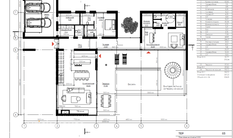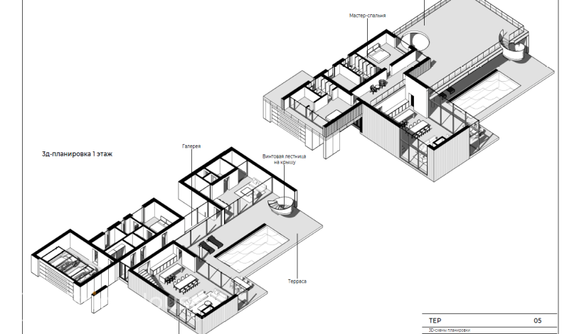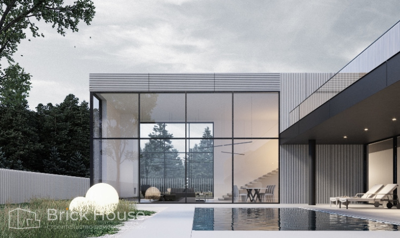 Двухэтажный особняк в стиле хай-тек с большим уличным бассейном, двухуровневой террасой и роскошной винтовой лестницей мы строим в Тверской области. Проект отличается масштабностью и простором помещений. Зона гостиной и кухни-столовой со вторым светом оформлена стеклянным фасадом высотой в два этажа. В зоне СПА вместе джакузи и сауной есть винная комната. На втором этаже разместились две спальни с ванными комнатами и гардеробными.