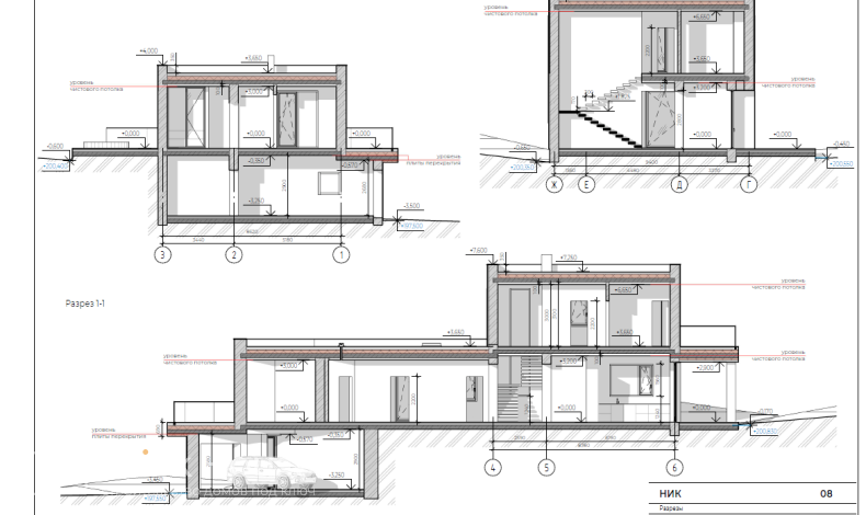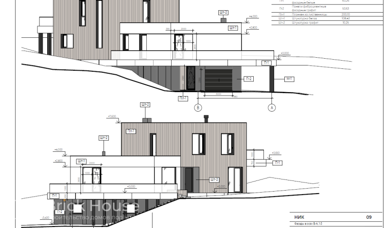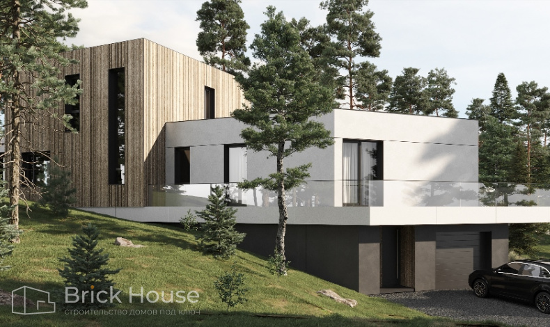 Двухэтажный домв стиле хай-тек с цокольным этажом строится в подмосковной деревне Никольское. Нам достался участок со сложным рельефом, где перепады высот достигают 5 метров. Подъезд спецтехники осложняется большим уклоном и узким въездом. Наша главная задача – воплотить в жизнь все задумки архитектора, который решил не «бороться» с рельефом, а гармонично вписать в него проект. Дом будет строиться из керамических блоков. В отделке фасада используются штукатурка, планкен и фасадные панели.