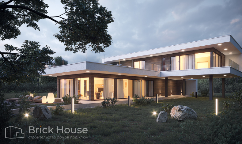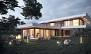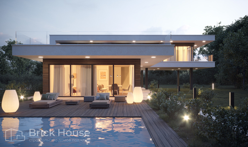 Посмотрите, как в этом доме интересно расположен второй этаж относительно первого. Благодаря такой задумке архитектора наверху получилась просторная терраса. Здесь можно расставить мебель, светильники и устроить очень уютную зону отдыха под открытым небом. С нее открывается чудесный вид на природу и уличный бассейн.