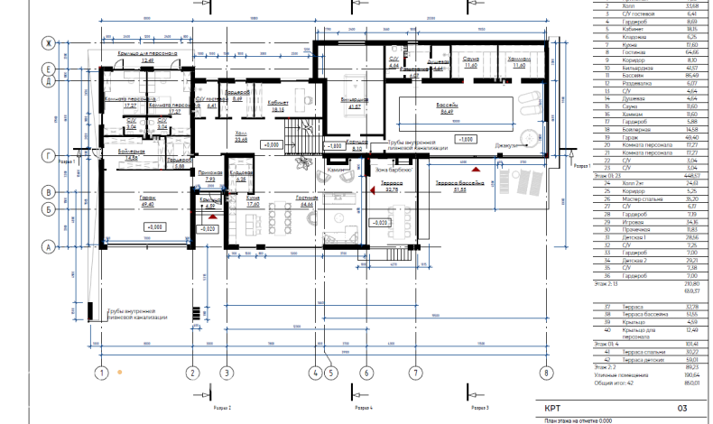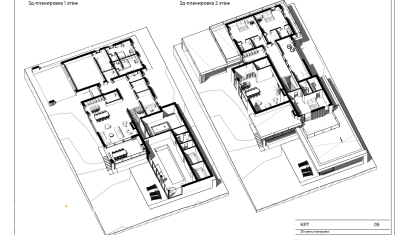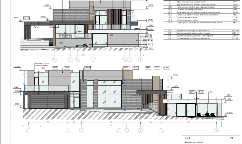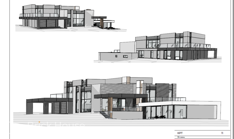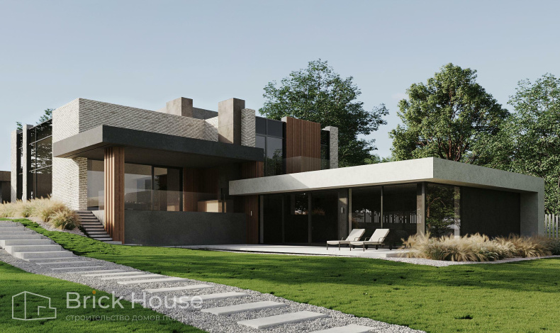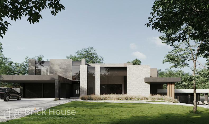 Роскошный коттедж с плоской крышей в стиле хай-тек спроектирован для участка с перепадами высот. Дом расположен на двух уровнях с разной высотой. В нижней части первого этажа зона СПА с бассейном, сауной, хаммамом и бильярдной. Чуть выше – основная жилая зона, кабинет, гараж и комнаты для персонала. В гостиной есть второй свет. На втором этаже разместились хозяйская спальня, детские и игровая комнаты.
