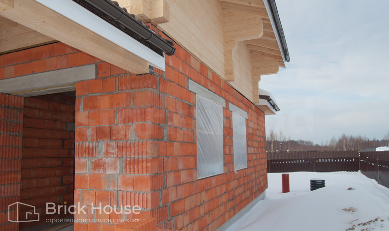 Стены дома построены по комбинированной технологии: первый этаж из керамоблоков, второй из клееного бруса. Это позволило придать конструкции основательность каменного строения и теплоту дерева в спальной зоне второго этажа.