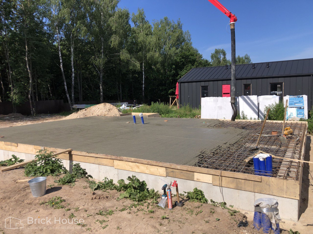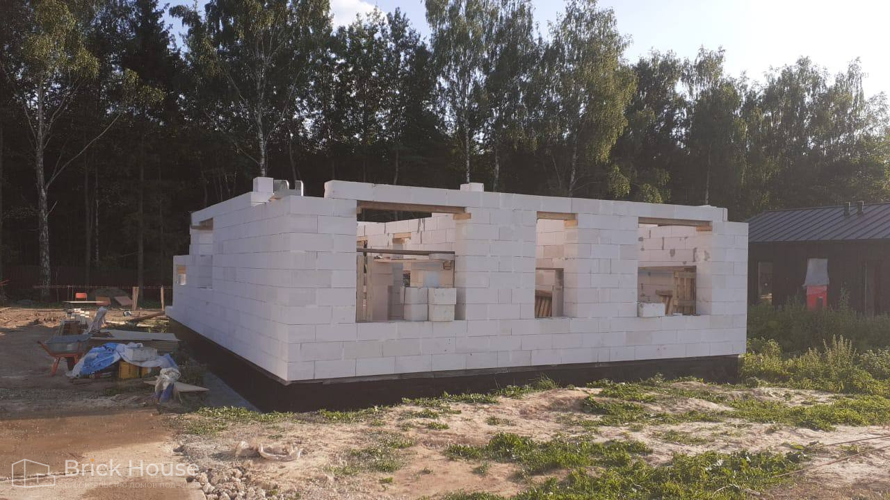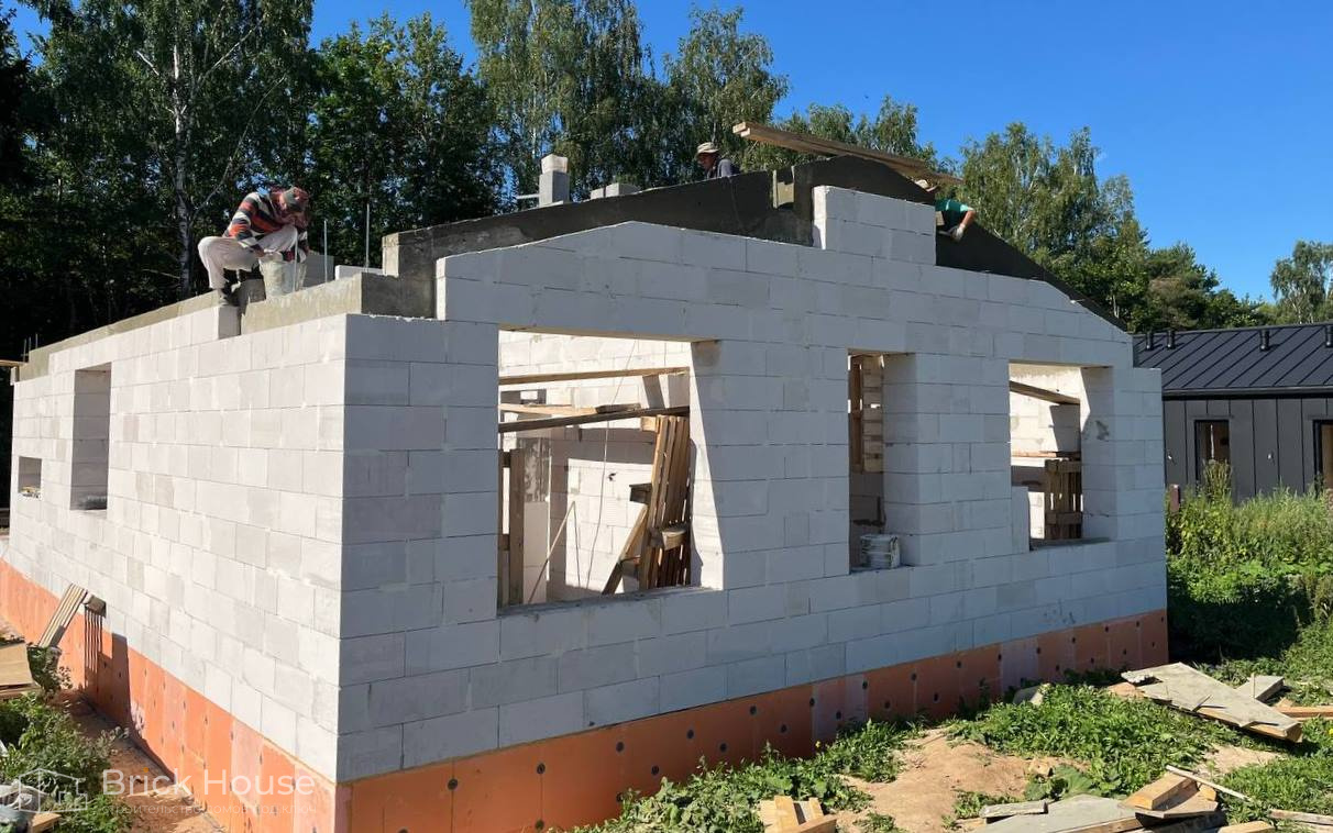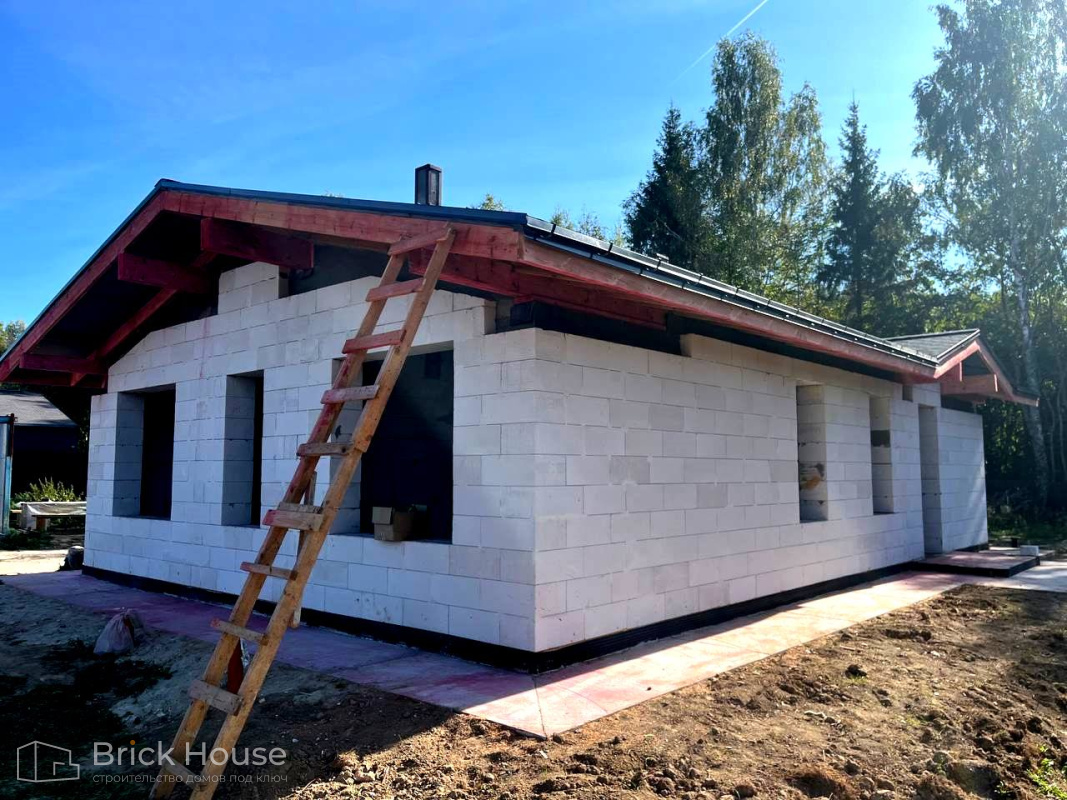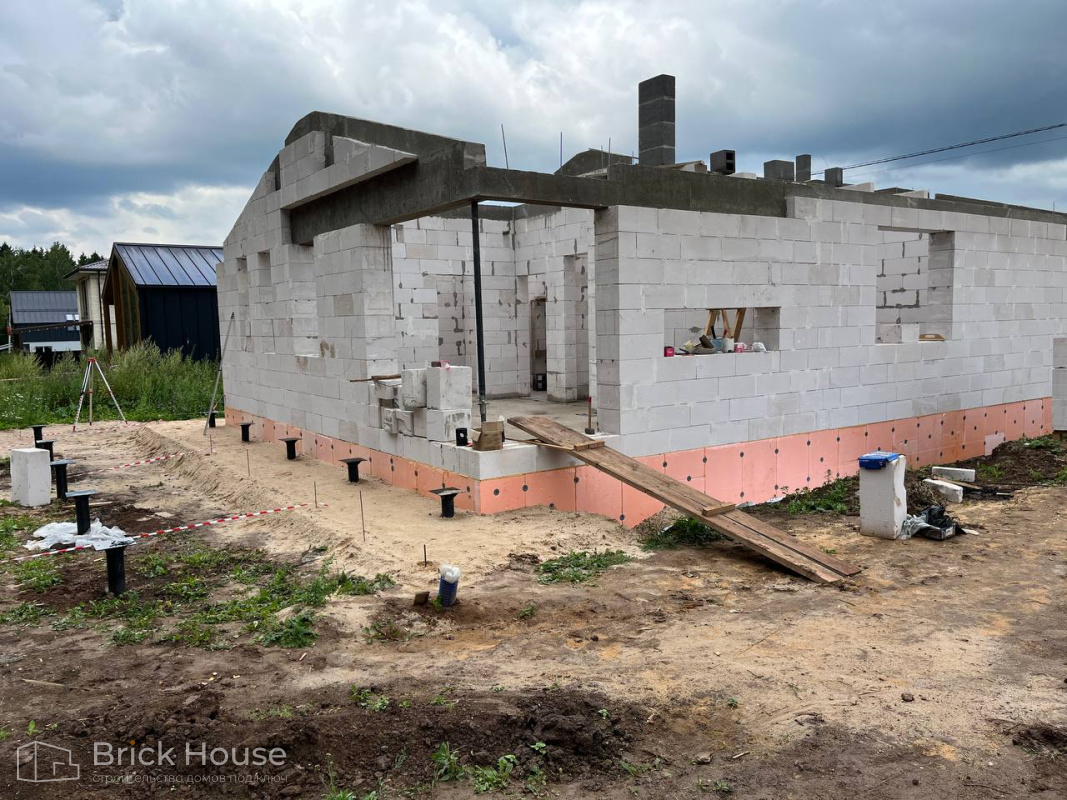 Наш первый объект, реализуемый по проекту K-100. Одноэтажный дом с кухней-гостиной, тремя спальнями, прихожей, гардеробной, двумя санузлами и бойлерной. На улице - 19-метровая терраса. Прекрасная альтернатива городской квартире. Тип фундамента на данном объекте - плита с ребрами жесткости. Стены из газобетонных блоков. Покрытие кровли - мягкая черепица. В отделке фасада использовали клинкерную плитку.