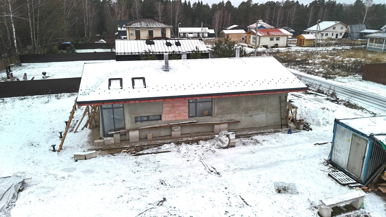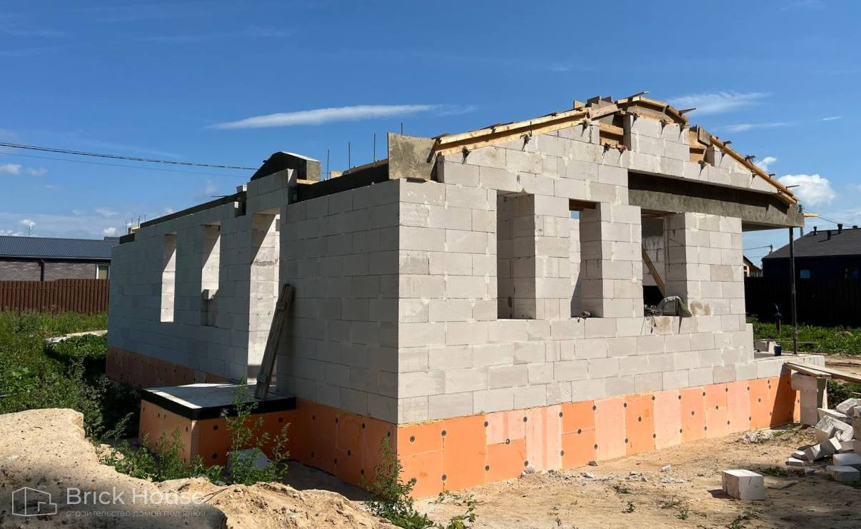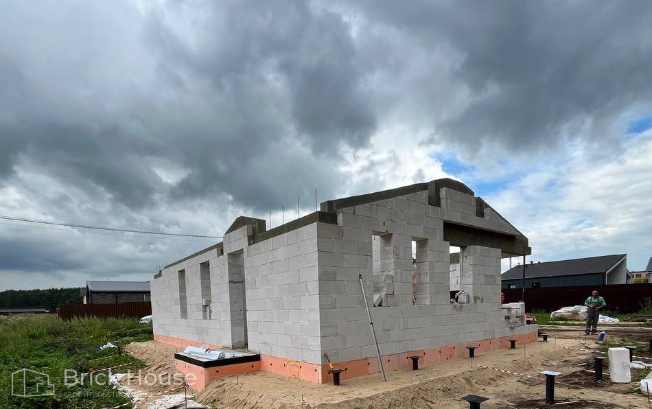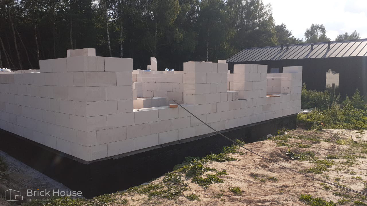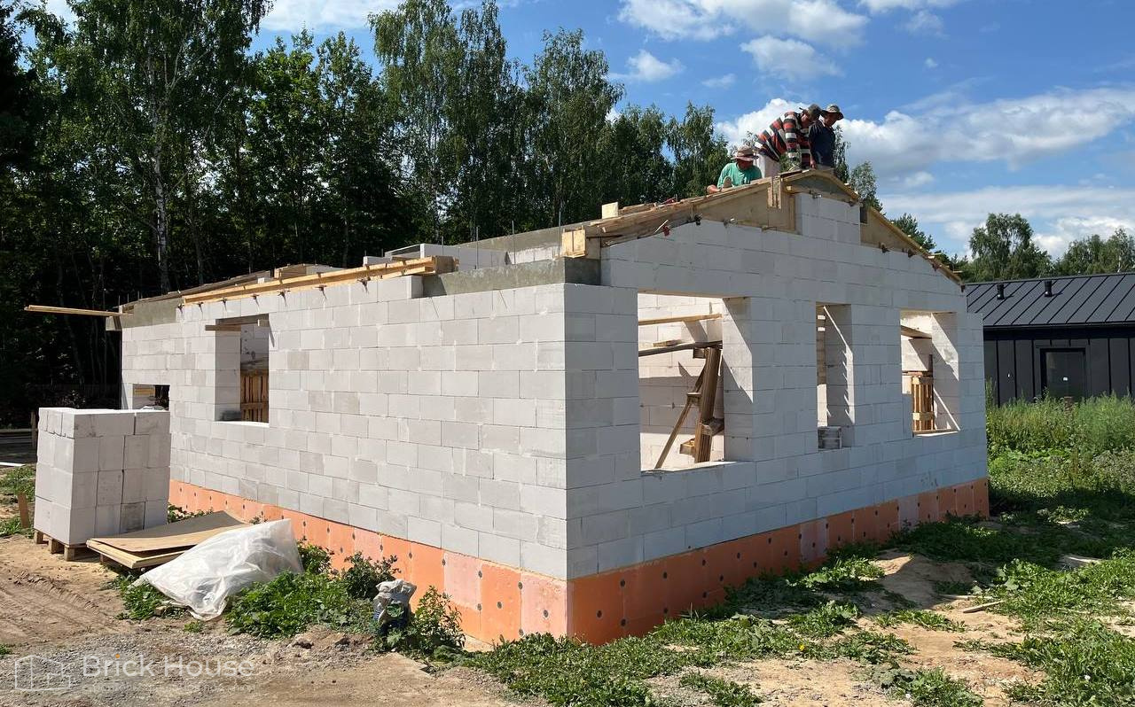 Наш первый объект, реализуемый по проекту K-100. Одноэтажный дом с кухней-гостиной, тремя спальнями, прихожей, гардеробной, двумя санузлами и бойлерной. На улице - 19-метровая терраса. Прекрасная альтернатива городской квартире. Тип фундамента на данном объекте - плита с ребрами жесткости. Стены из газобетонных блоков. Покрытие кровли - мягкая черепица. В отделке фасада использовали клинкерную плитку.
