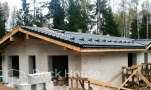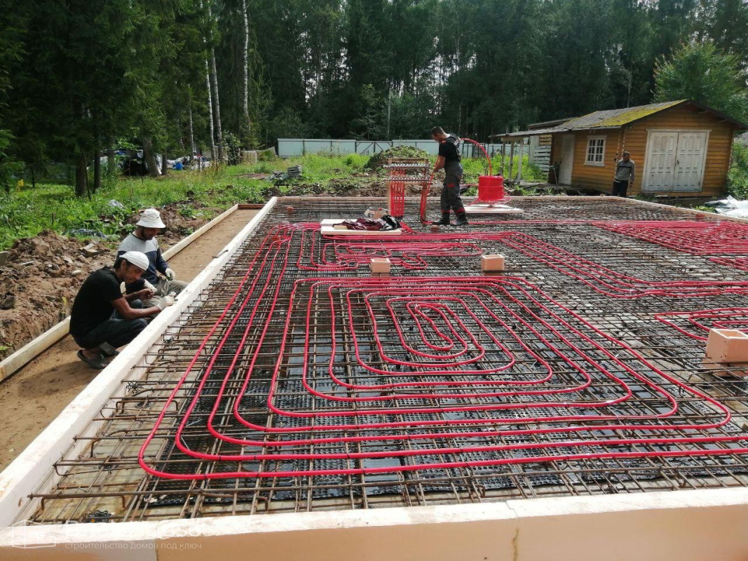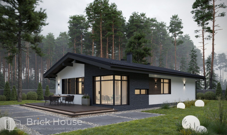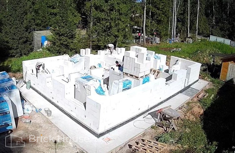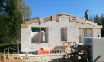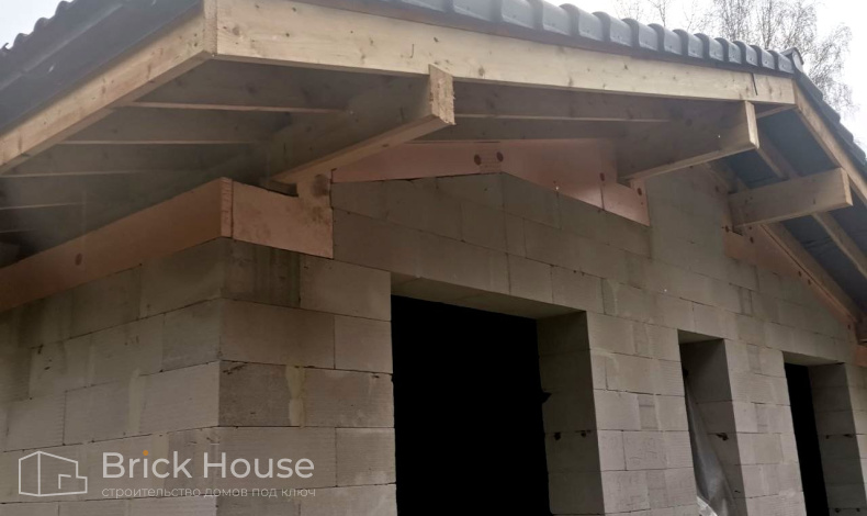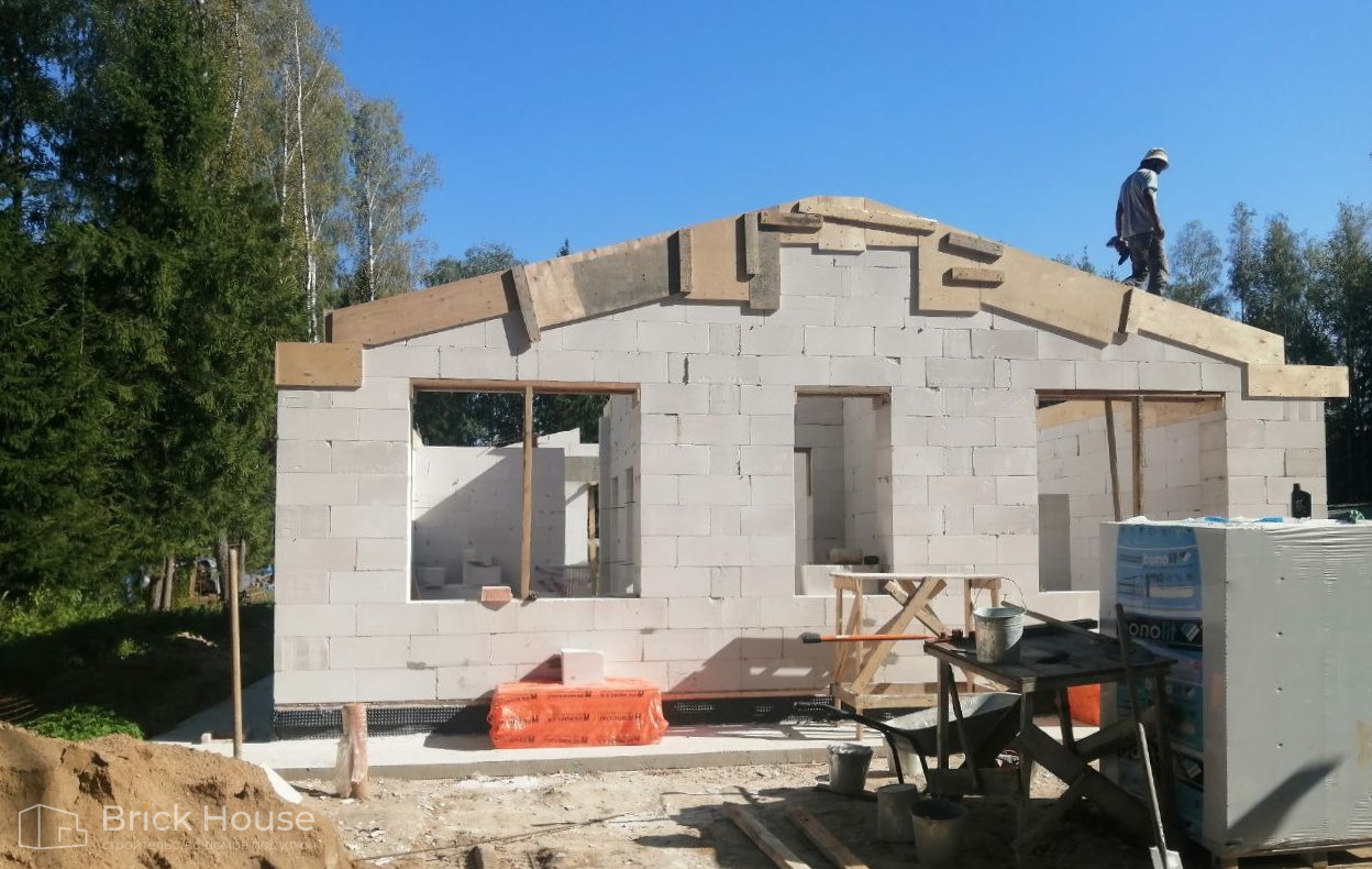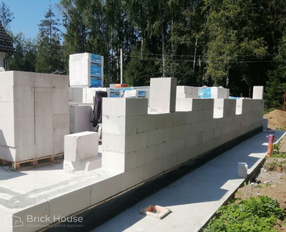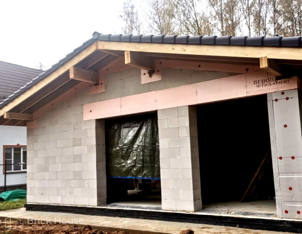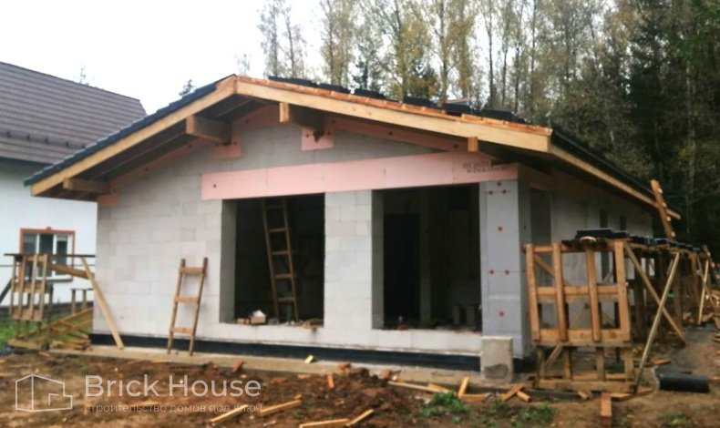 Второй объект, реализуемый по популярному среди наших заказчиков проекту K-100. В доме три спальни, кухня-гостиная, прихожая, гардеробная и бойлерная. Тип фундамента для данного объекта - монолитная плита, в которую сразу монтируется система «теплого пола». Стены возводим из газобетонных блоков. Покрытие кровли - мягкая черепица.