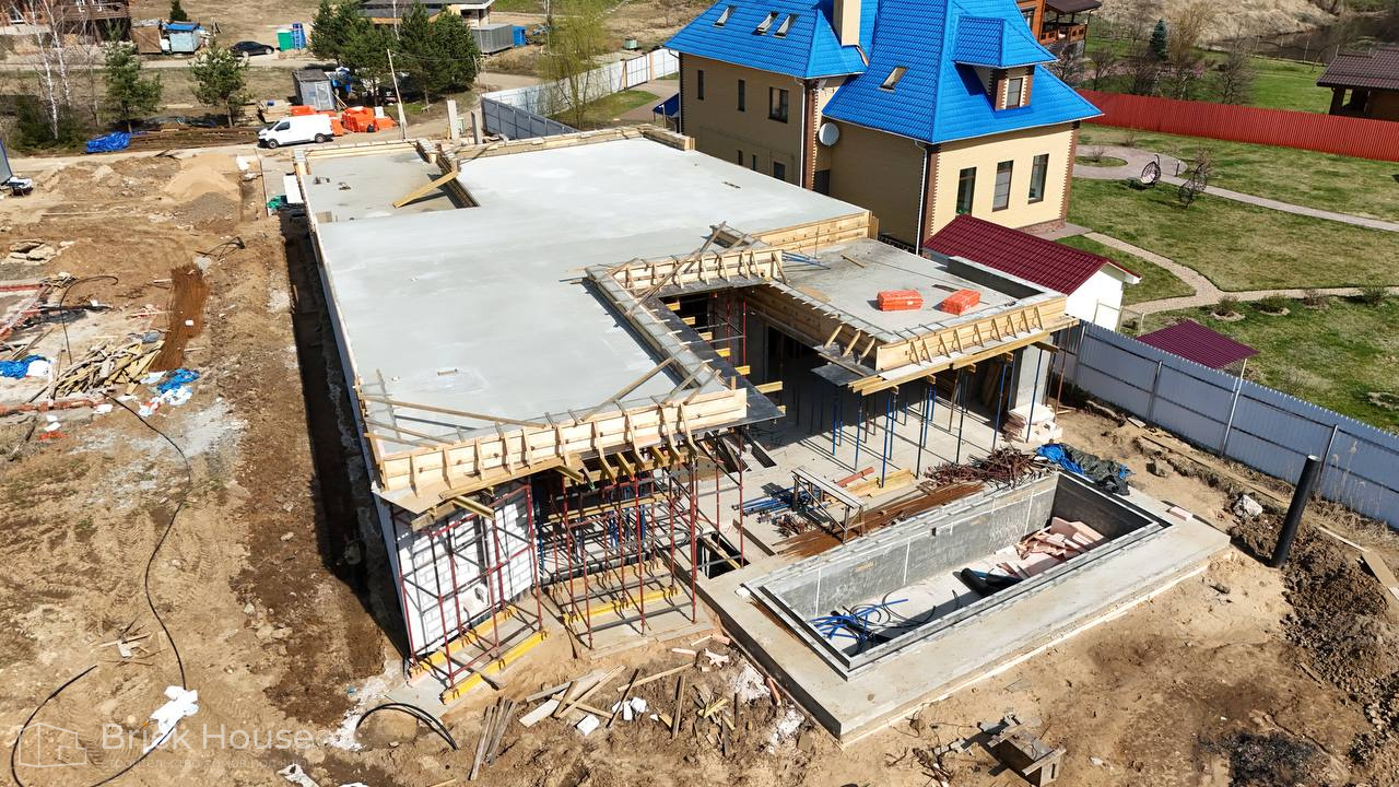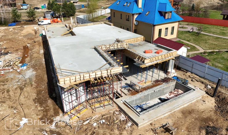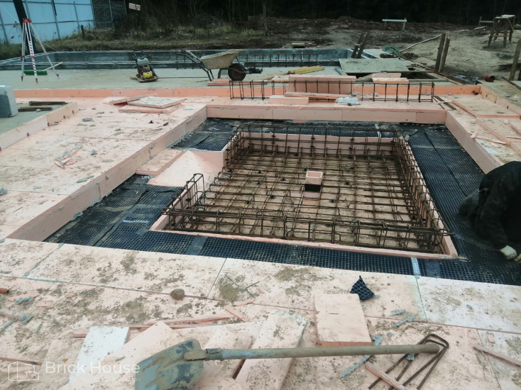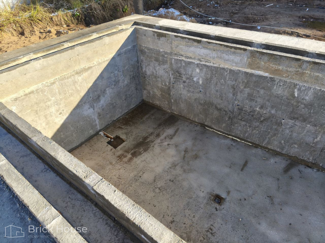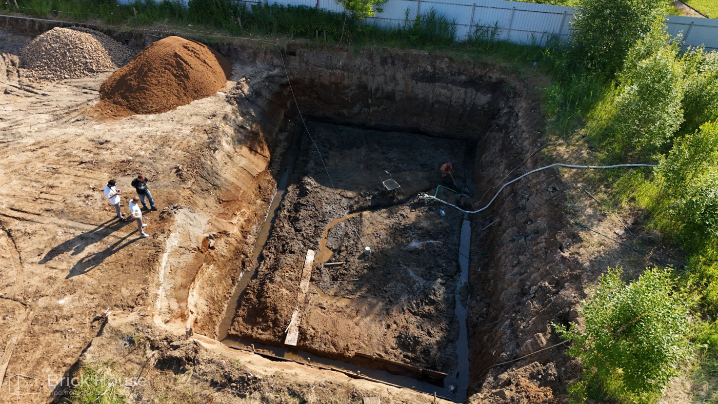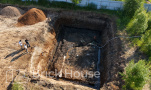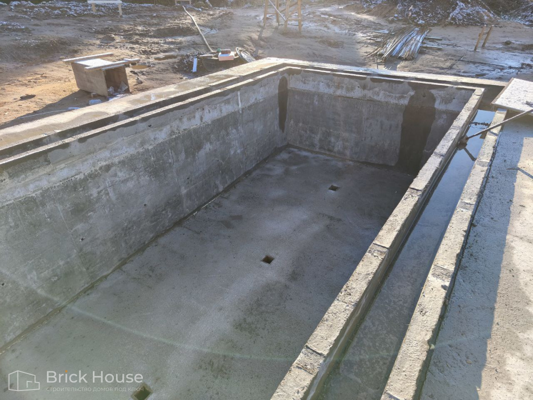 Масштабный и сложный проект одноэтажного дома в стиле хай-тек с уличным монолитным бассейном. Участок заказчика находится у реки, поэтому при рытье котлована под бассейн мы быстро вышли на уровень грунтовых вод. Чтобы осушить котлован, сделали дренаж и гидроизоляцию под основание чаши бассейна.