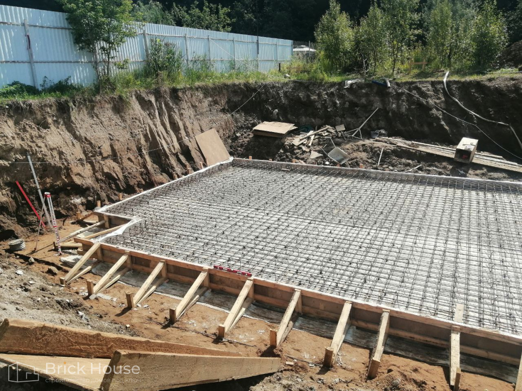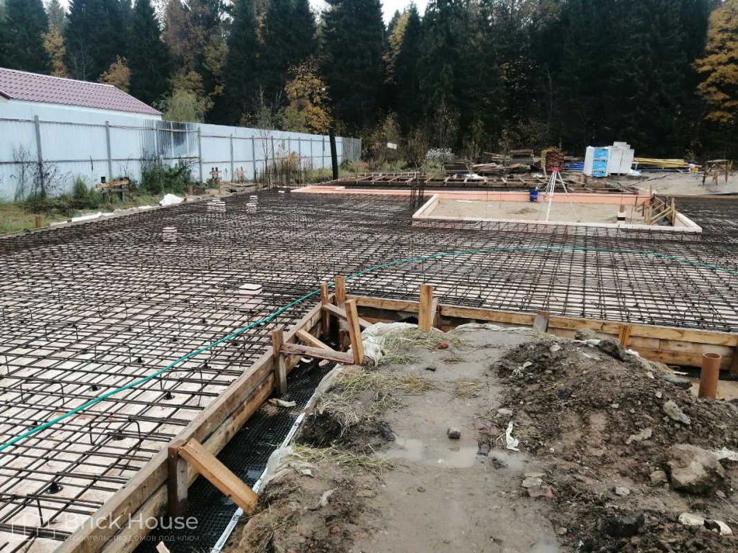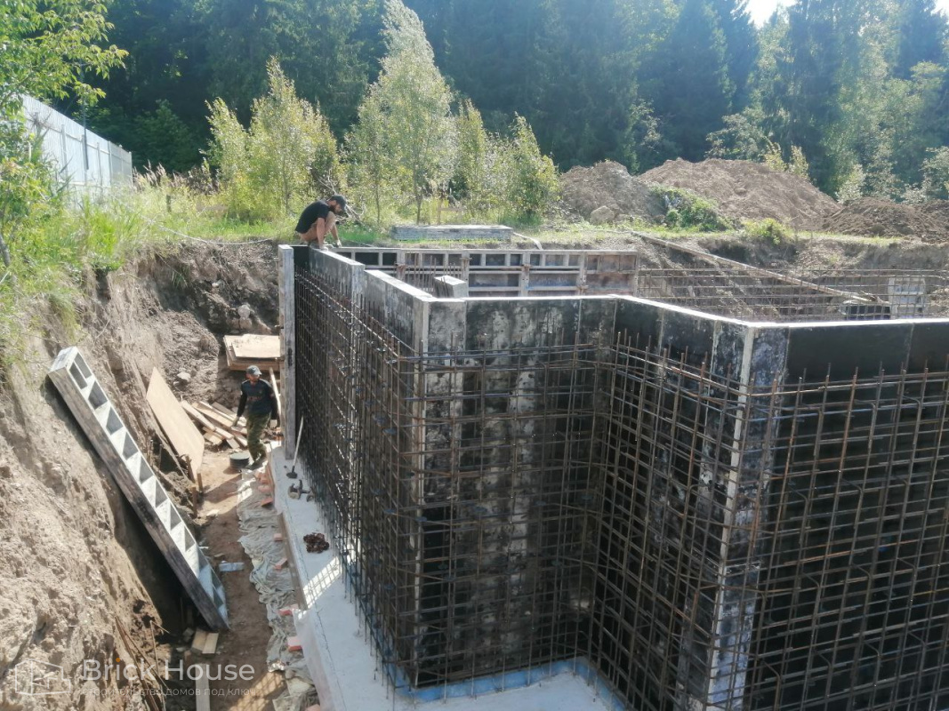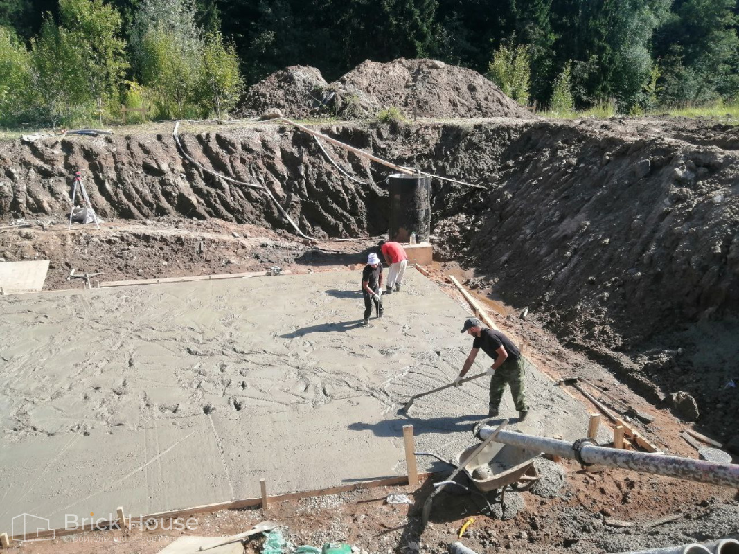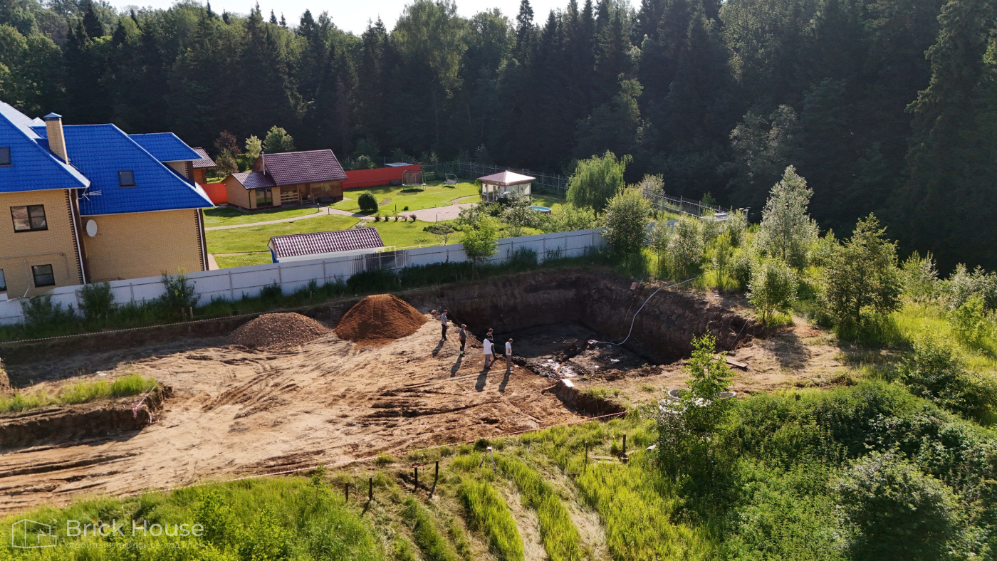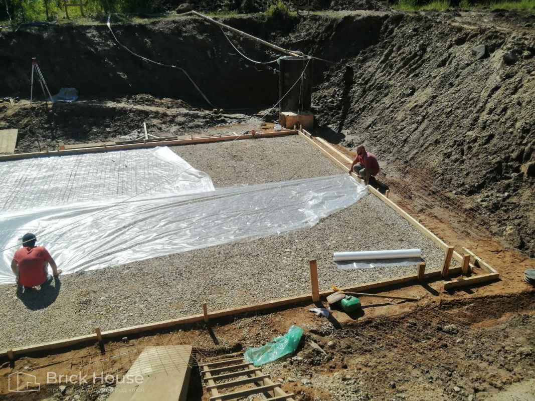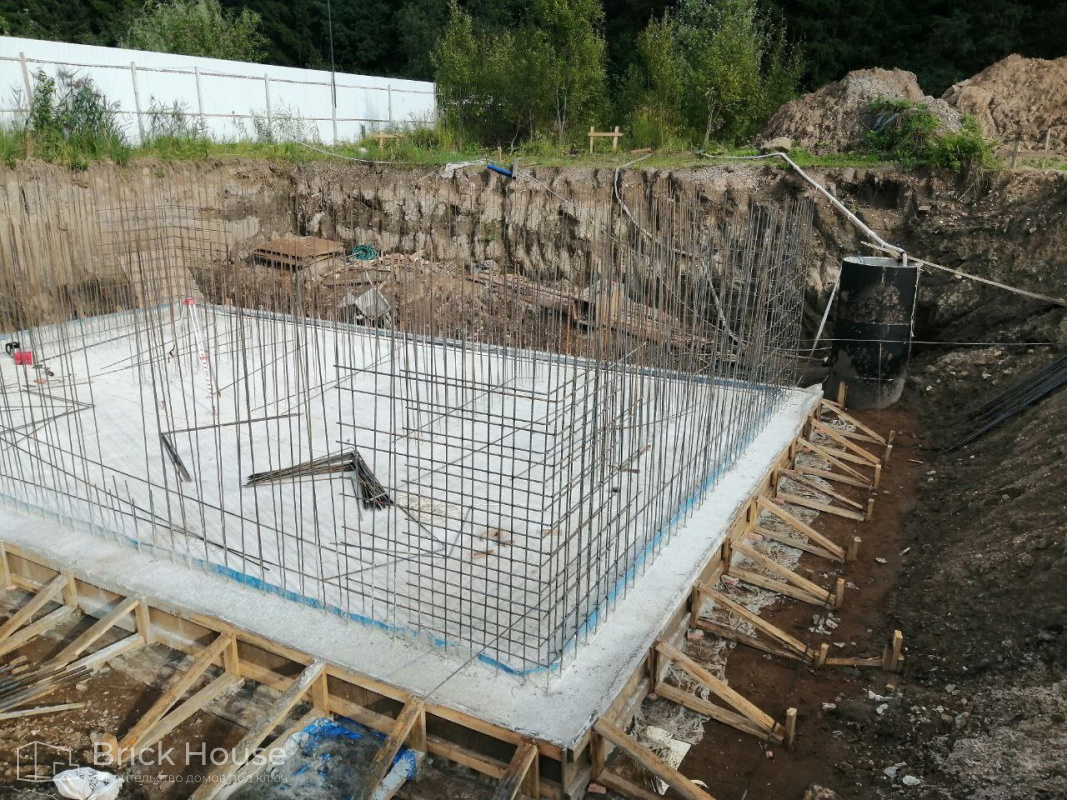 Масштабный и сложный проект одноэтажного дома в стиле хай-тек с уличным монолитным бассейном. Участок заказчика находится у реки, поэтому при рытье котлована под бассейн мы быстро вышли на уровень грунтовых вод. Чтобы осушить котлован, сделали дренаж и гидроизоляцию под основание чаши бассейна.