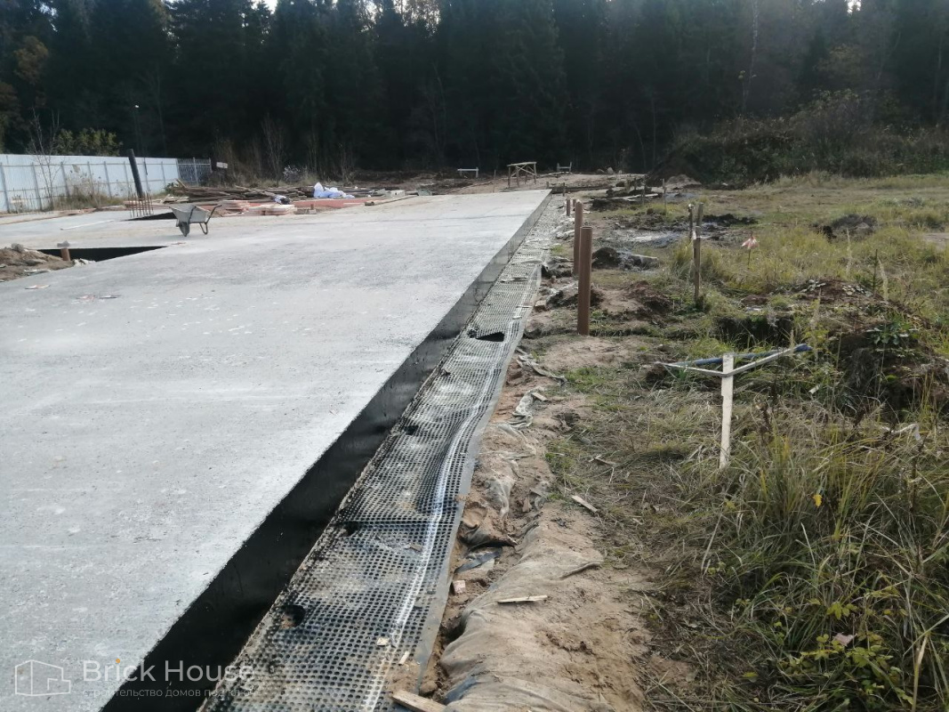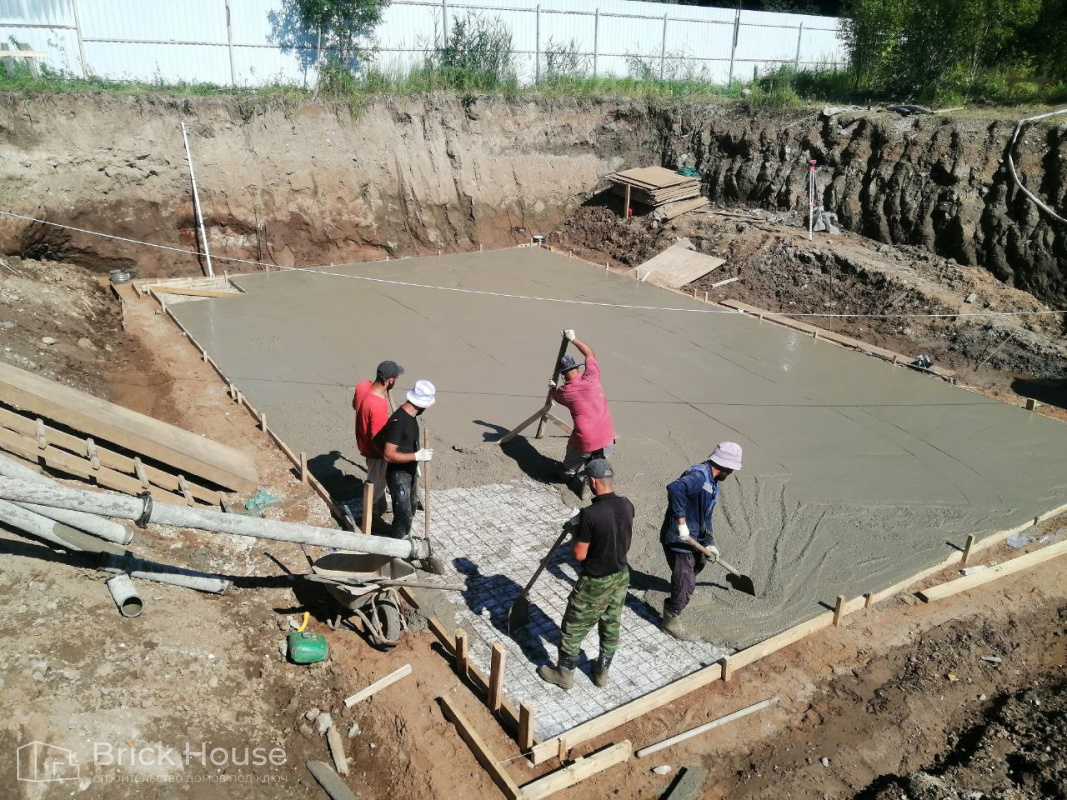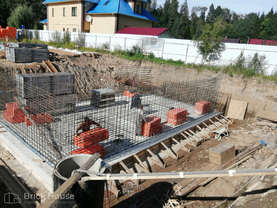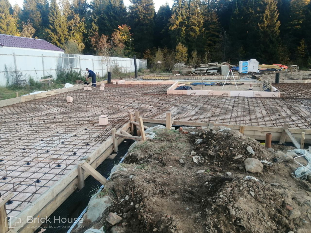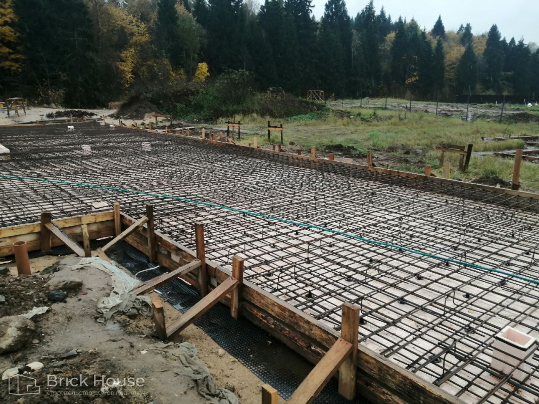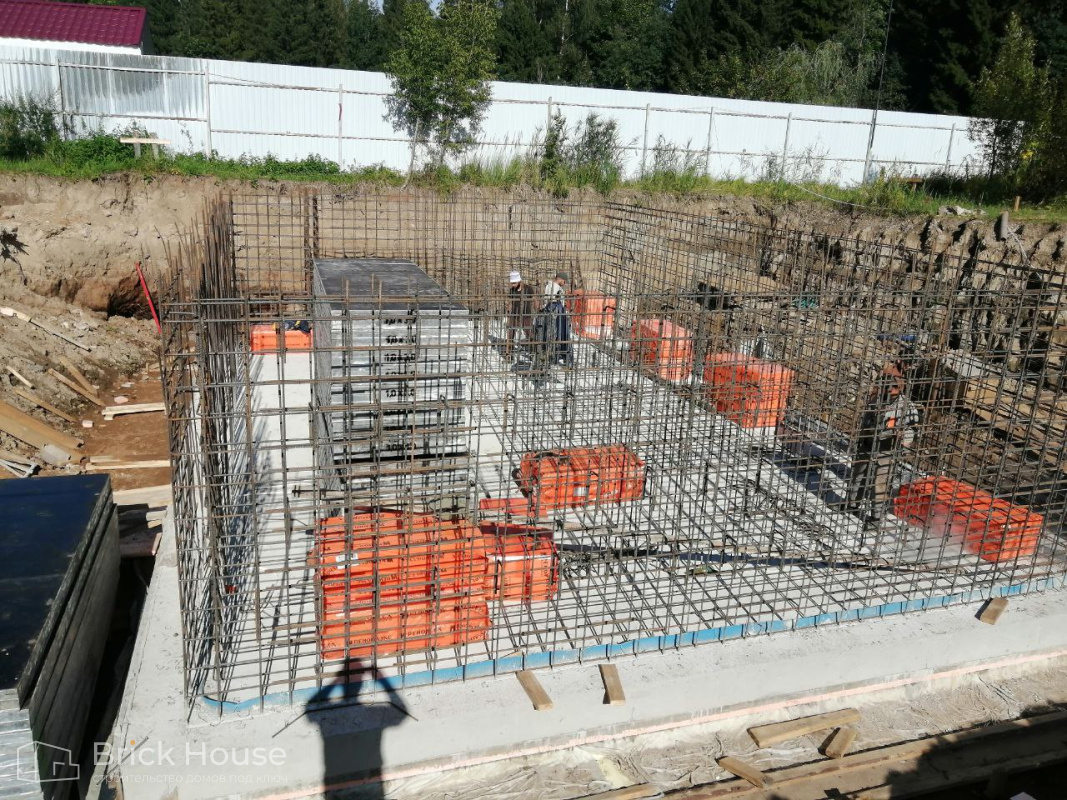 Масштабный и сложный проект одноэтажного дома в стиле хай-тек с уличным монолитным бассейном. Участок заказчика находится у реки, поэтому при рытье котлована под бассейн мы быстро вышли на уровень грунтовых вод. Чтобы осушить котлован, сделали дренаж и гидроизоляцию под основание чаши бассейна.