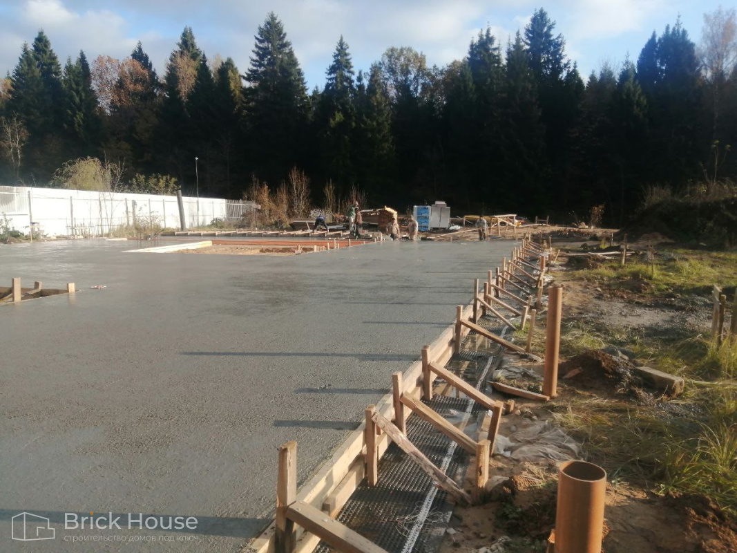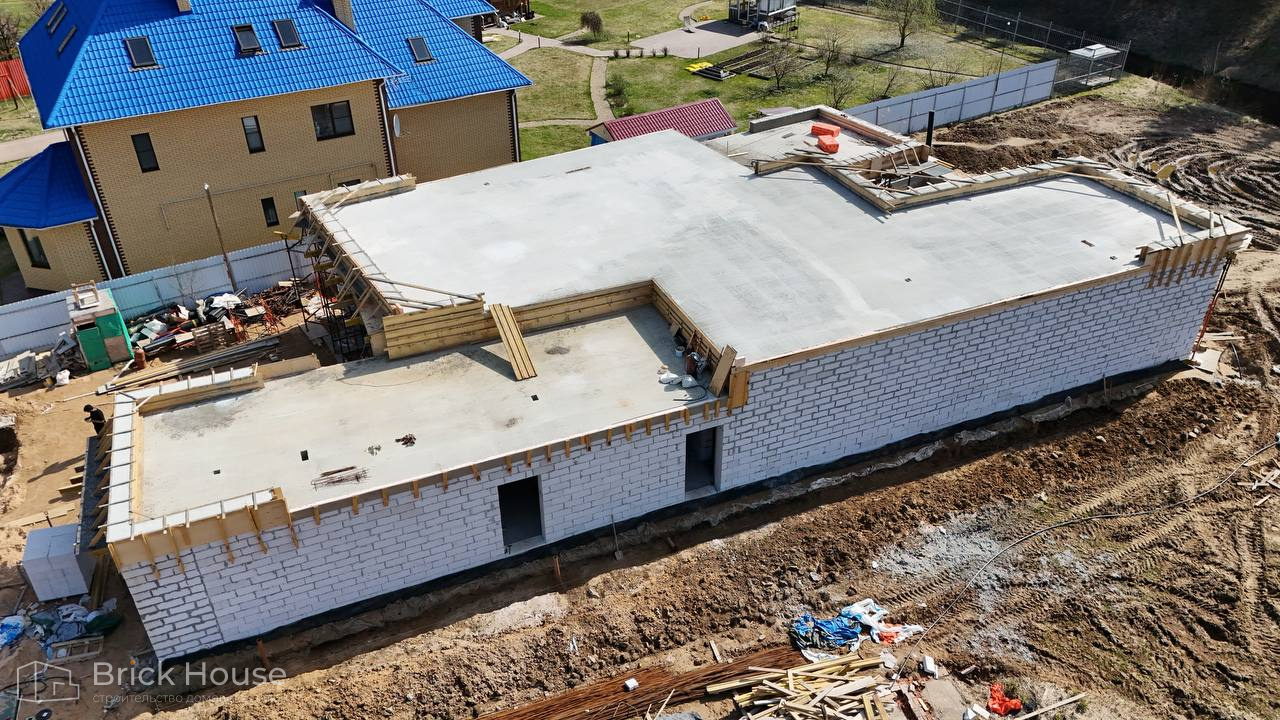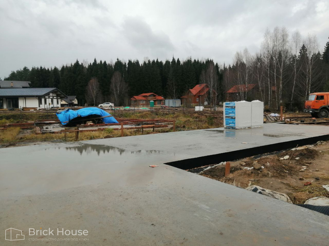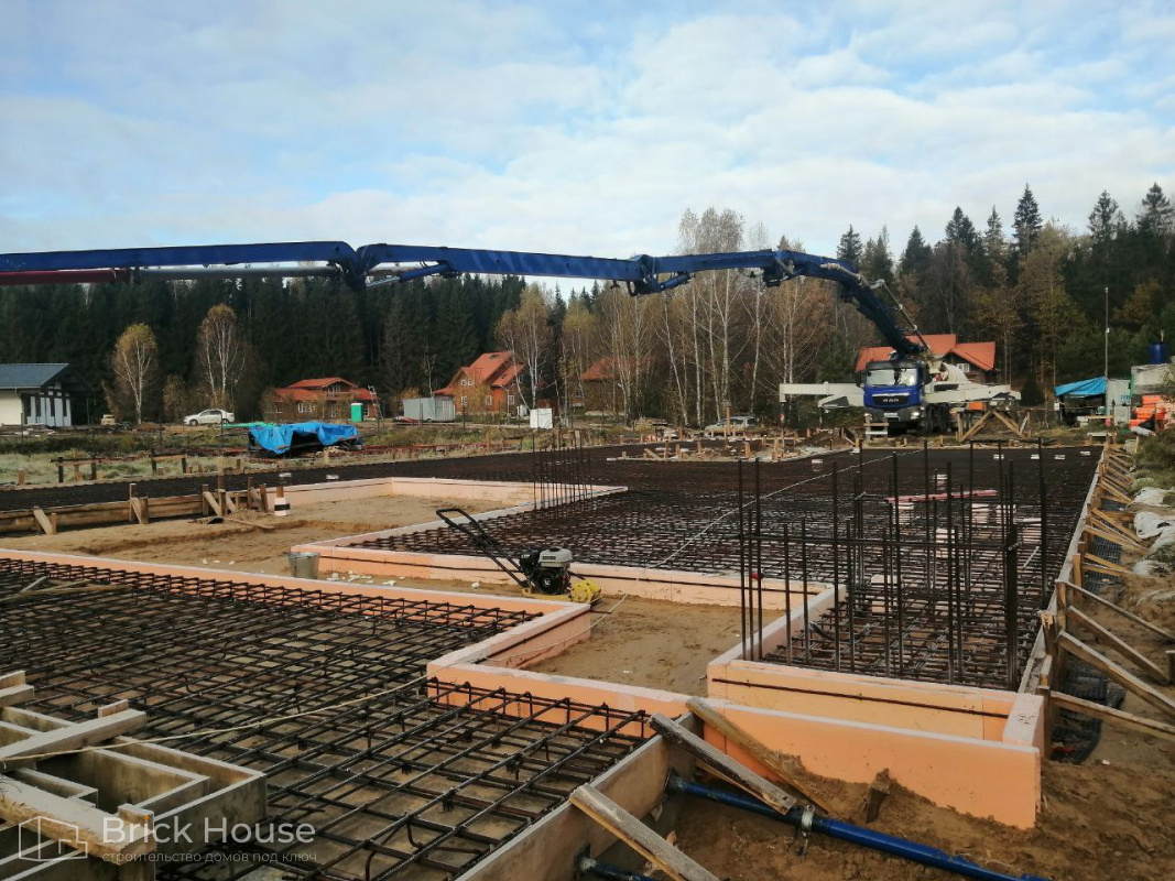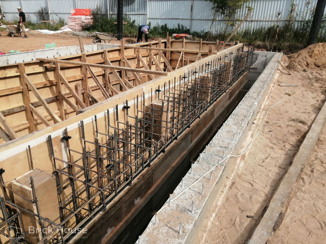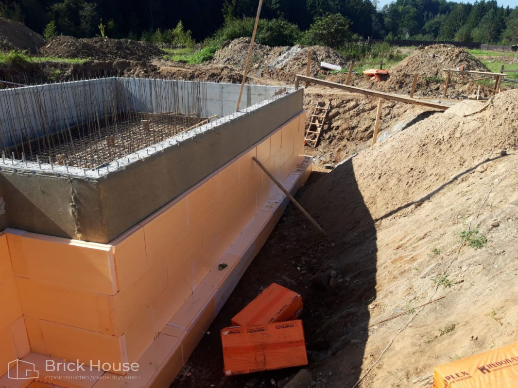 Масштабный и сложный проект одноэтажного дома в стиле хай-тек с уличным монолитным бассейном. Участок заказчика находится у реки, поэтому при рытье котлована под бассейн мы быстро вышли на уровень грунтовых вод. Чтобы осушить котлован, сделали дренаж и гидроизоляцию под основание чаши бассейна.