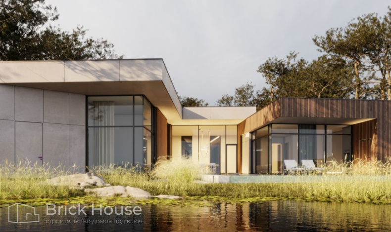 Дом по проекту имеет необычную форму, в виде буквы Н. В центре его будет большая общая зона свободной планировки с гостиной, столовой и кухней. Также в доме 4 спальни, кабинет, большая зона отдыха у бассейна и подсобные помещения. Рядом с домом - отдельностоящий гараж, спроектированный в одном стиле с домом.