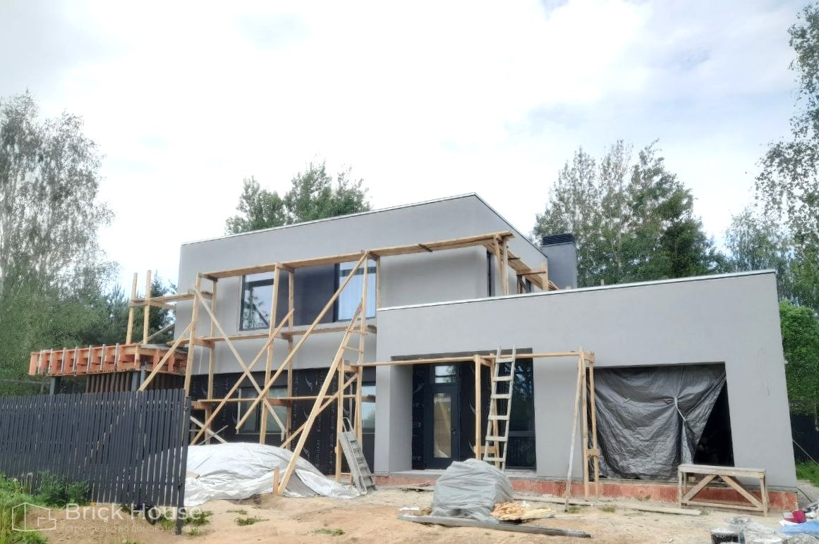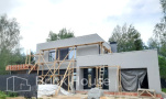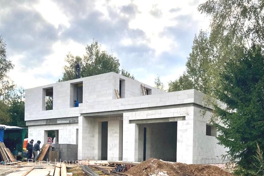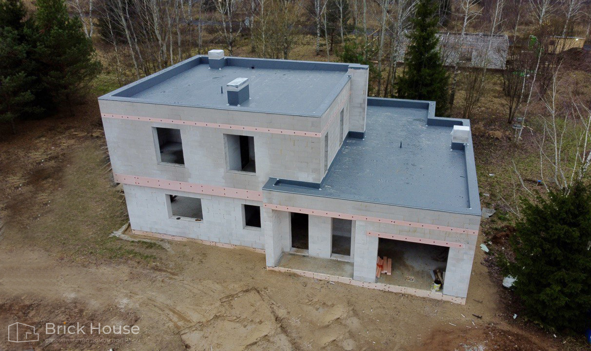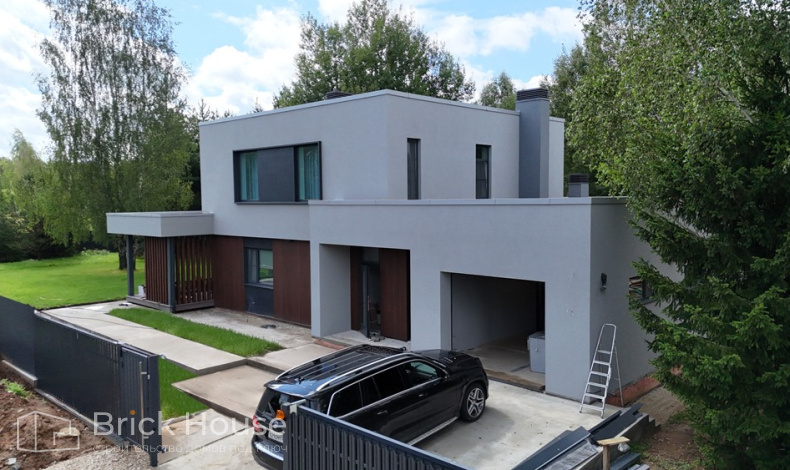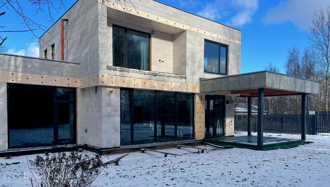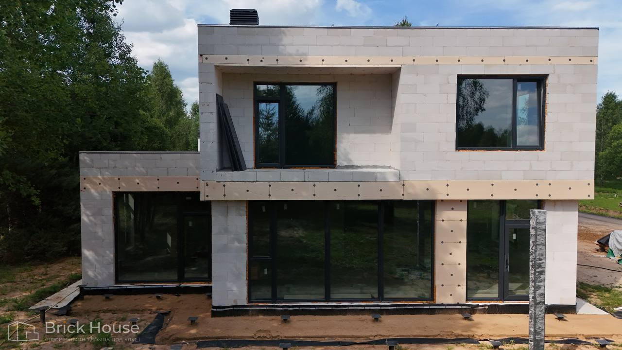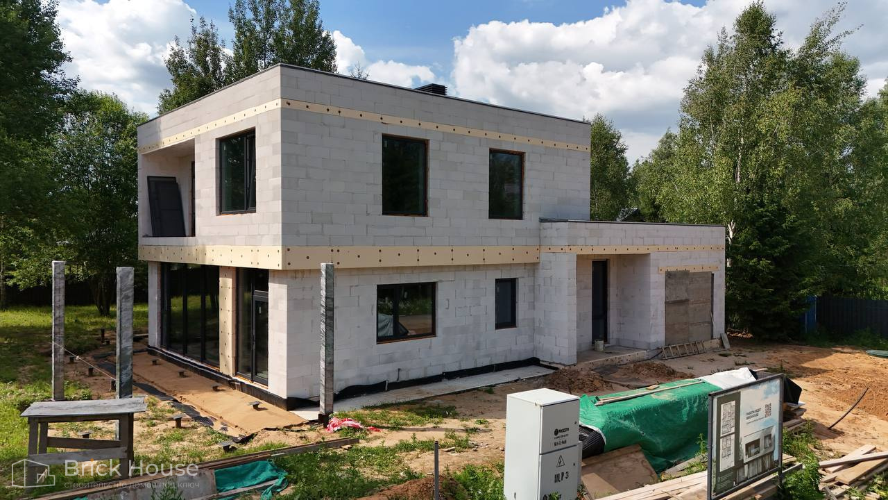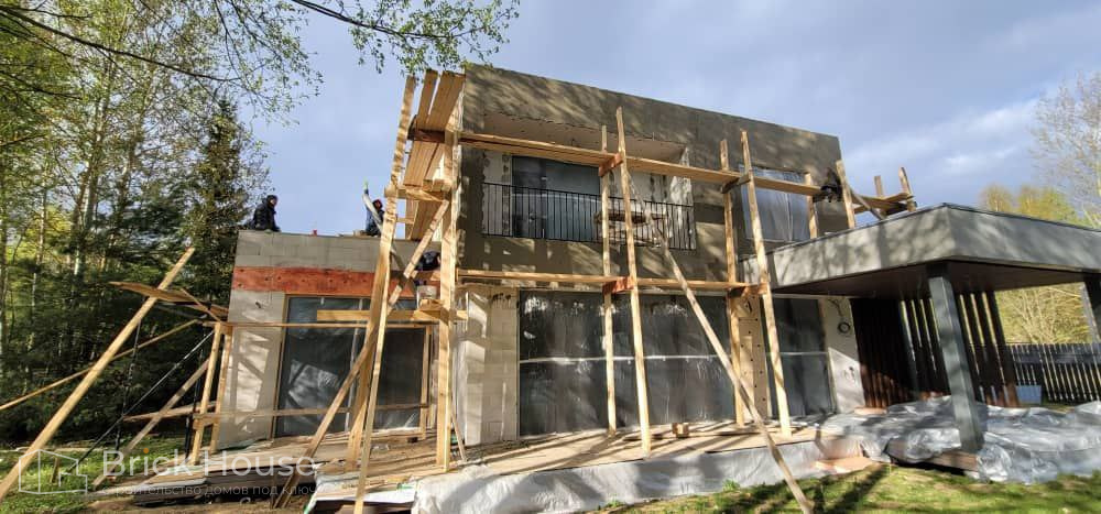 Дом в стиле хай-тек с брутальным фасадом под бетон строится в новом подмосковном поселке Лаки Плейс. Настолько новом, что этот дом будет в нем первым. Для основания дома был выбран тип фундамента монолитная плита. Стены - из газоблока.