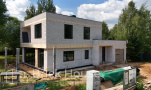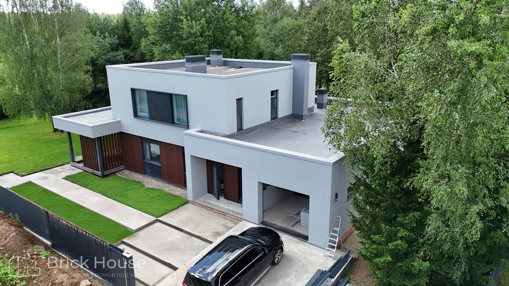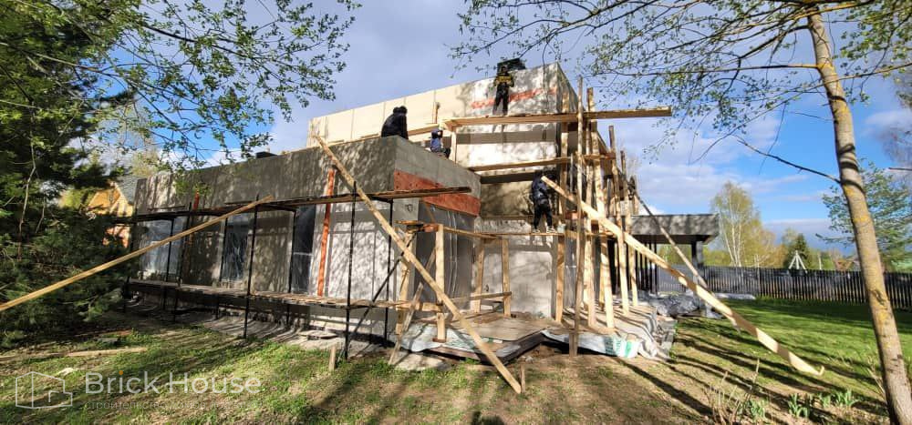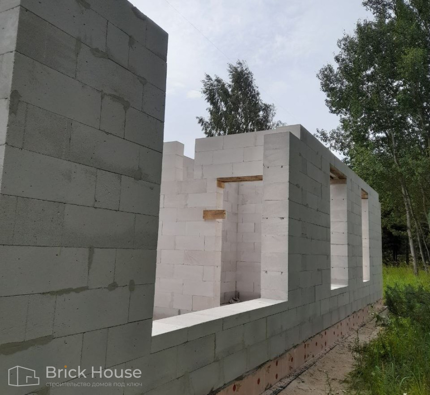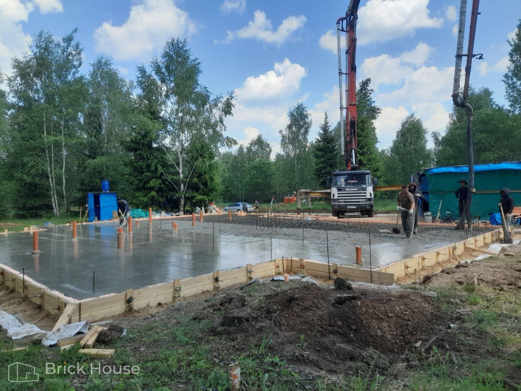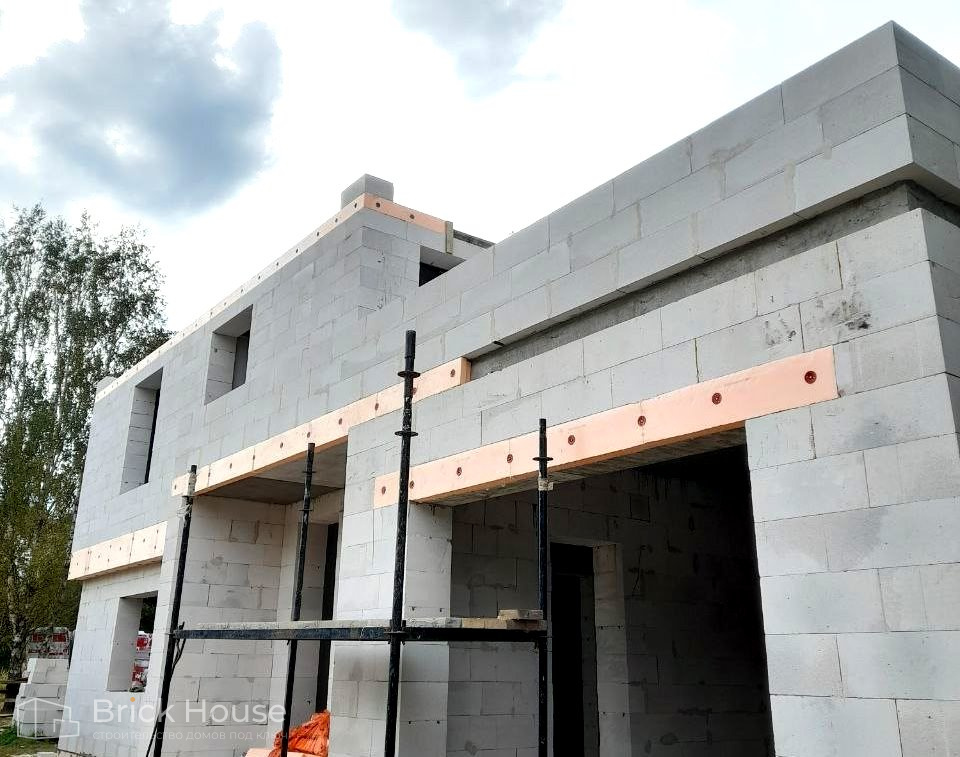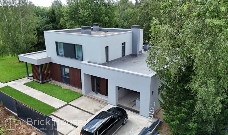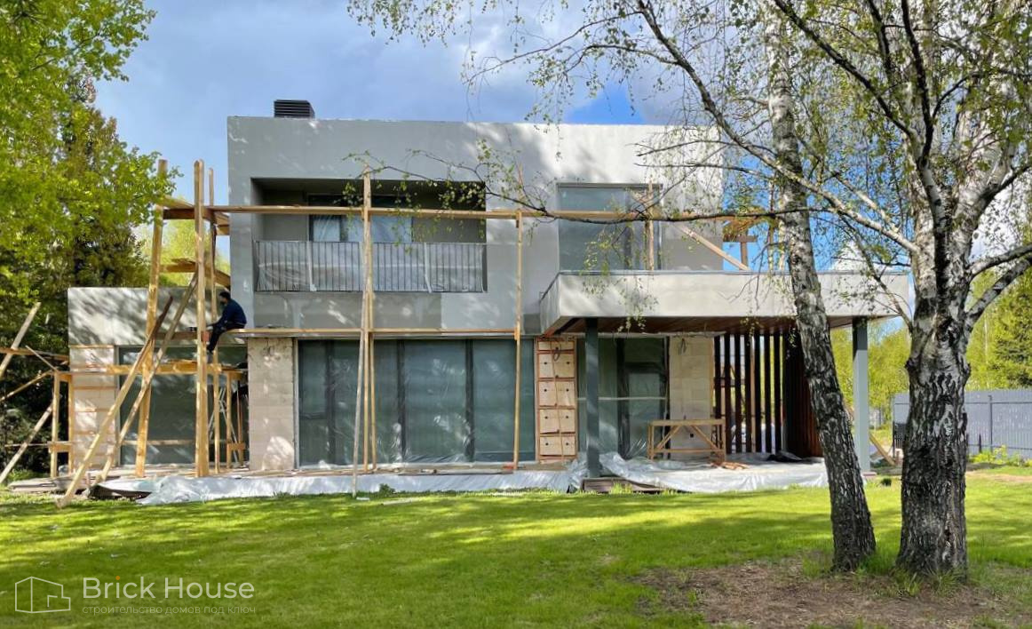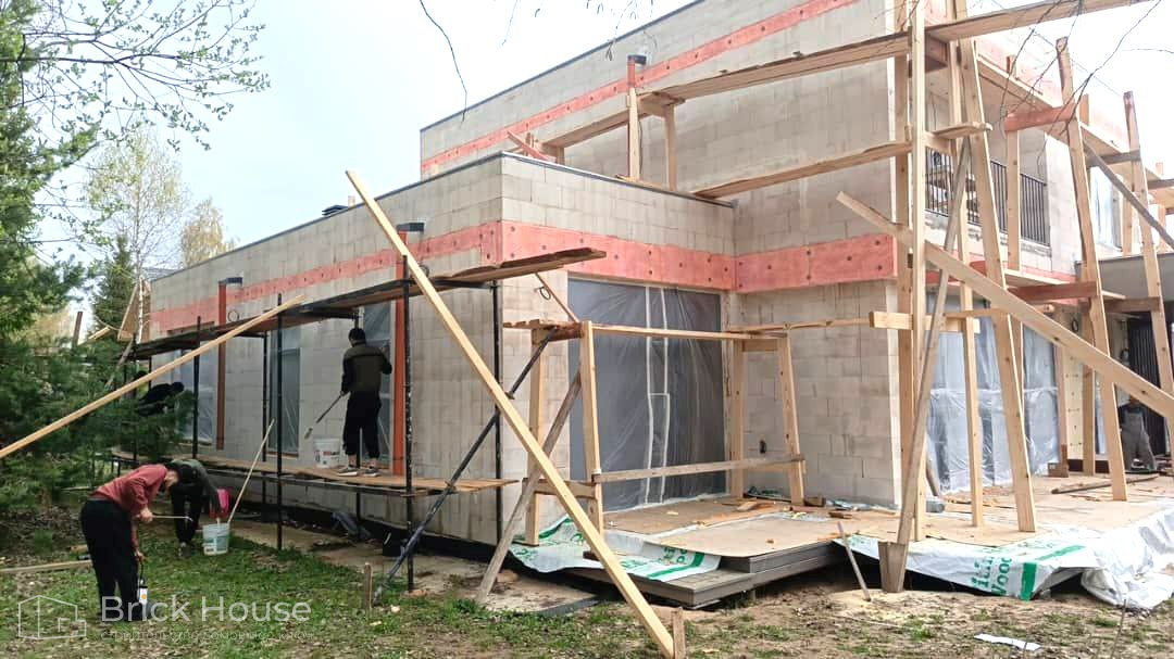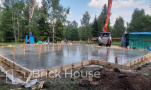 Дом в стиле хай-тек с брутальным фасадом под бетон строится в новом подмосковном поселке Лаки Плейс. Настолько новом, что этот дом будет в нем первым. Для основания дома был выбран тип фундамента монолитная плита. Стены - из газоблока.