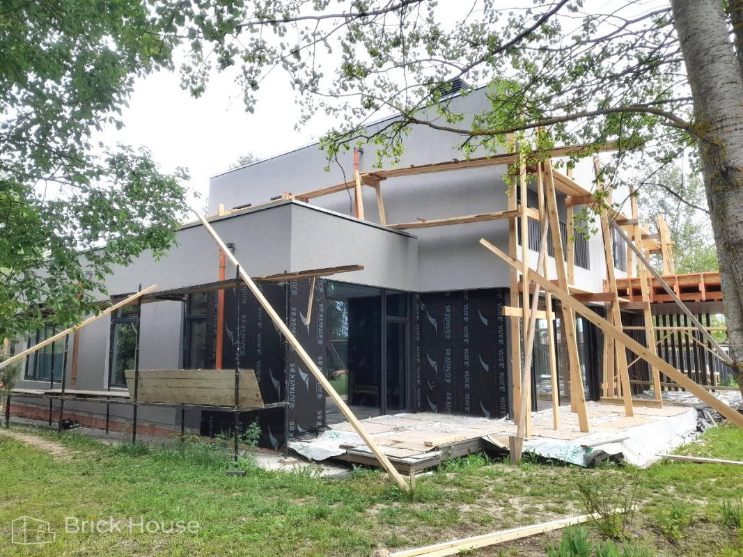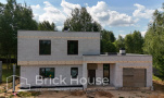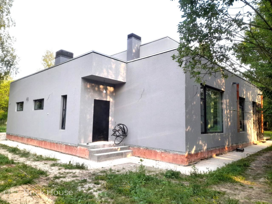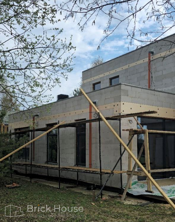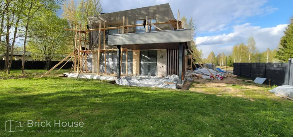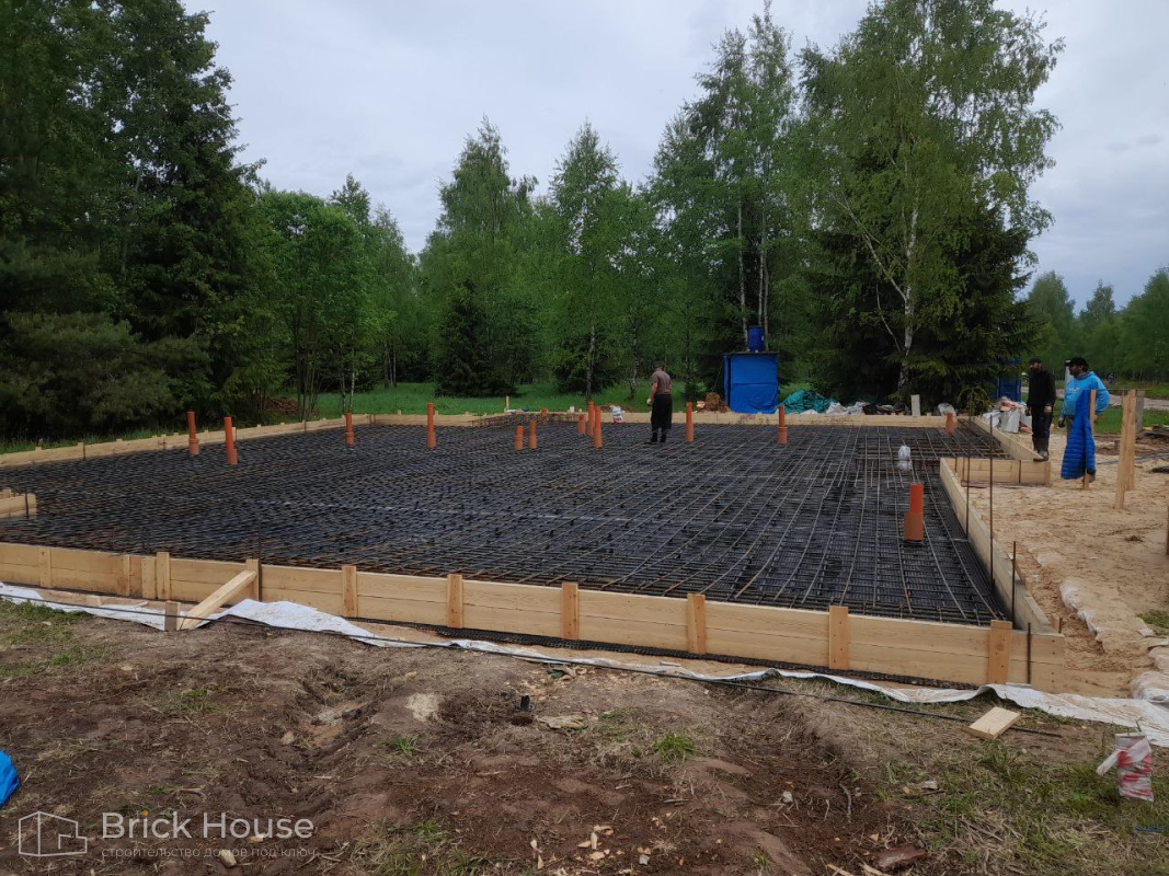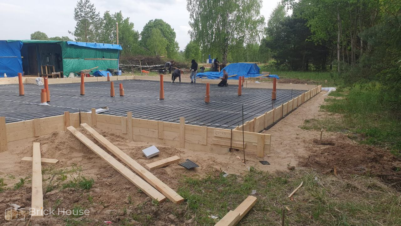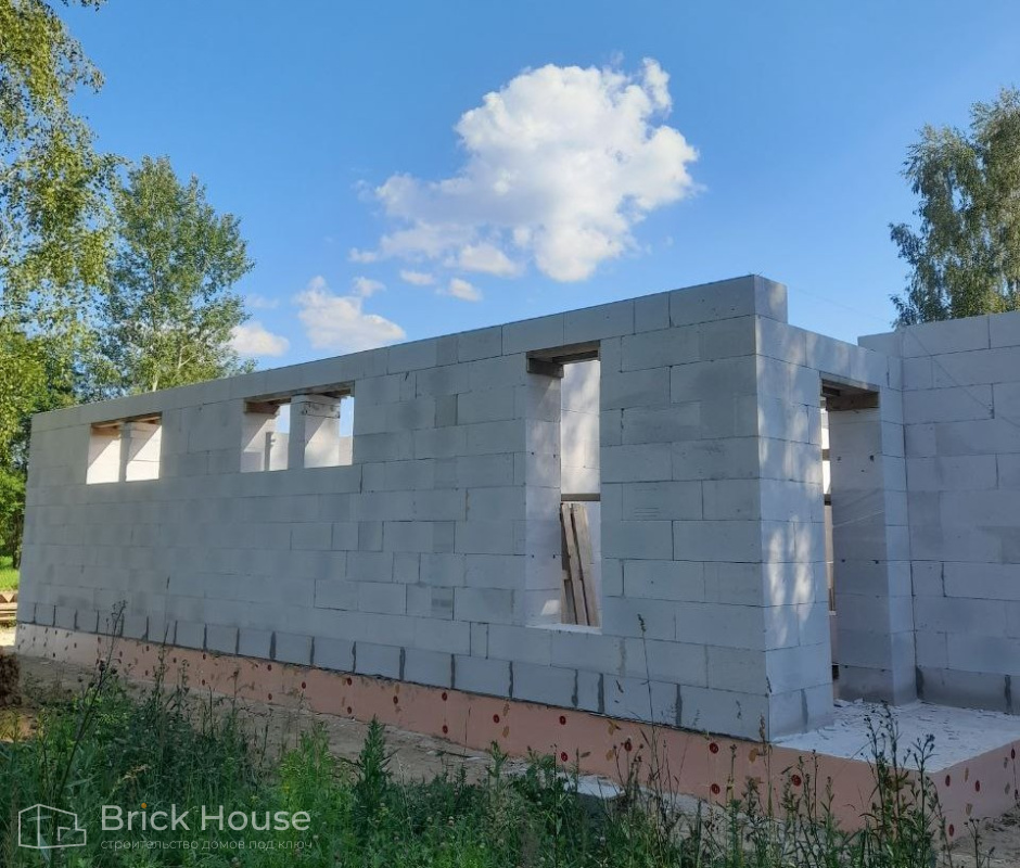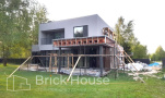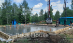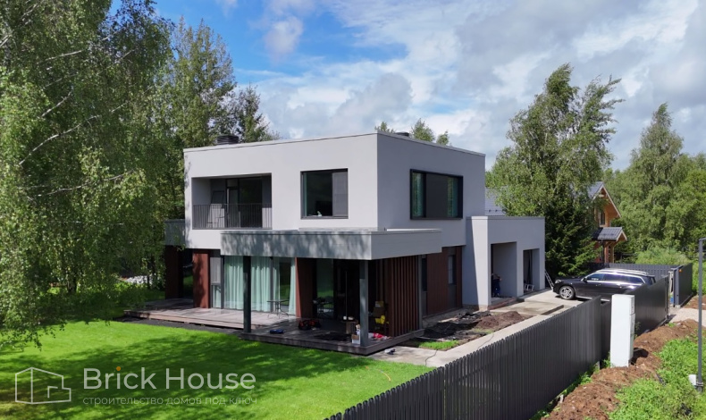 Дом в стиле хай-тек с брутальным фасадом под бетон строится в новом подмосковном поселке Лаки Плейс. Настолько новом, что этот дом будет в нем первым. Для основания дома был выбран тип фундамента монолитная плита. Стены - из газоблока.