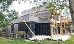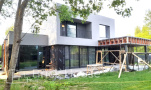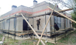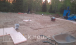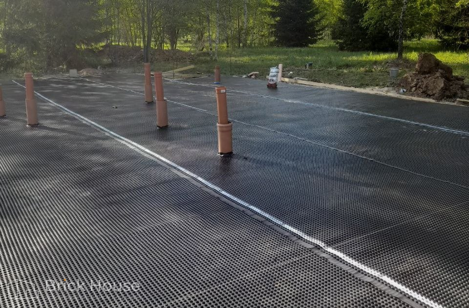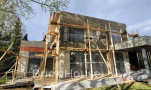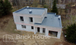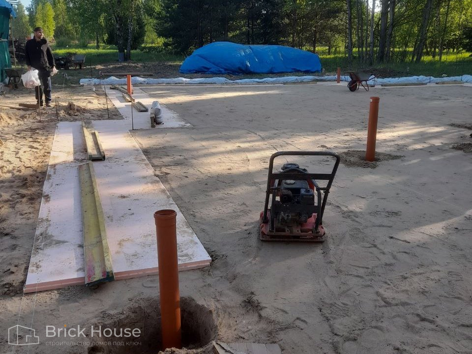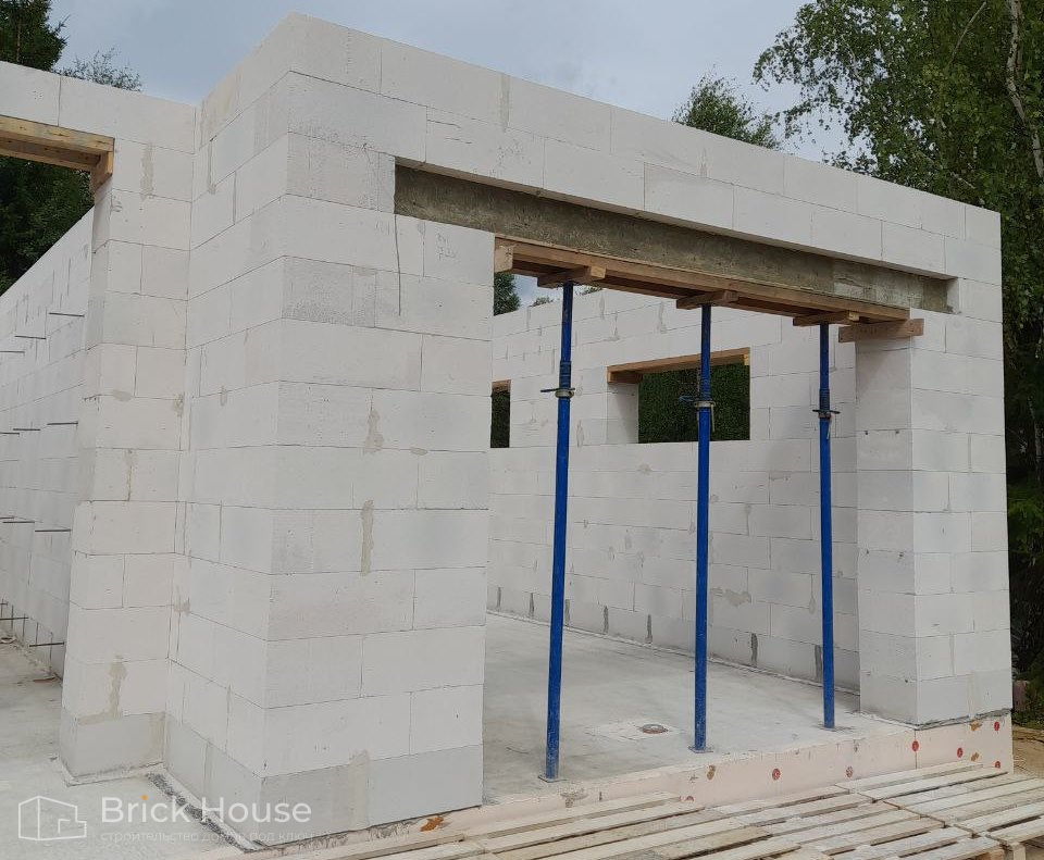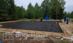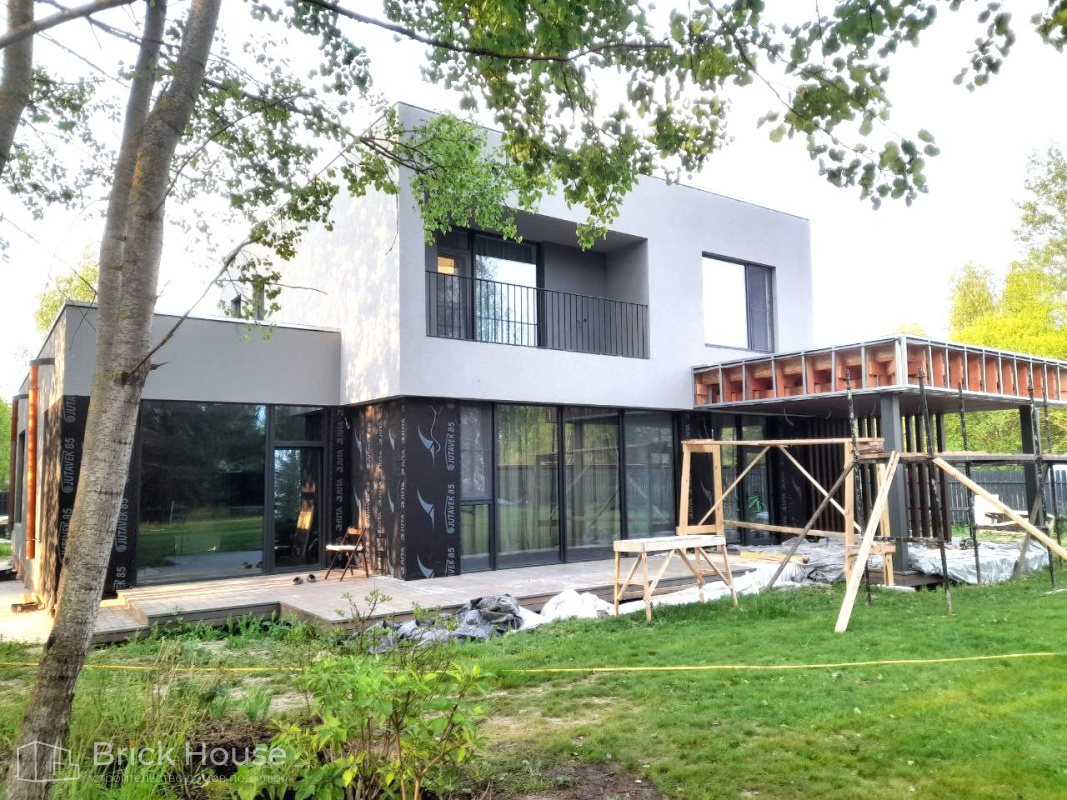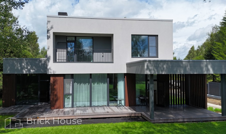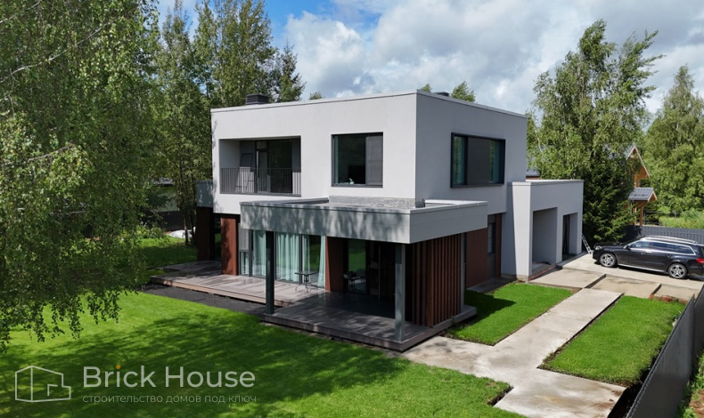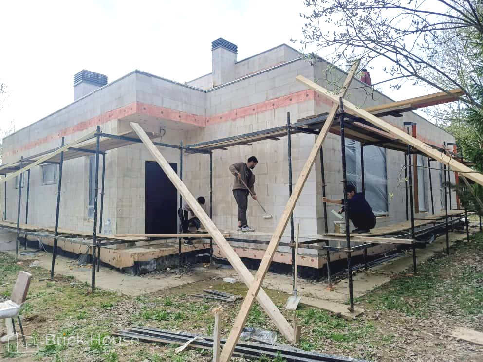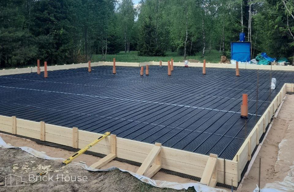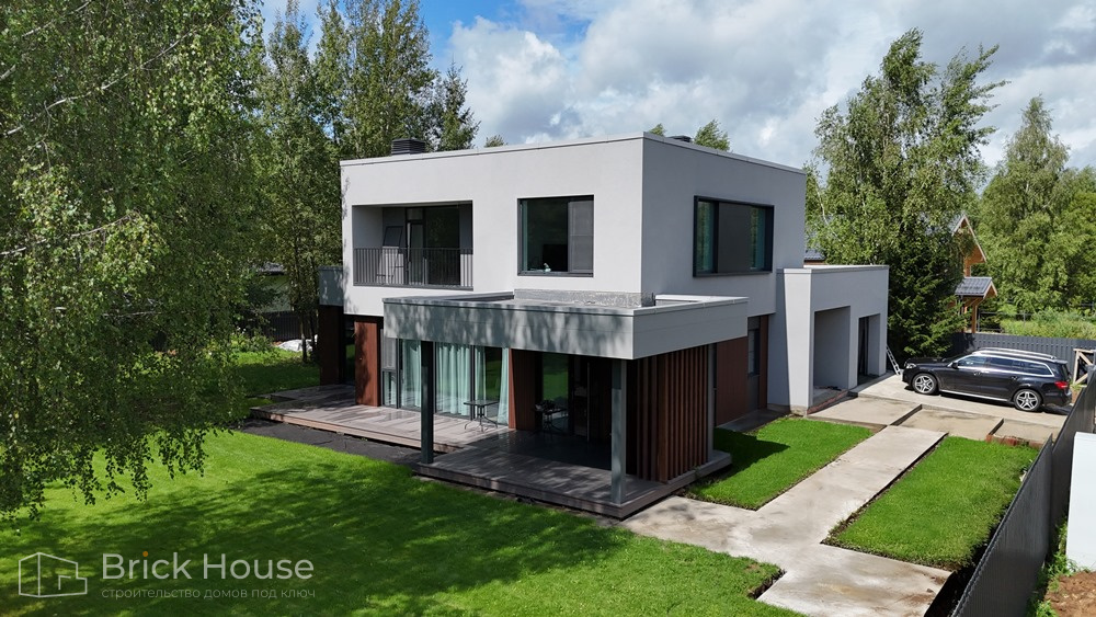 Дом в стиле хай-тек с брутальным фасадом под бетон строится в новом подмосковном поселке Лаки Плейс. Настолько новом, что этот дом будет в нем первым. Для основания дома был выбран тип фундамента монолитная плита. Стены - из газоблока.