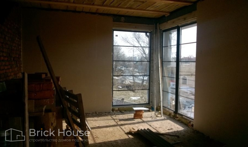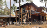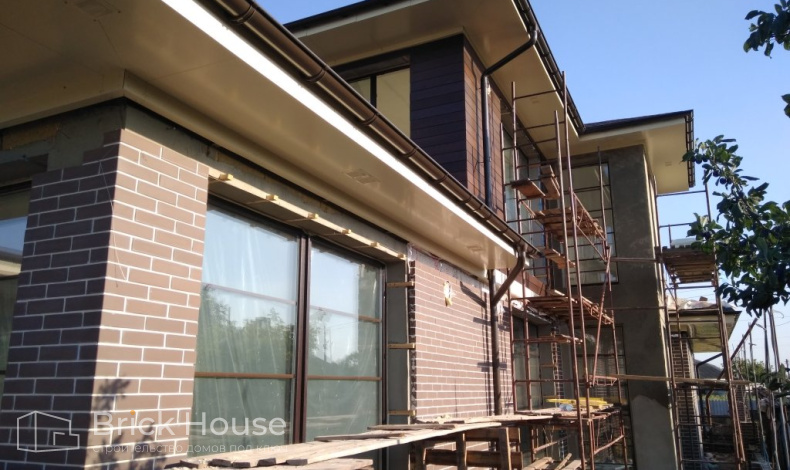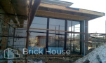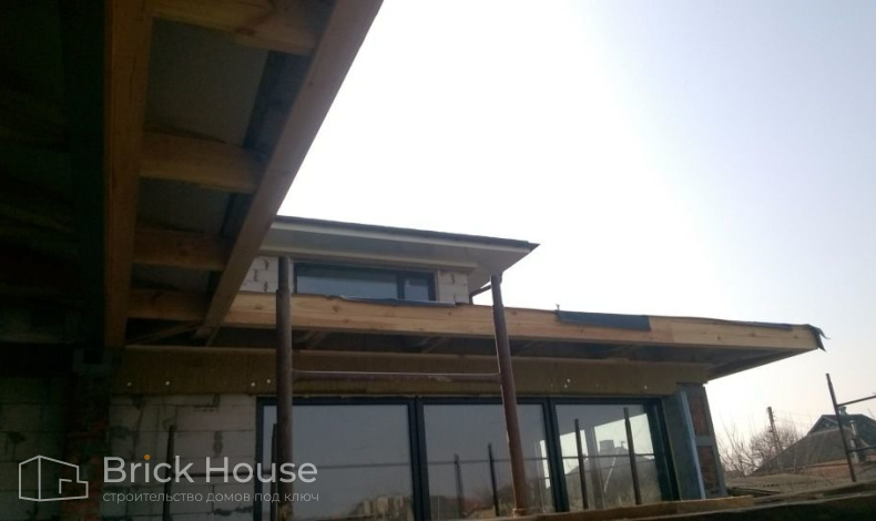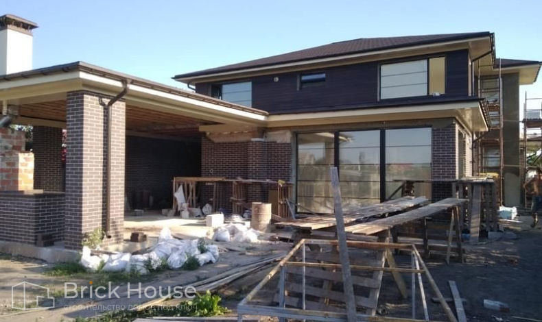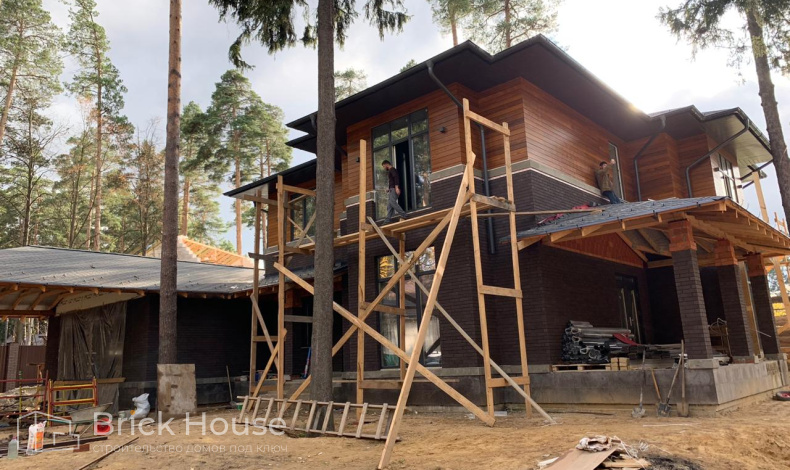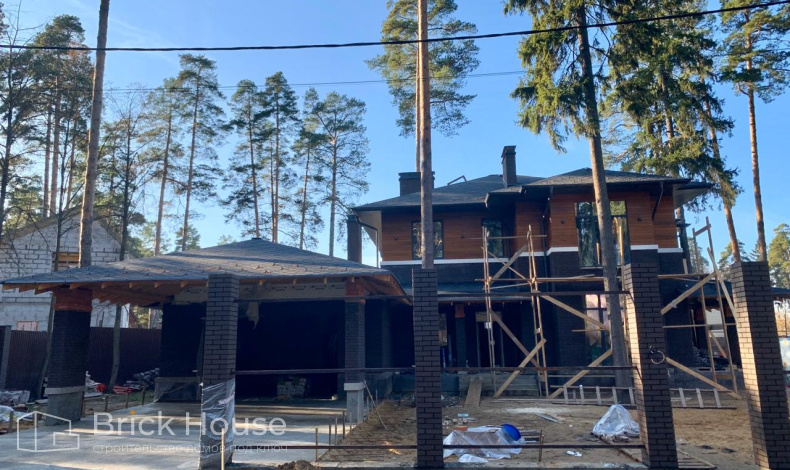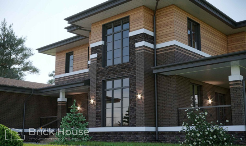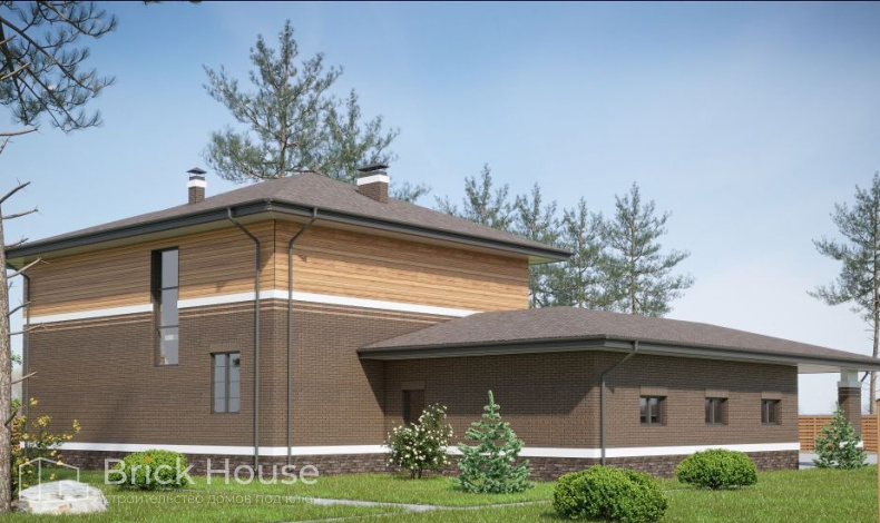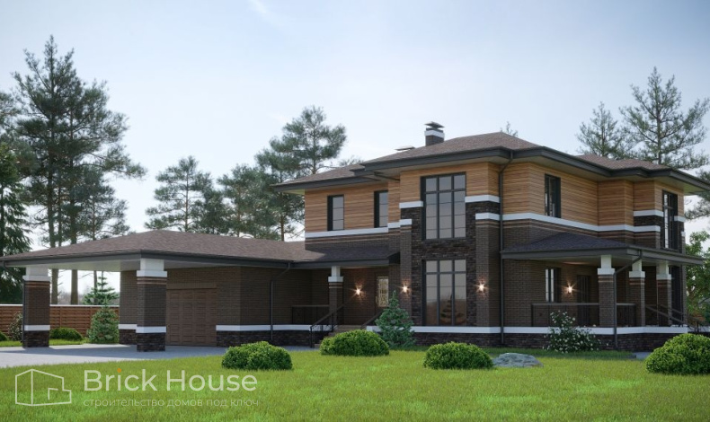 Просторный дом в стиле Райта по проекту RH-338 отличается своей представительностью и презентабельным внешним видом. Этот эффект достигается за счет удачной комбинации отделочных материалов фасада: камня, кирпича и лиственницы. Особняк бизнес-класса включает 5 просторных спален, 2 санузла и большой теплый гараж с навесом.