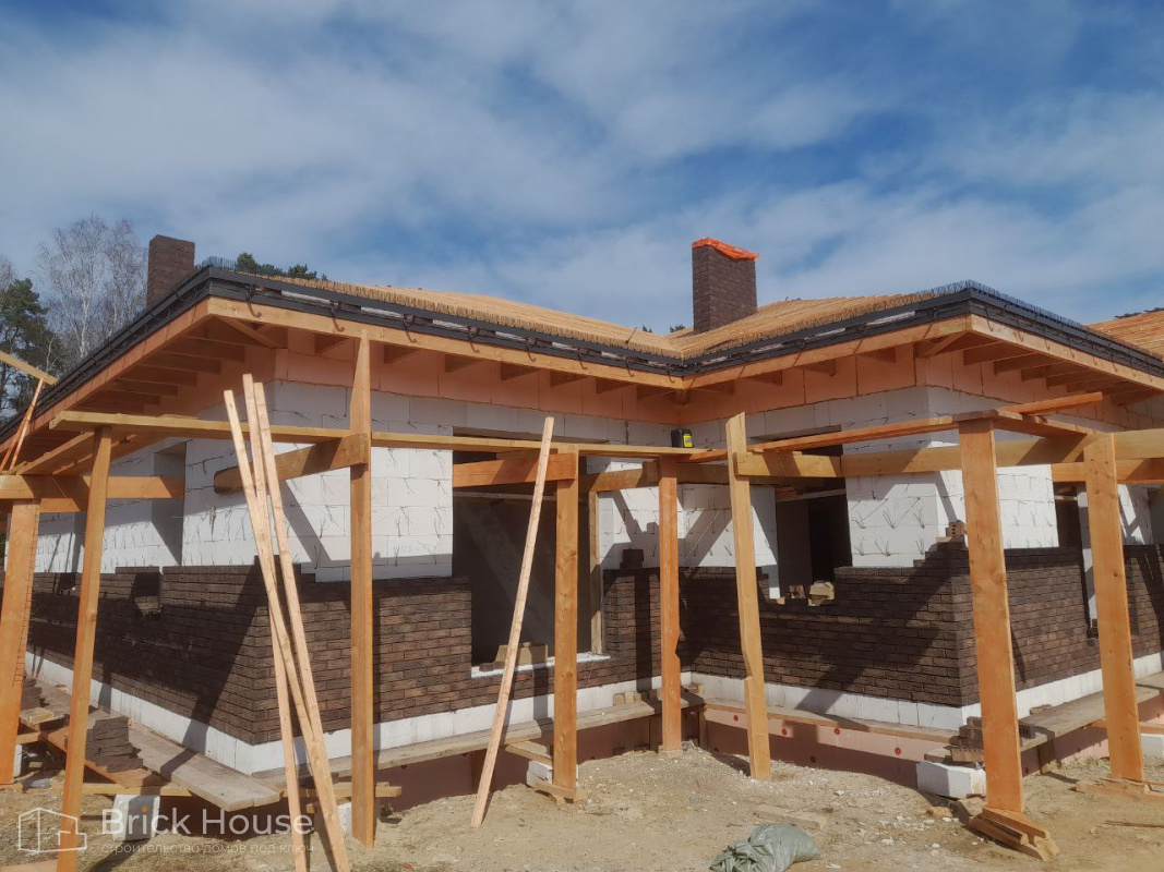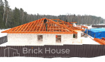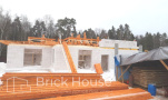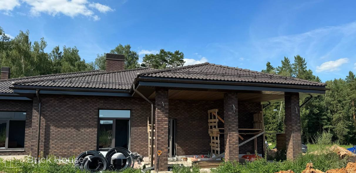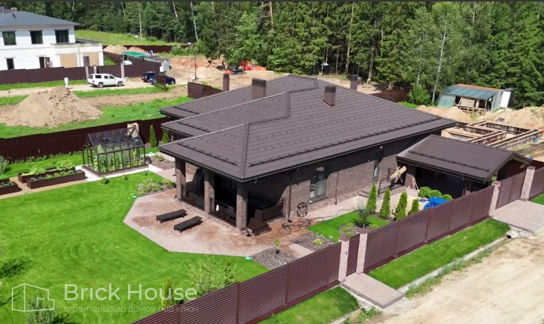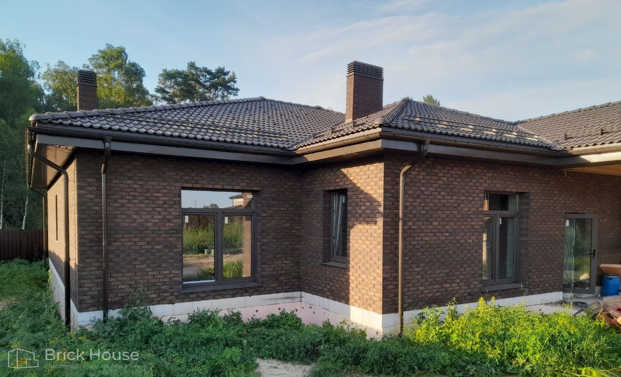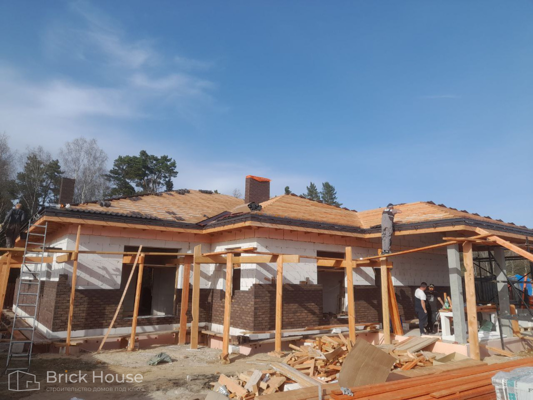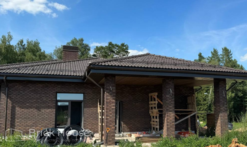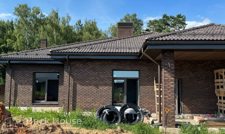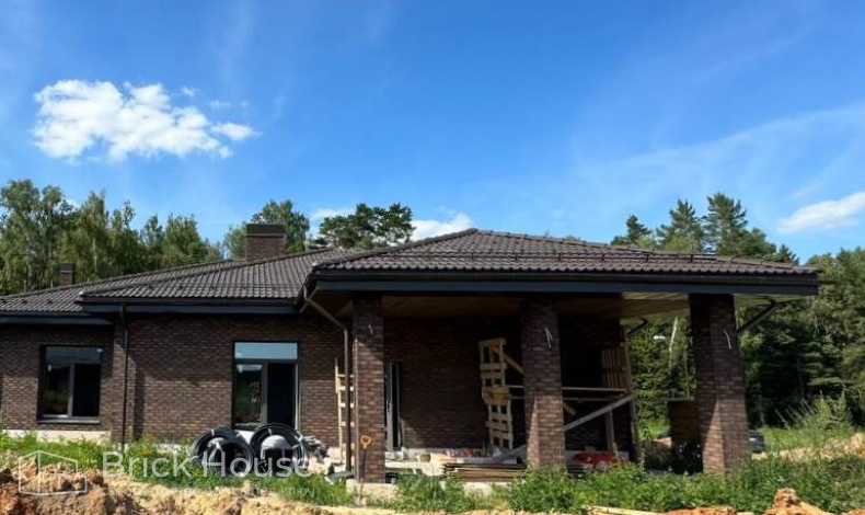 Это уже третий наш объект, который мы реализуем в коттеджном поселке Грин Форест Клаб. Одноэтажный жилой дом в классическом стиле с кухней-гостиной, 3 спальнями, небольшой парной и гаражом. Для данного объекта был выбран ленточный фундамент. Стены возведены из газоблока, фасад отделан облицовочным кирпичом. Кровля сложная – вальмовая - с покрытием цементно-песчаной черепицей.