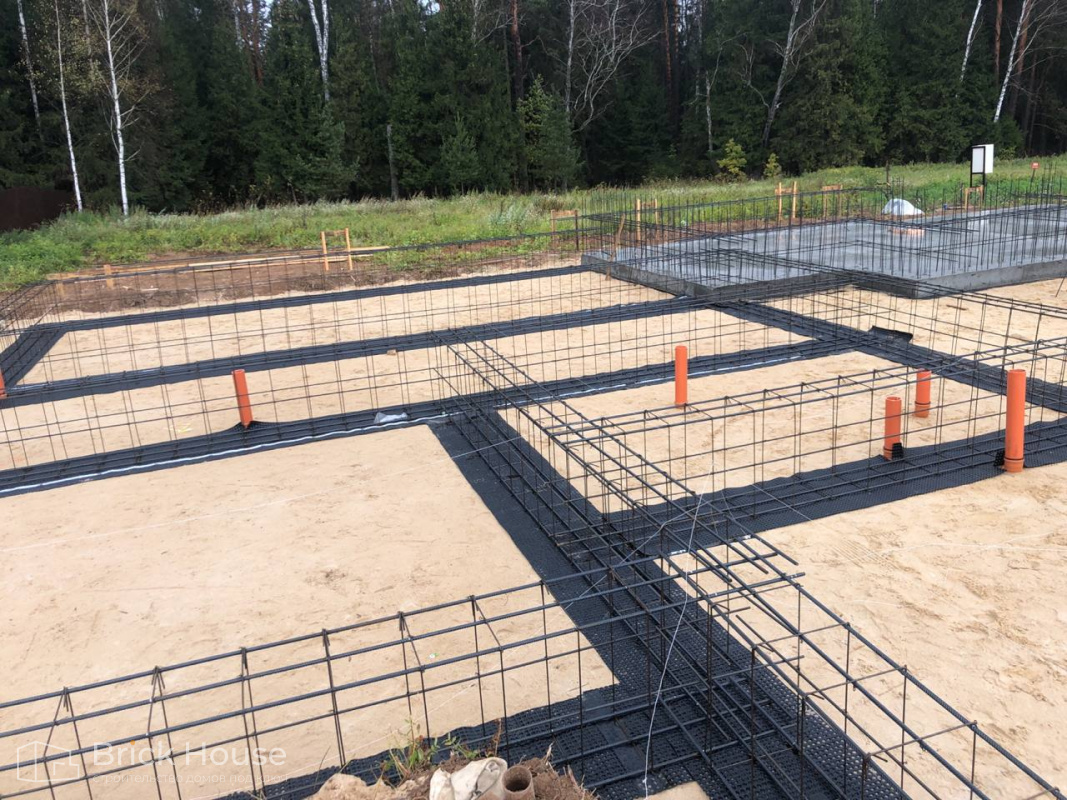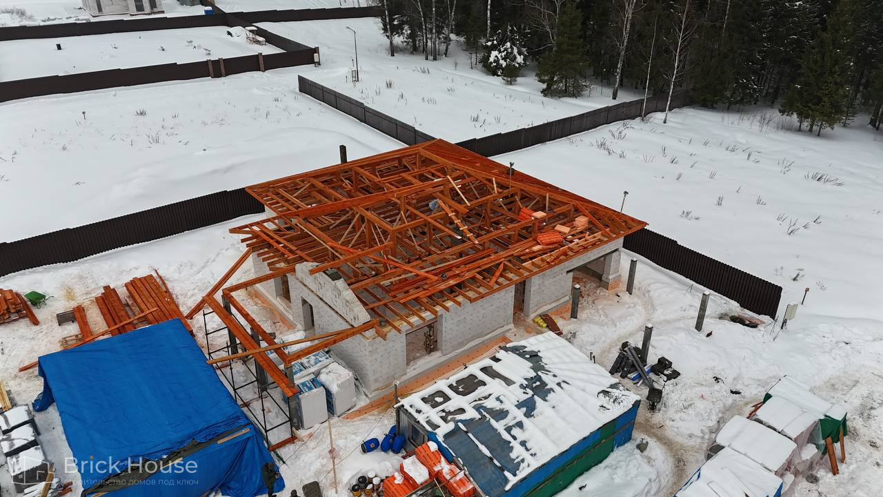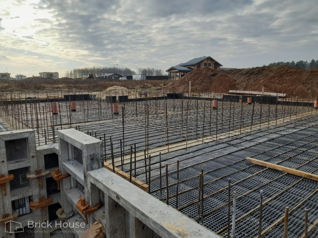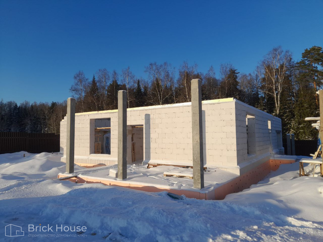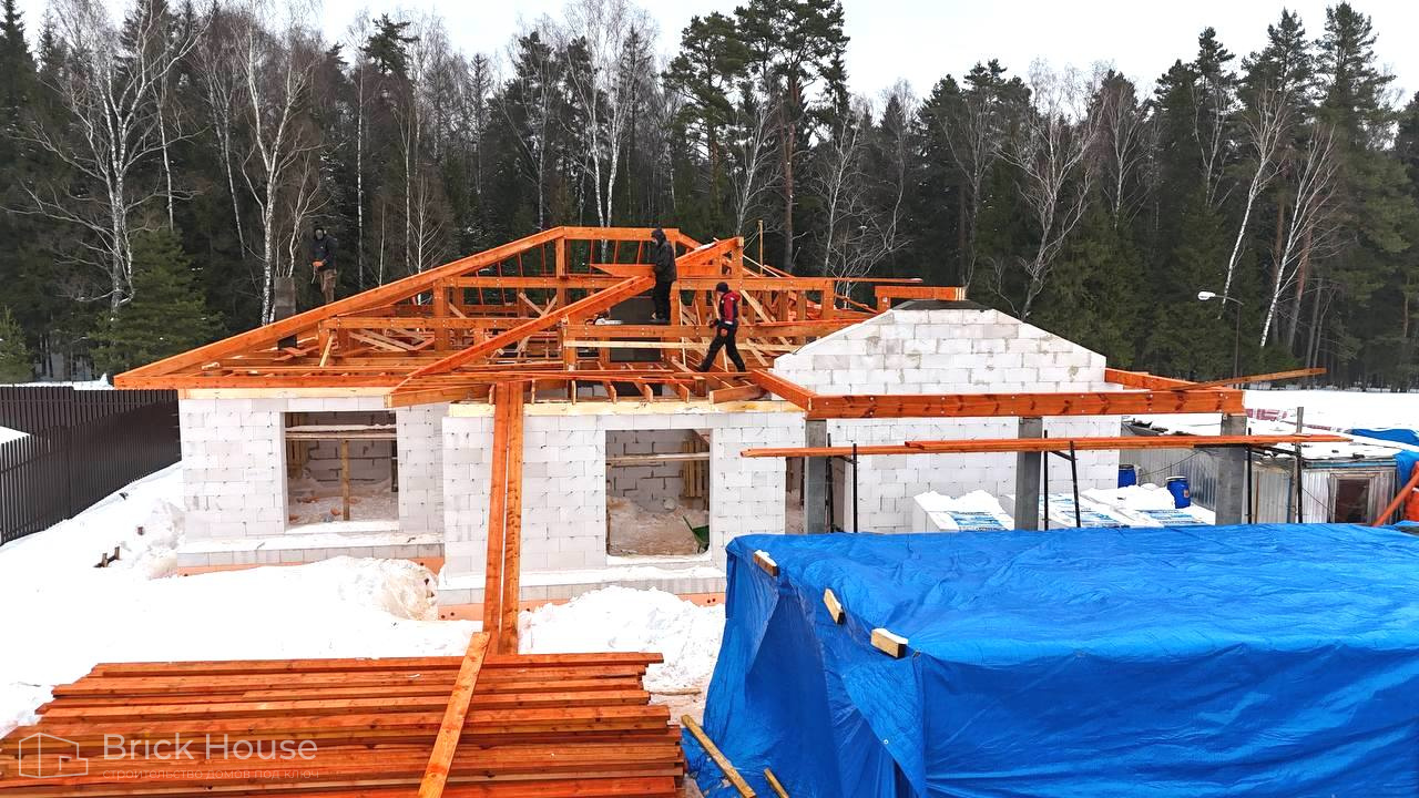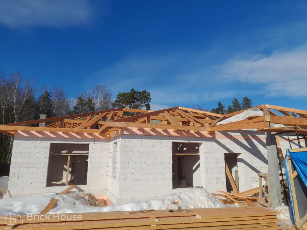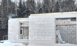 Это уже третий наш объект, который мы реализуем в коттеджном поселке Грин Форест Клаб. Одноэтажный жилой дом в классическом стиле с кухней-гостиной, 3 спальнями, небольшой парной и гаражом. Для данного объекта был выбран ленточный фундамент. Стены возведены из газоблока, фасад отделан облицовочным кирпичом. Кровля сложная – вальмовая - с покрытием цементно-песчаной черепицей.
