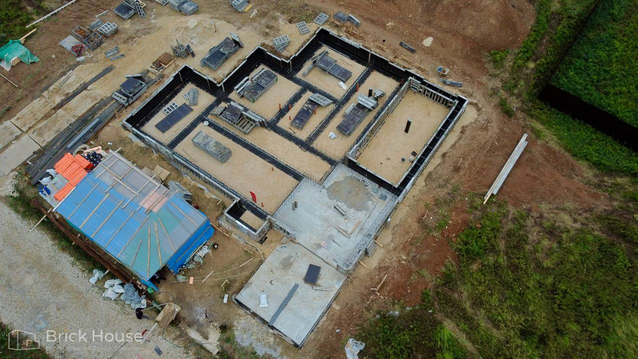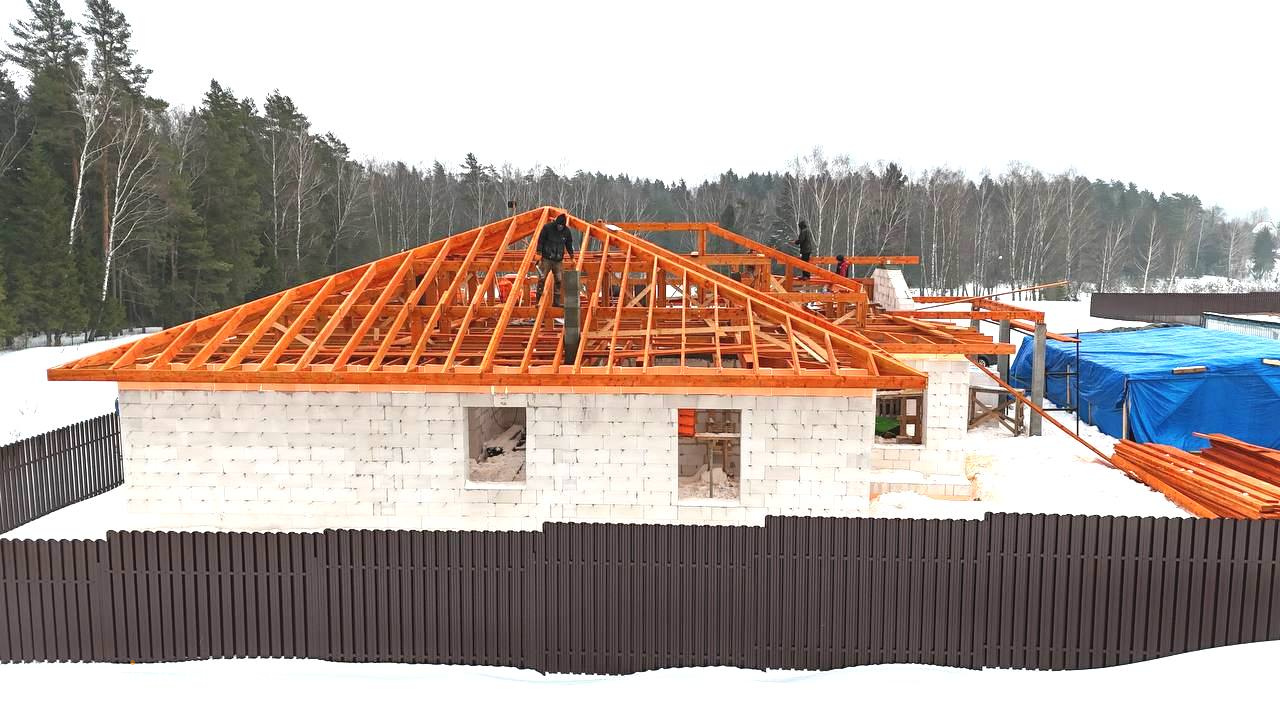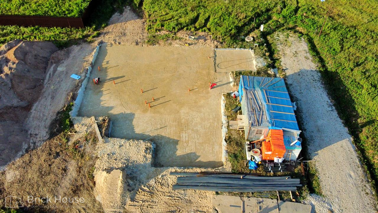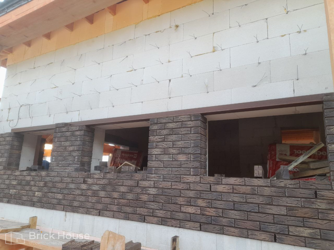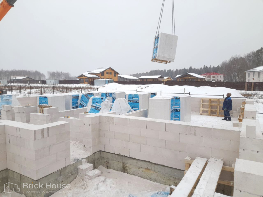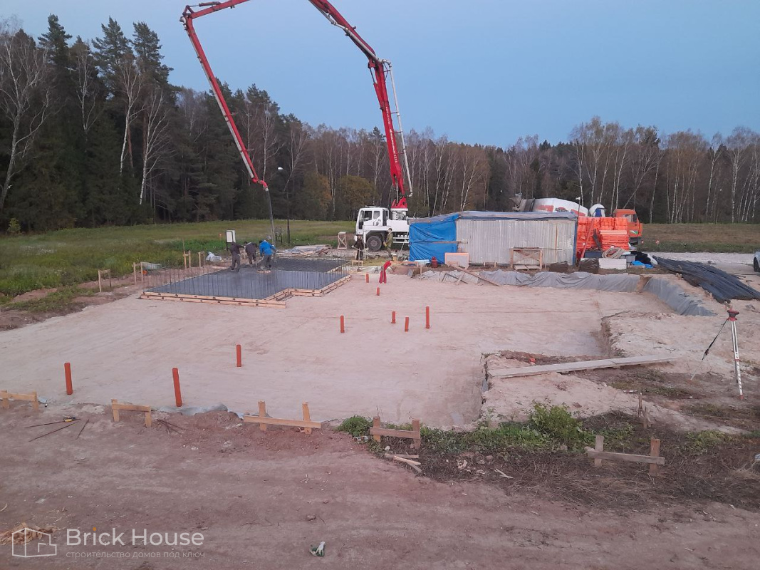 Это уже третий наш объект, который мы реализуем в коттеджном поселке Грин Форест Клаб. Одноэтажный жилой дом в классическом стиле с кухней-гостиной, 3 спальнями, небольшой парной и гаражом. Для данного объекта был выбран ленточный фундамент. Стены возведены из газоблока, фасад отделан облицовочным кирпичом. Кровля сложная – вальмовая - с покрытием цементно-песчаной черепицей.