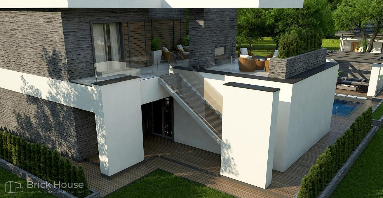 Для отделки фасада используют природный камень, кирпич, большие керамогранитные плиты, планкен (фасадный материал из термодревесины), а также их комбинации. Долговечность этих материалов обеспечивает длительную эксплуатацию без капремонта. Популярный элемент — это плоская крыша, на которой можно устраивать вечеринки, организовать террасу или целую оранжерею.