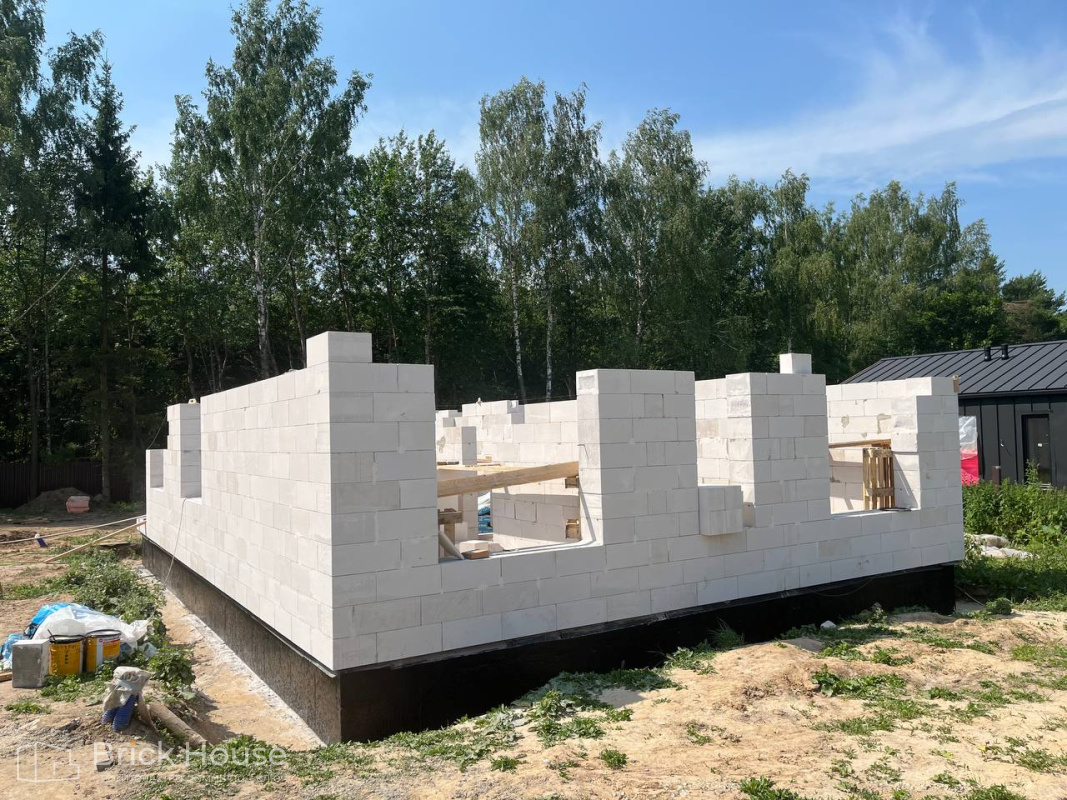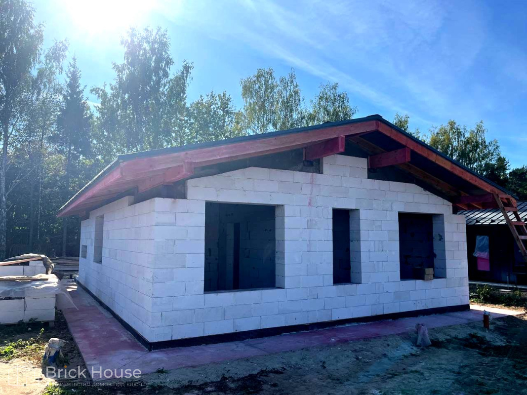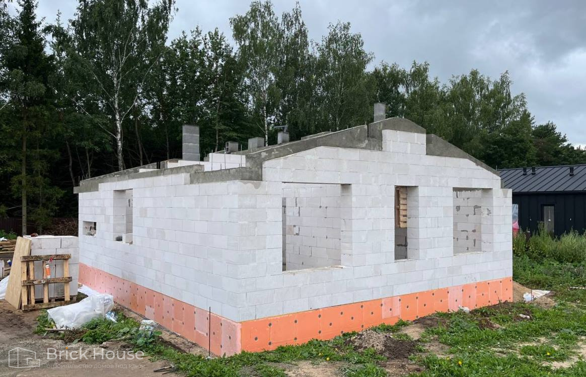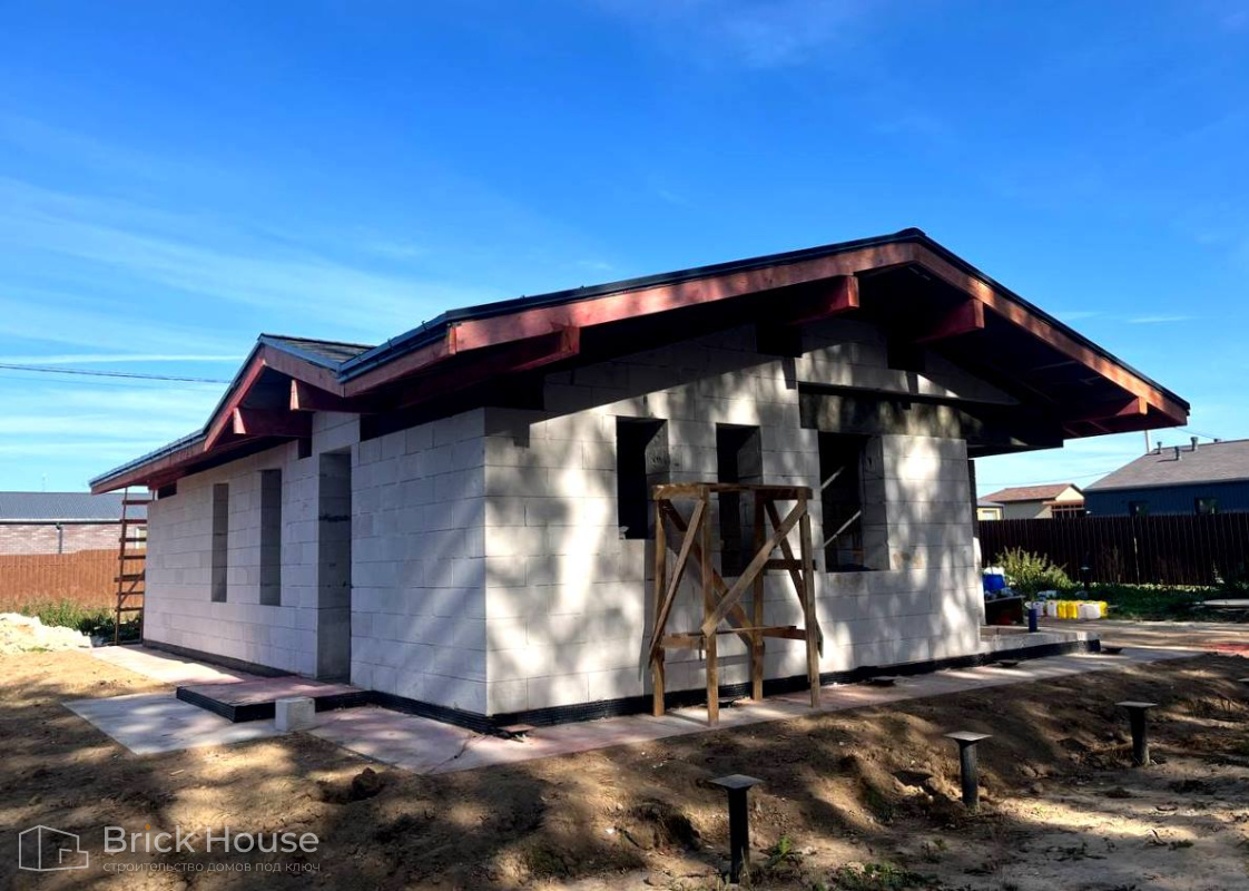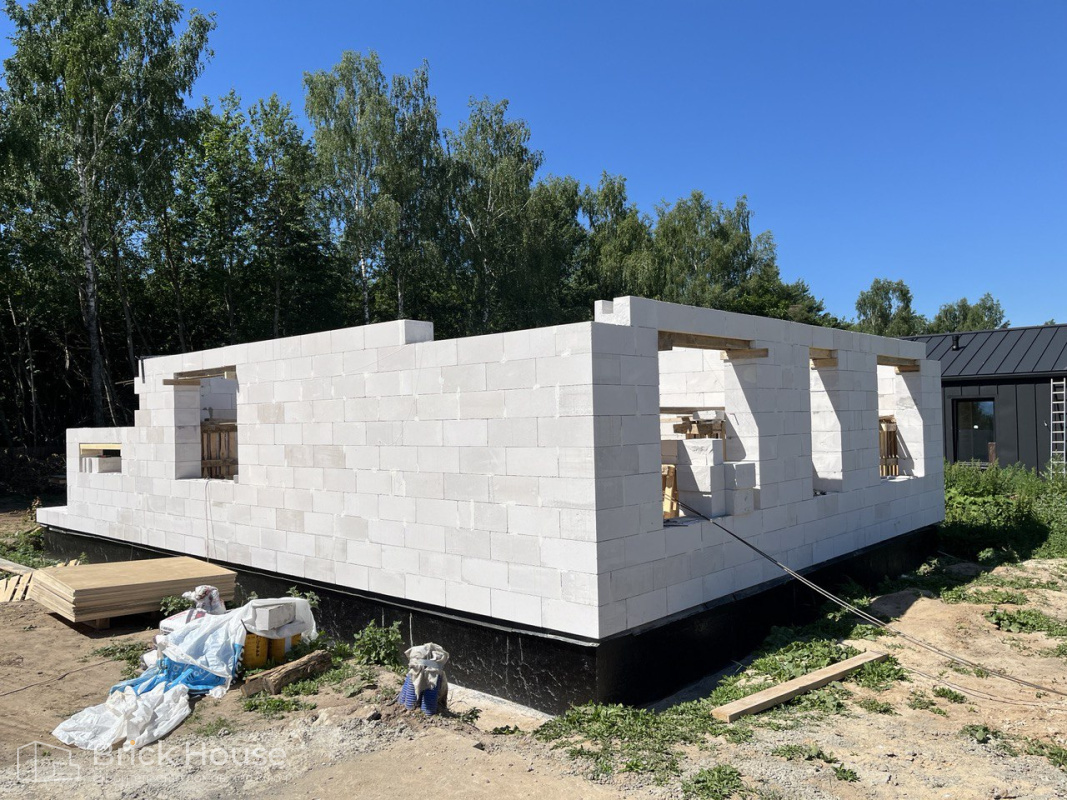 Наш первый объект, реализуемый по проекту K-100. Одноэтажный дом с кухней-гостиной, тремя спальнями, прихожей, гардеробной, двумя санузлами и бойлерной. На улице - 19-метровая терраса. Прекрасная альтернатива городской квартире. Тип фундамента на данном объекте - плита с ребрами жесткости. Стены из газобетонных блоков. Покрытие кровли - мягкая черепица. В отделке фасада использовали клинкерную плитку.