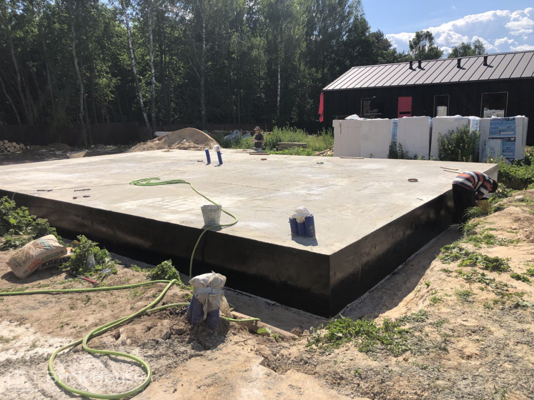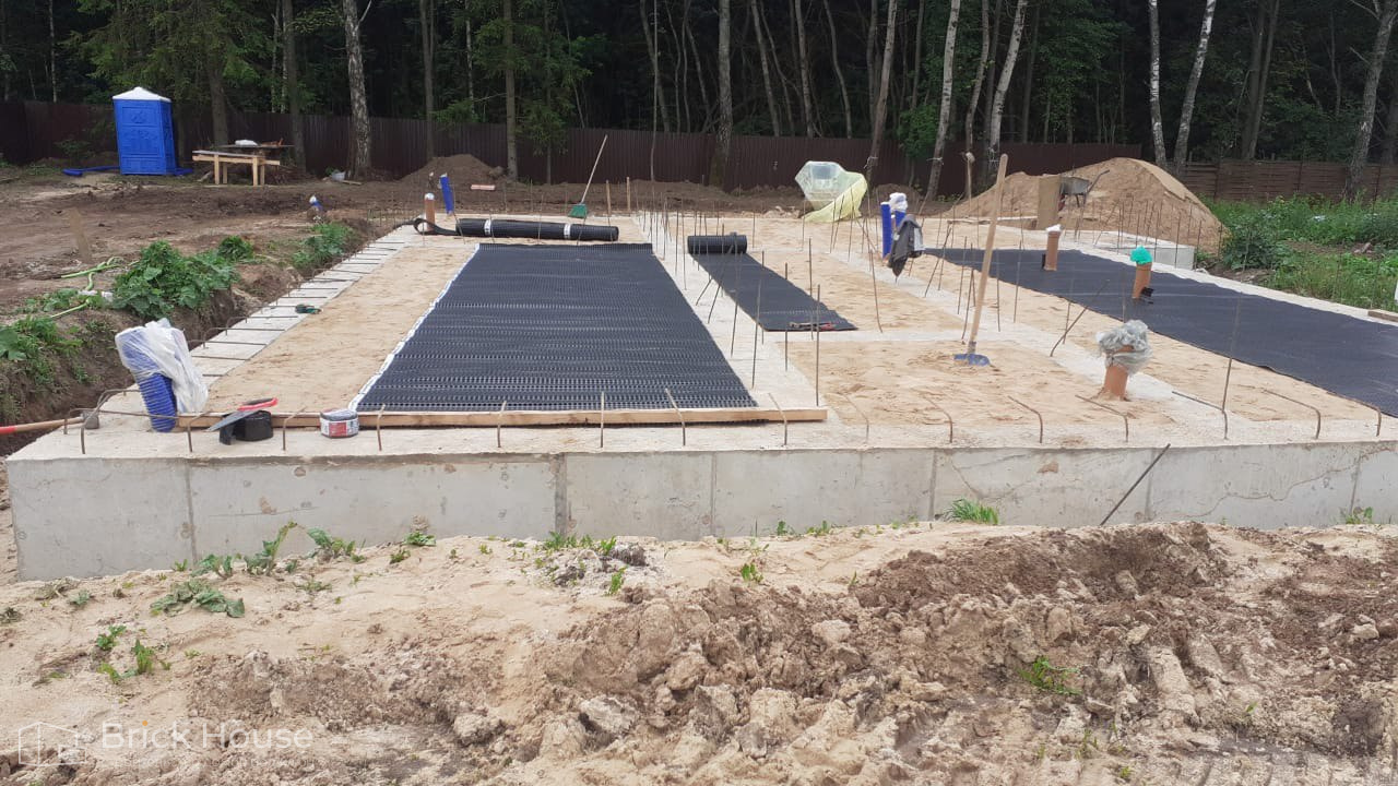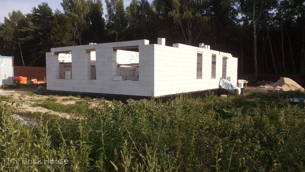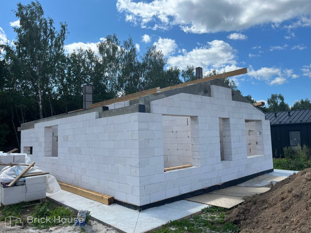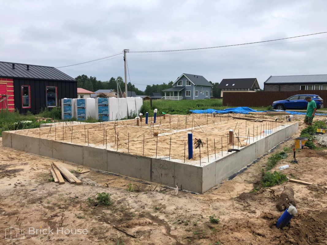 Наш первый объект, реализуемый по проекту K-100. Одноэтажный дом с кухней-гостиной, тремя спальнями, прихожей, гардеробной, двумя санузлами и бойлерной. На улице - 19-метровая терраса. Прекрасная альтернатива городской квартире. Тип фундамента на данном объекте - плита с ребрами жесткости. Стены из газобетонных блоков. Покрытие кровли - мягкая черепица. В отделке фасада использовали клинкерную плитку.