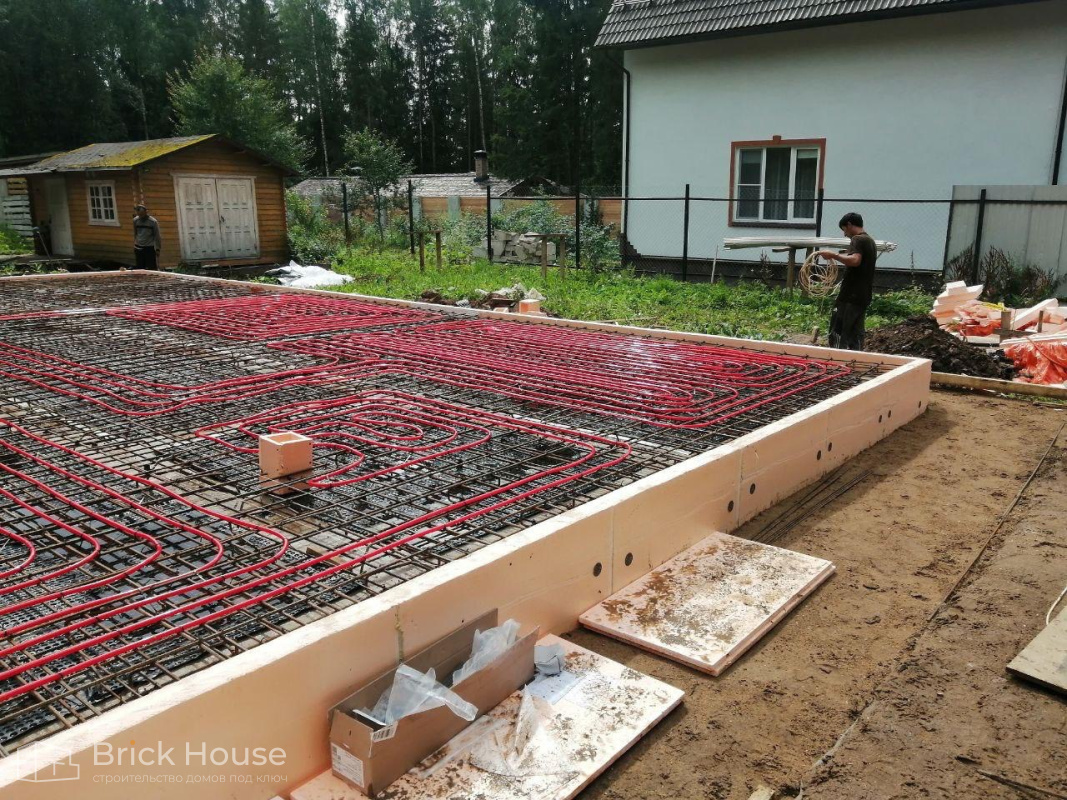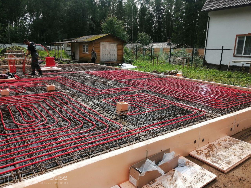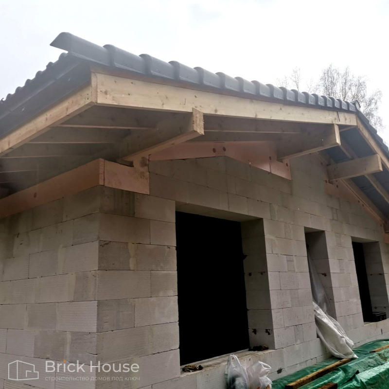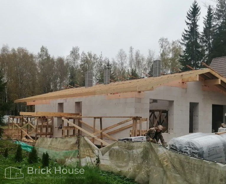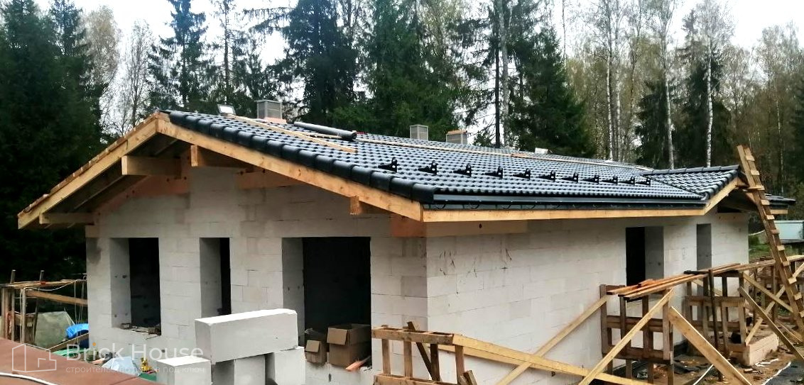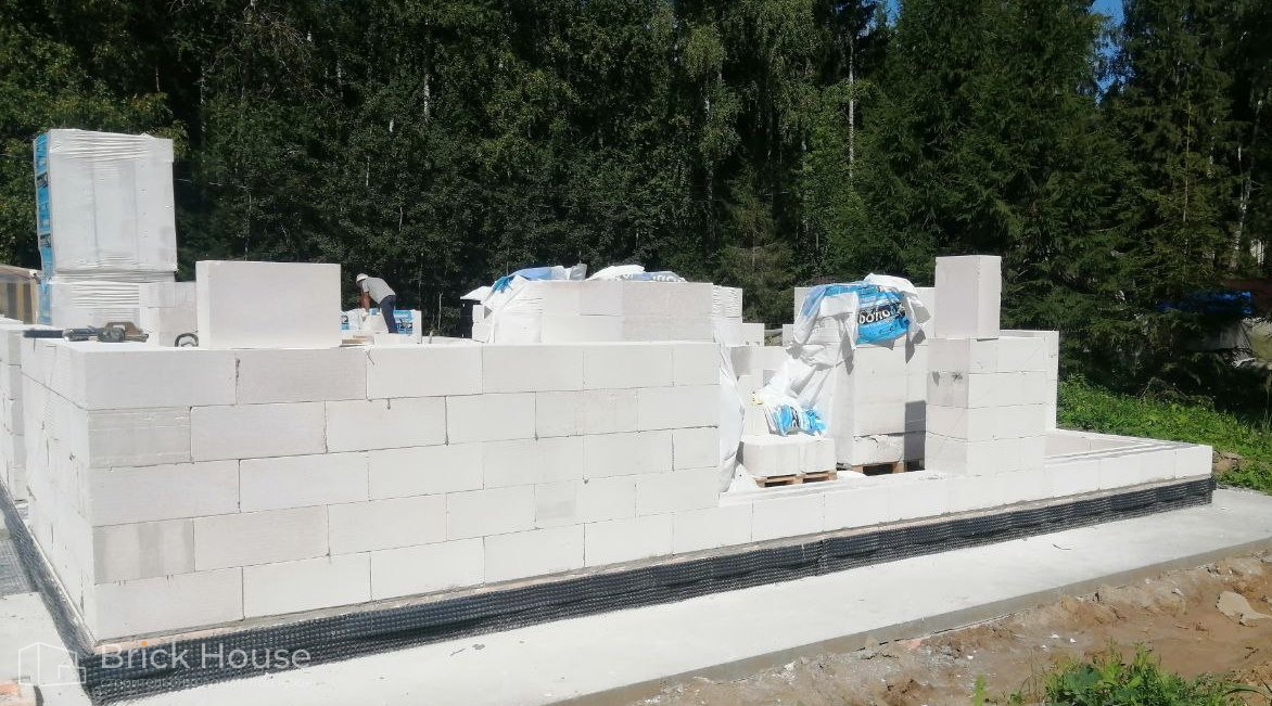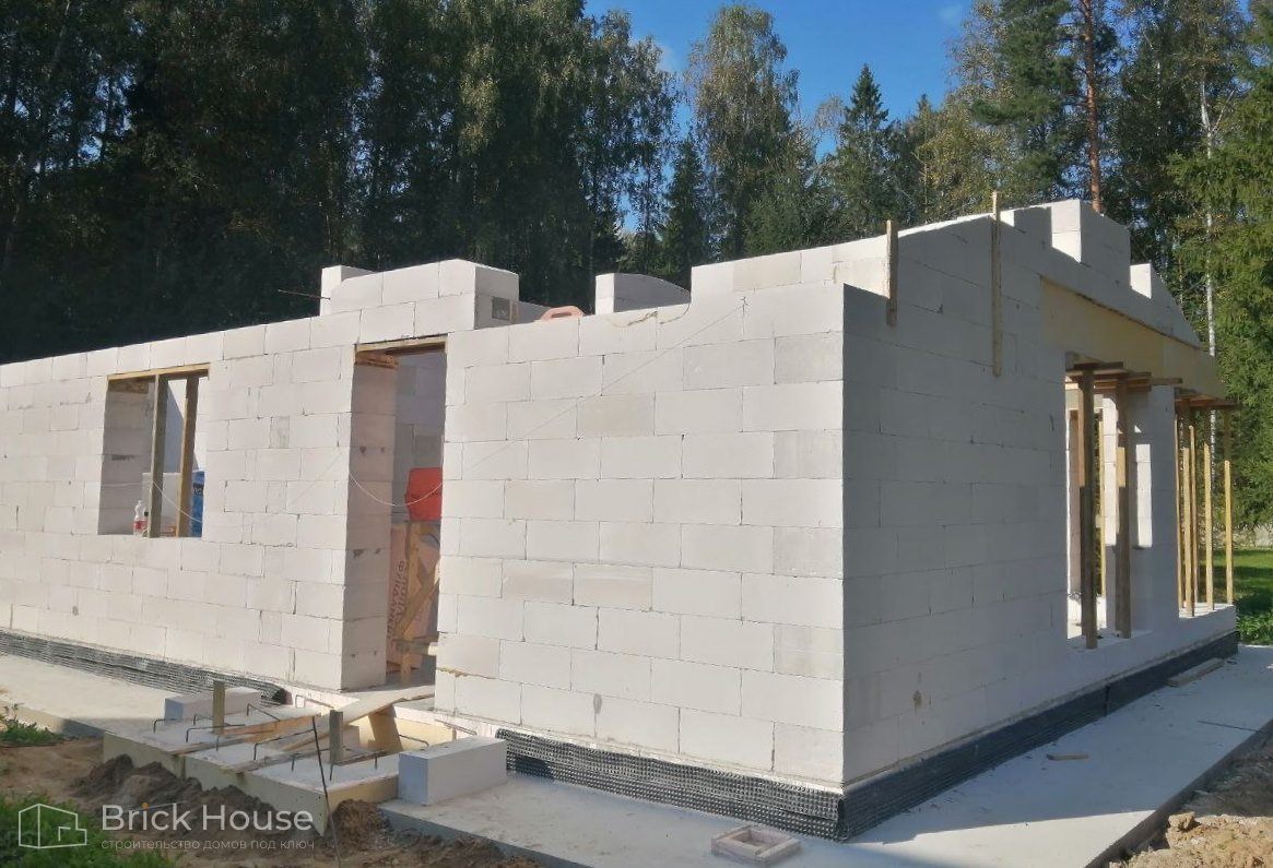 Второй объект, реализуемый по популярному среди наших заказчиков проекту K-100. В доме три спальни, кухня-гостиная, прихожая, гардеробная и бойлерная. Тип фундамента для данного объекта - монолитная плита, в которую сразу монтируется система «теплого пола». Стены возводим из газобетонных блоков. Покрытие кровли - мягкая черепица.