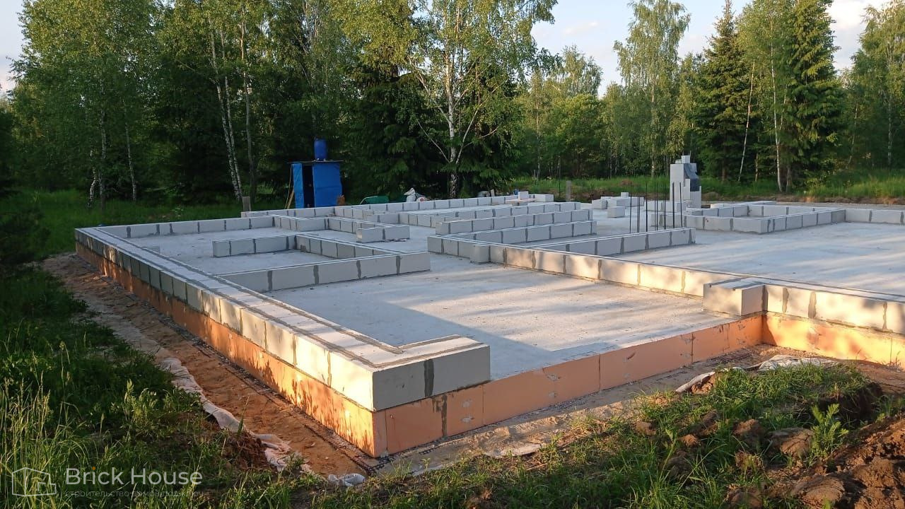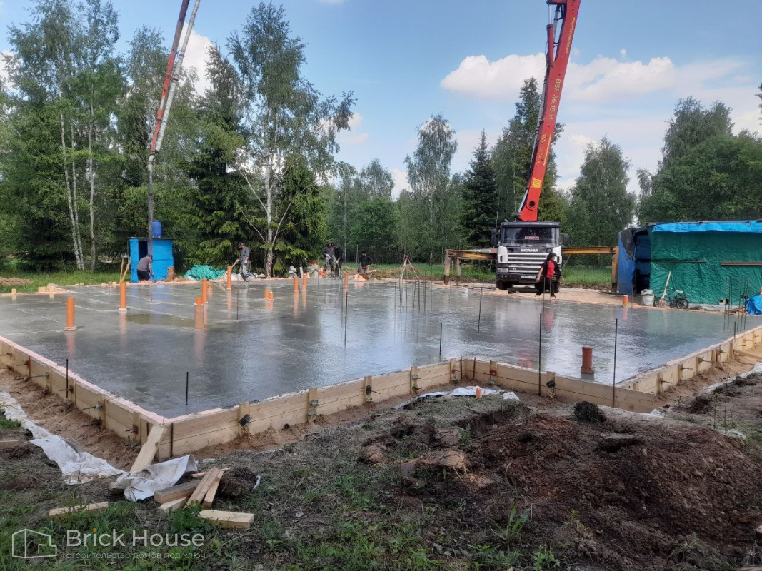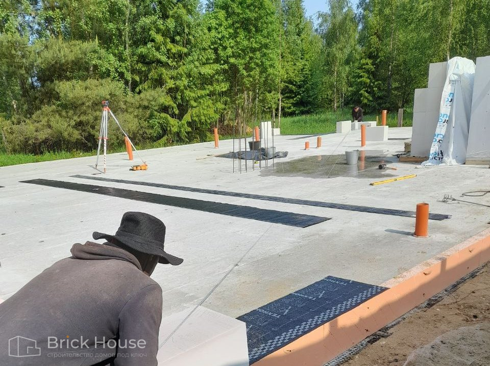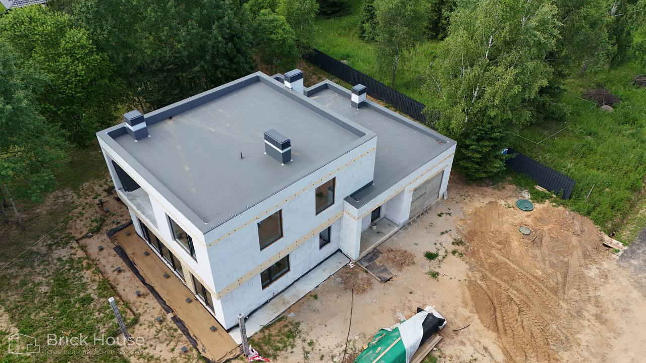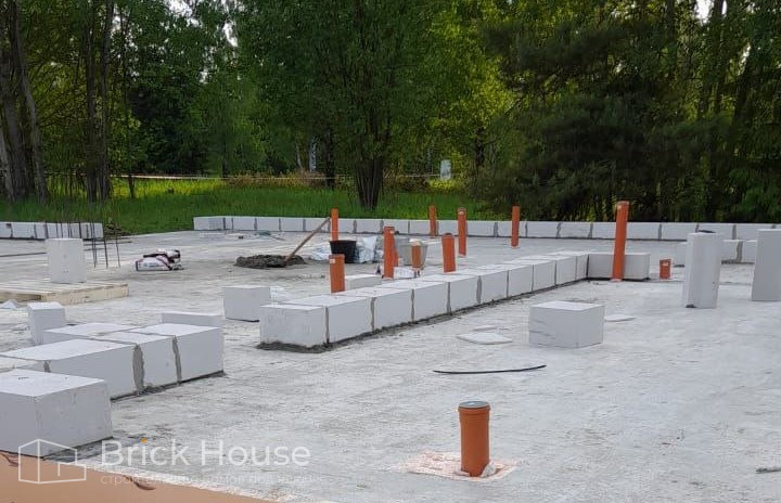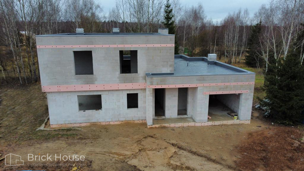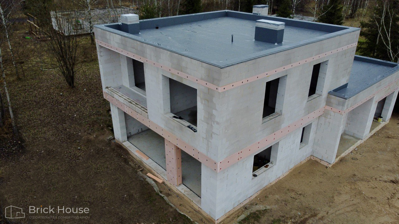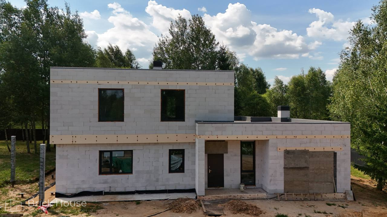 Дом в стиле хай-тек с брутальным фасадом под бетон строится в новом подмосковном поселке Лаки Плейс. Настолько новом, что этот дом будет в нем первым. Для основания дома был выбран тип фундамента монолитная плита. Стены - из газоблока.