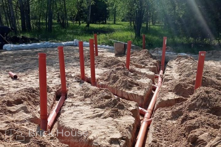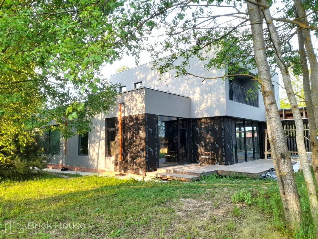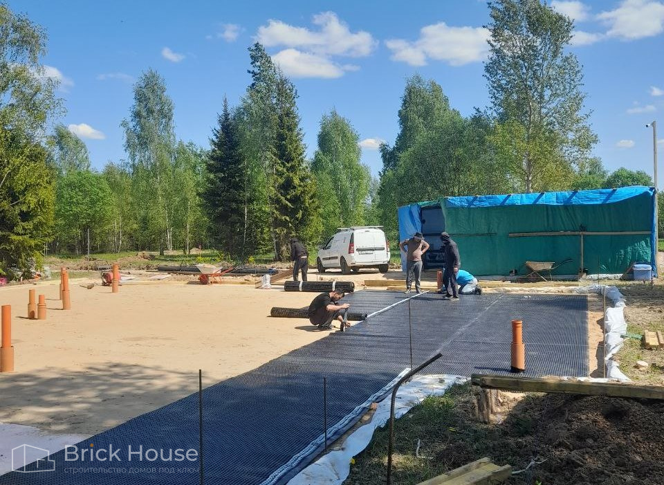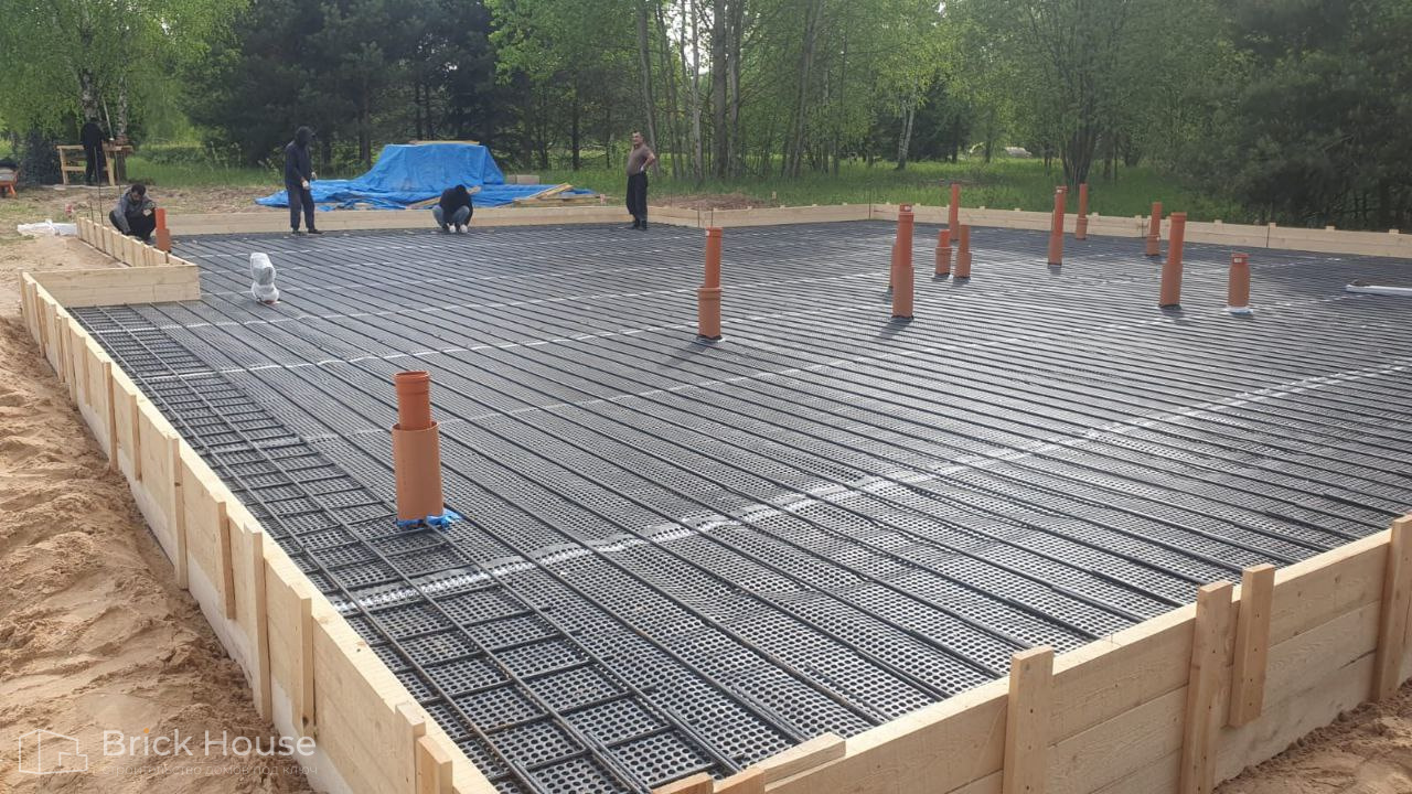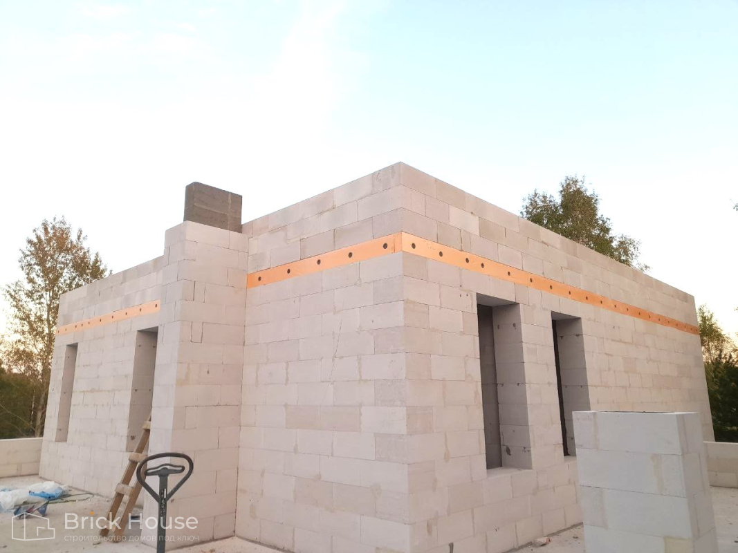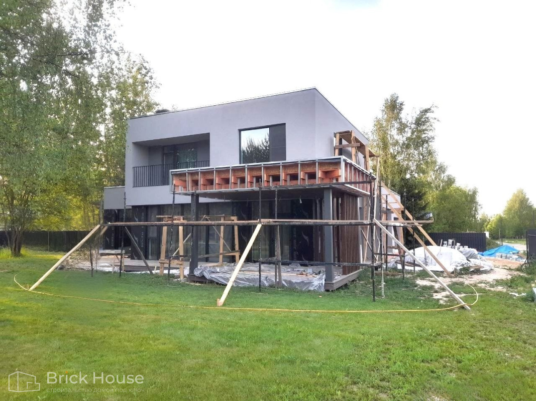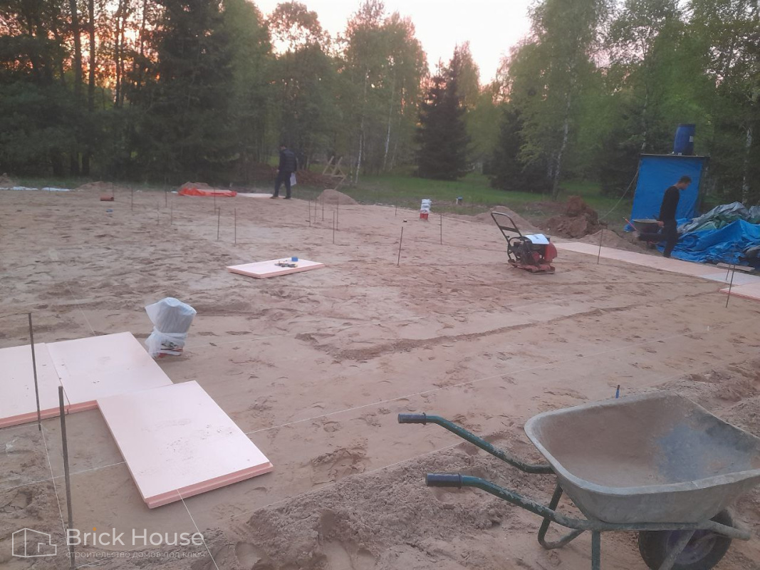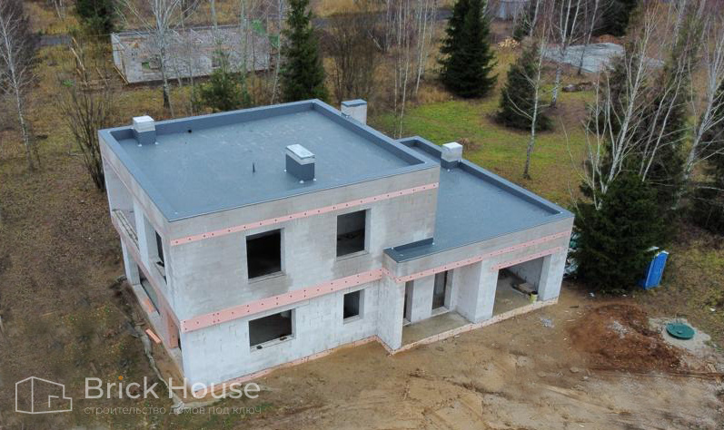 Дом в стиле хай-тек с брутальным фасадом под бетон строится в новом подмосковном поселке Лаки Плейс. Настолько новом, что этот дом будет в нем первым. Для основания дома был выбран тип фундамента монолитная плита. Стены - из газоблока.