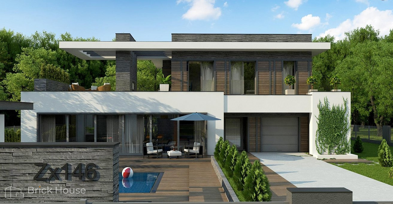 Для отделки фасада используют природный камень, кирпич, большие керамогранитные плиты, планкен (фасадный материал из термодревесины), а также их комбинации. Долговечность этих материалов обеспечивает длительную эксплуатацию без капремонта. Популярный элемент — это плоская крыша, на которой можно устраивать вечеринки, организовать террасу или целую оранжерею.